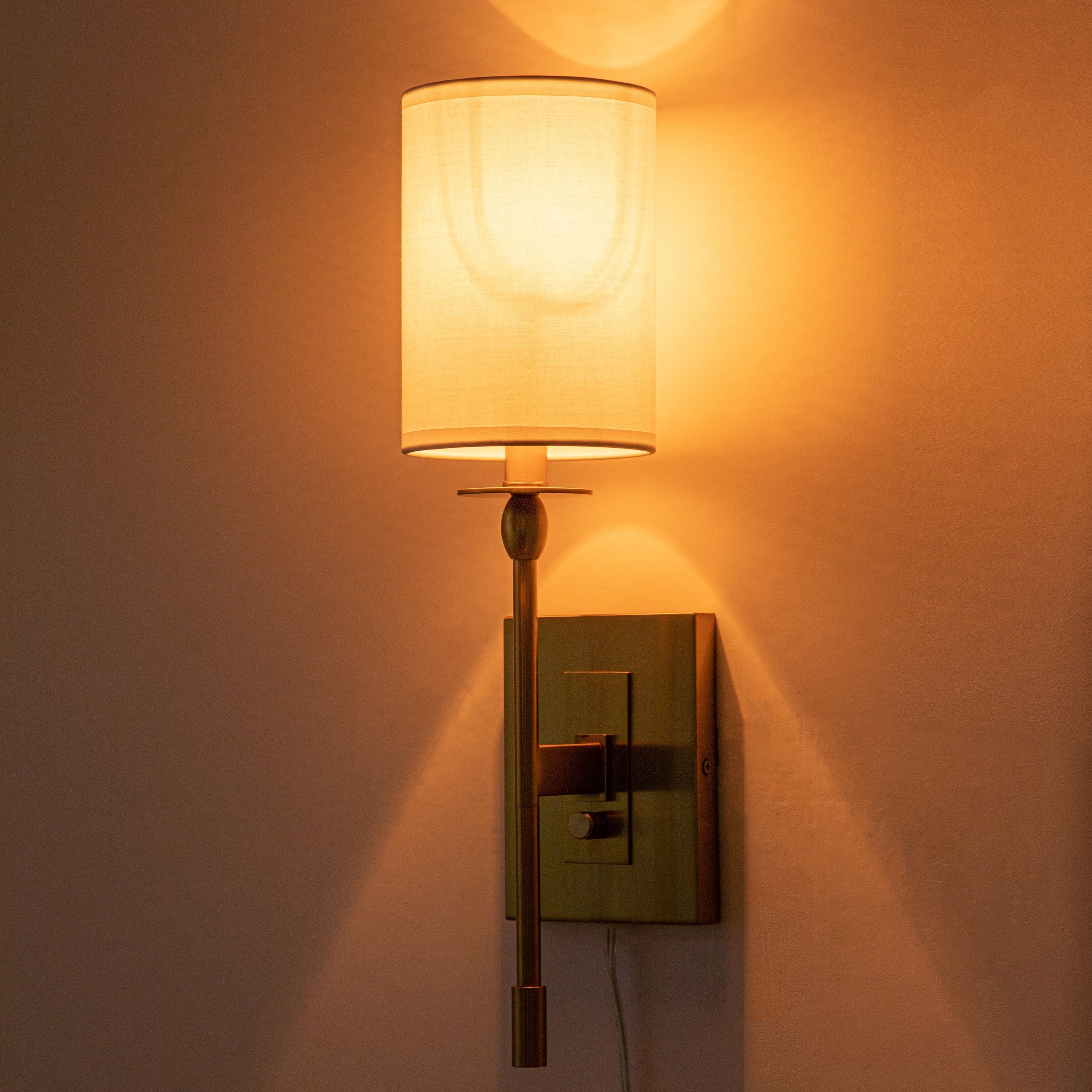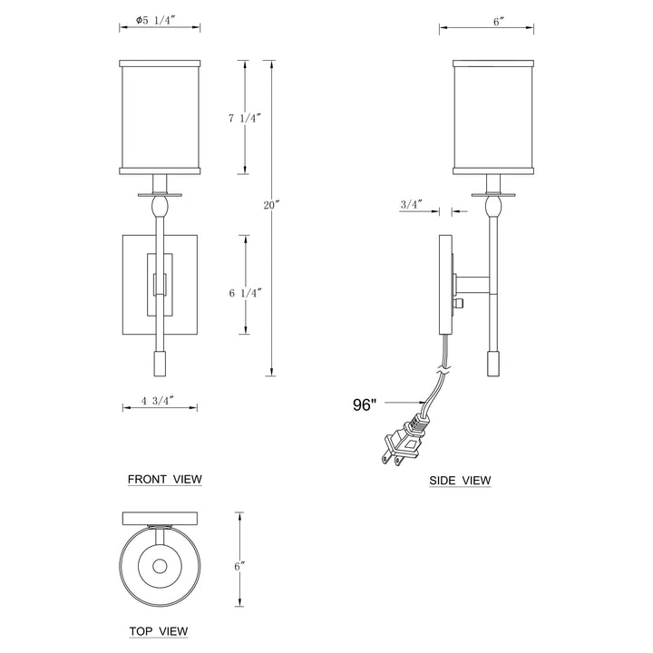 - Product Dimensions: The overall fixture is 20'' H x 5.25'' W x 6'' E, the fabric shade is 5.25'' D x 7.25'' h, the wall plate is 4.75' W x 6.25' H x 0.75'E, the length of plug in cord is 8ft.