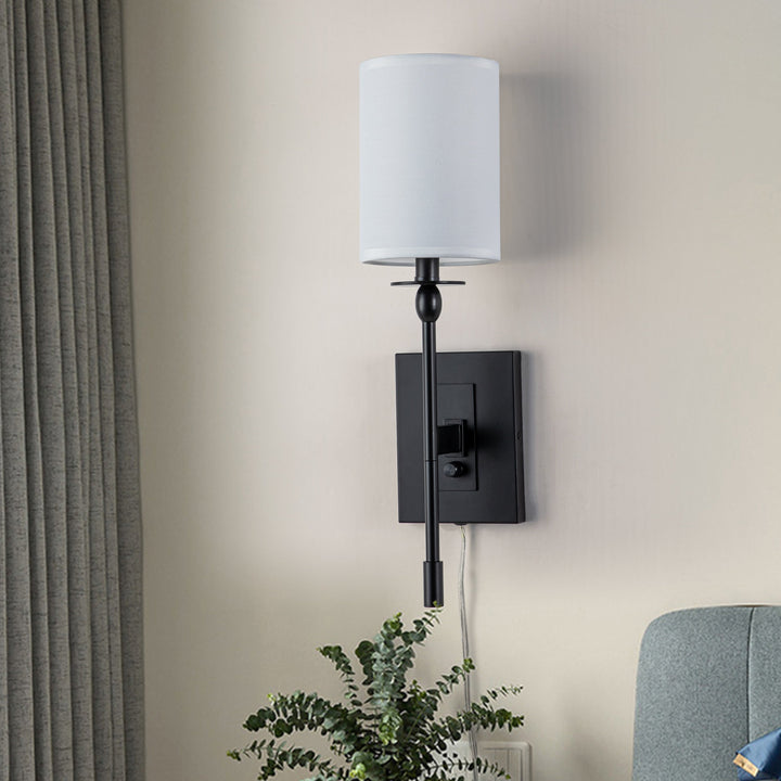 1-Light Matte Black Hardwired/Plug-in Dimmable Indoor Wall Sconce with Fabric Shade