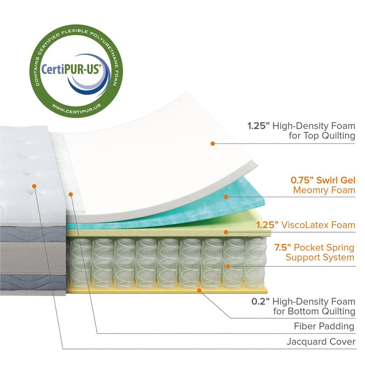 CONFORMING FOAM & POCKET SPRINGS - Layers of soft comfort foam, cooling swirl memory foam, supportive fusion foam and motion-isolating independent pocket springs provide customized pressure relief and rest that's cool and undisturbed