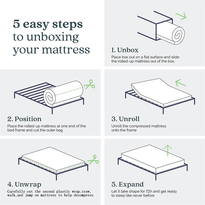 - Shipped in a box easy installation: All mattresses are compressed and packed into compact cartons for fast shipping. After receiving the mattress, you only need to do a few steps to get and enjoy this comfortable mattress(1. Open the carton. 2. Separate outer protective film. 3. Wait for 24-72 hours to enjoy a comfortable mattress.)