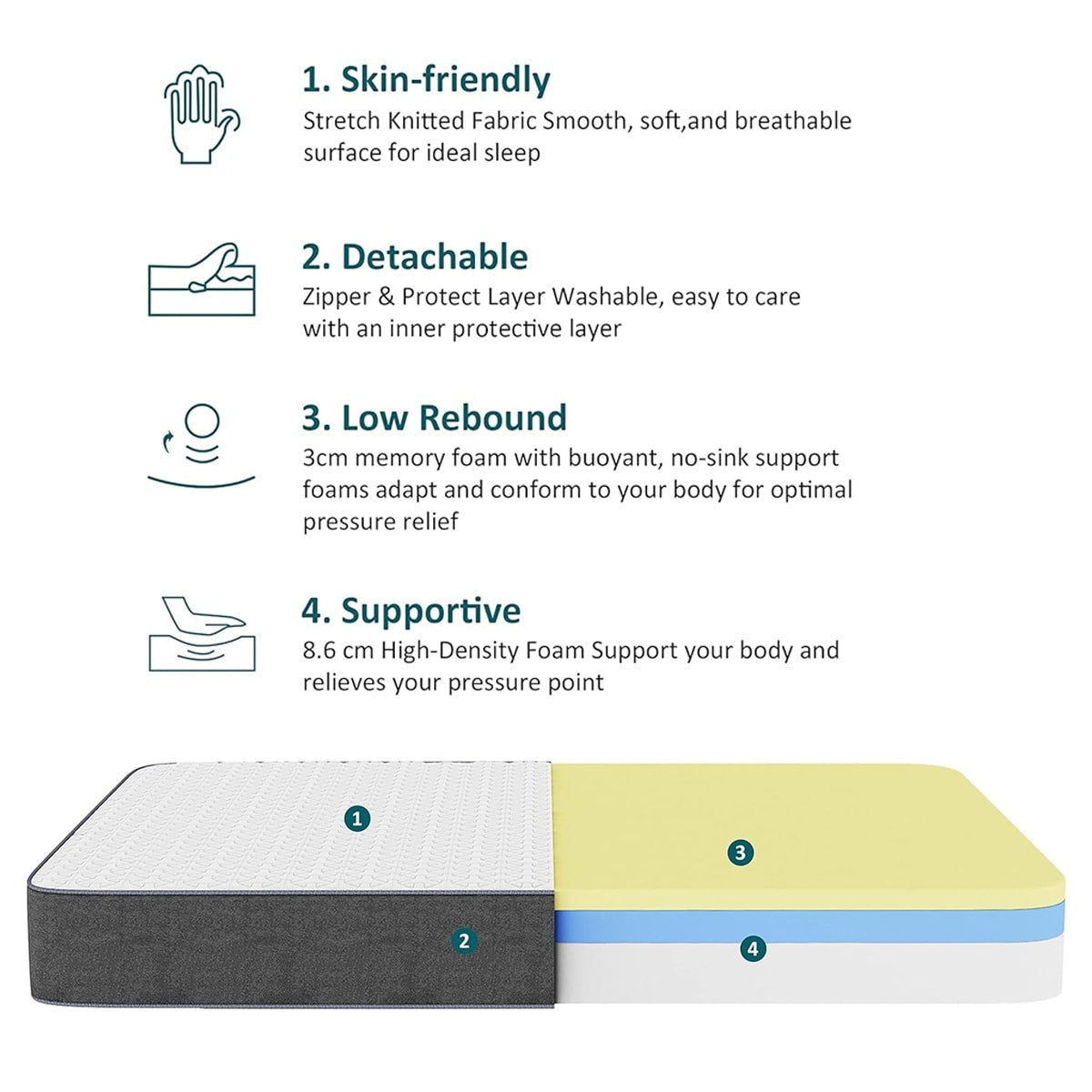 The mattress is designed with three layers of an all-foam system, improving support and heat dissipation. The mattress layers include 1 inches memory foam, 3.9 inches comfortable foam, and 5.1 inches of high-density base support foam for ultimate comfort for all kinds of sleepers for a better night's sleep, such as back sleepers, side sleepers and stomach sleepers.
