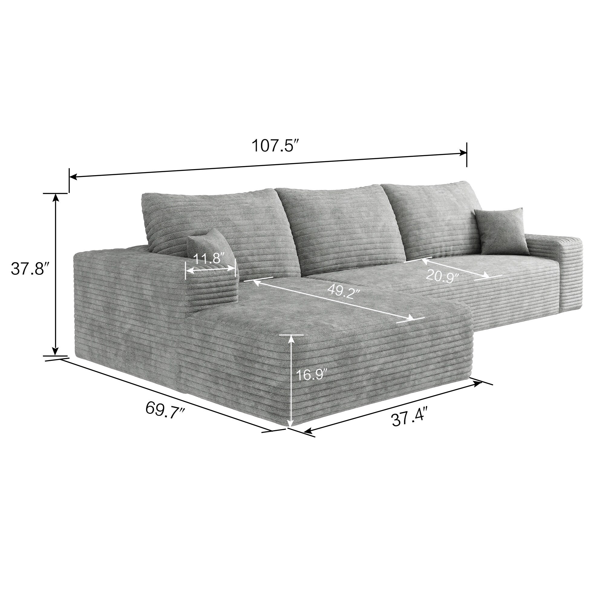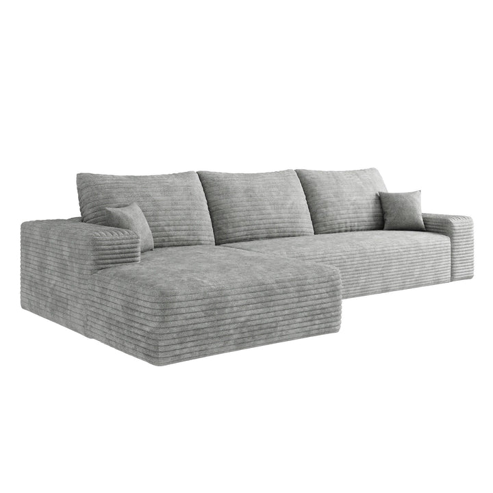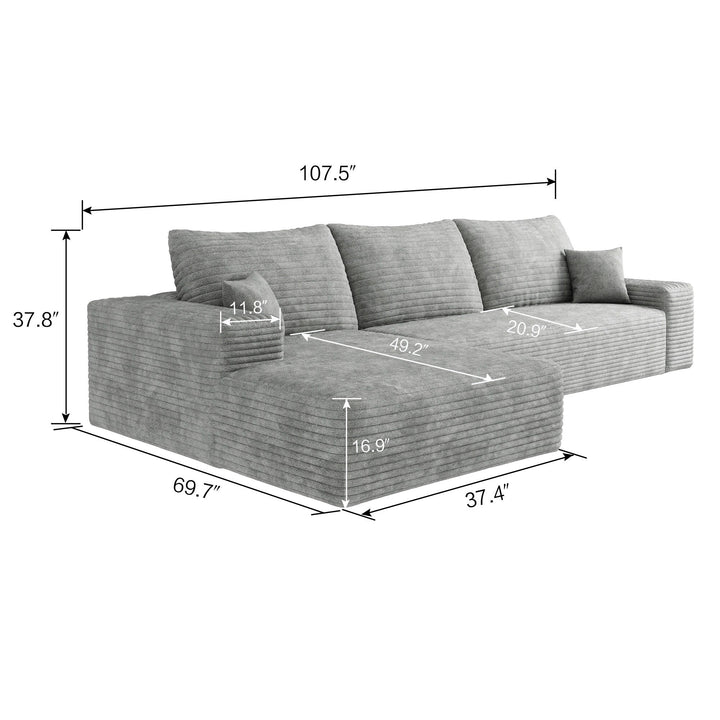- Enjoy effortless comfort with this 107-inch modular sectional sofa, wrapped in soft corduroy fabric and designed with deep seating and a relaxing chaise. Arriving fully assembled, it features a space-efficient L-shape and a plush, flexible layout ideal for living rooms, bedrooms, or apartments.
