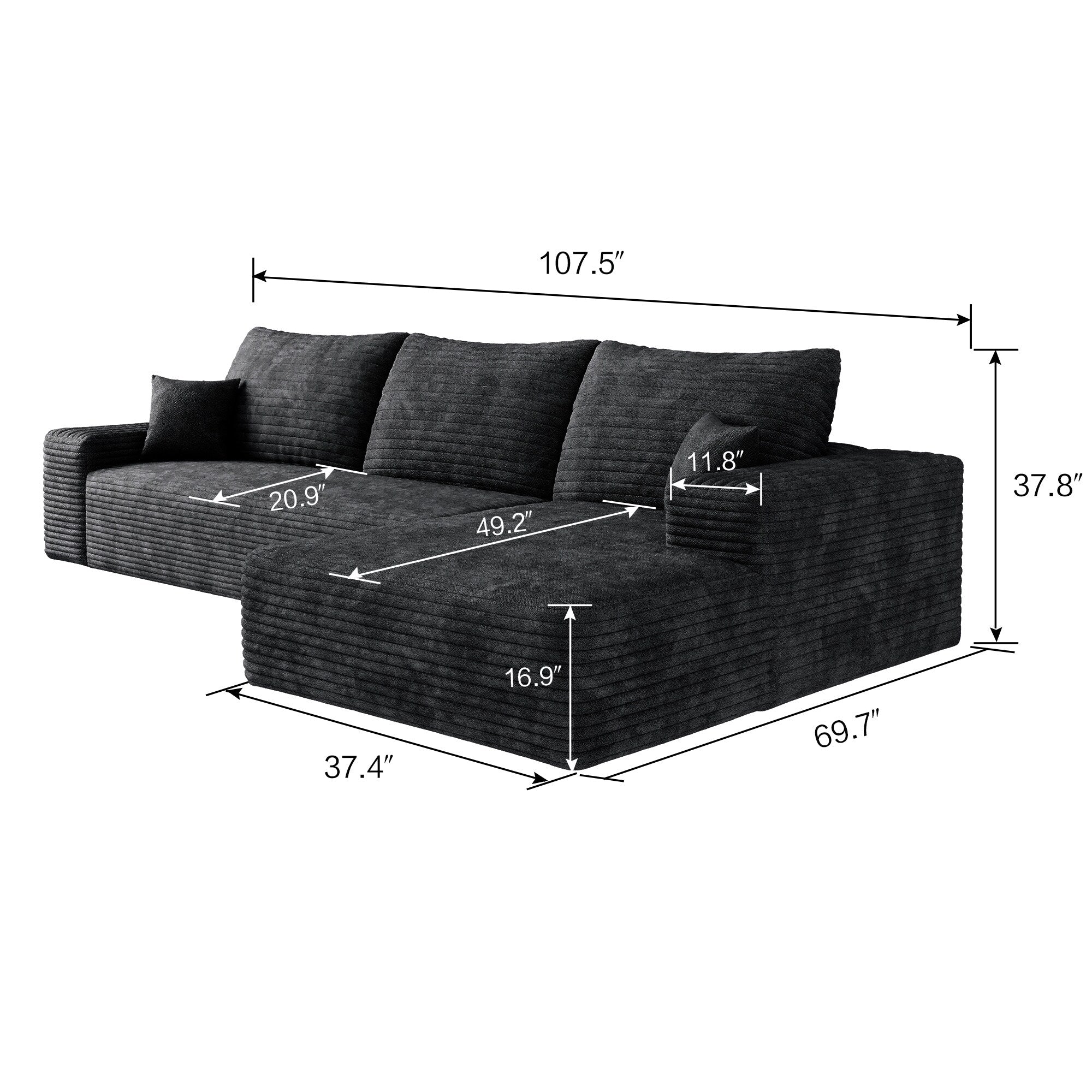 • Enjoy effortless comfort with this 107-inch modular sectional sofa, wrapped in soft corduroy fabric and designed with deep seating and a relaxing chaise. Arriving fully assembled, it features a space-efficient L-shape and a plush, flexible layout ideal for living rooms, bedrooms, or apartments.