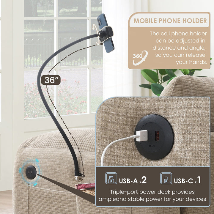 Phone Holder and Charger: The phone holder secures devices to prevent slipping into sofa gaps, and there is no need for separate holders. Armrest placement follows body mechanics. The chargers are built-in ports, which eliminate power strips and your battery anxiety.