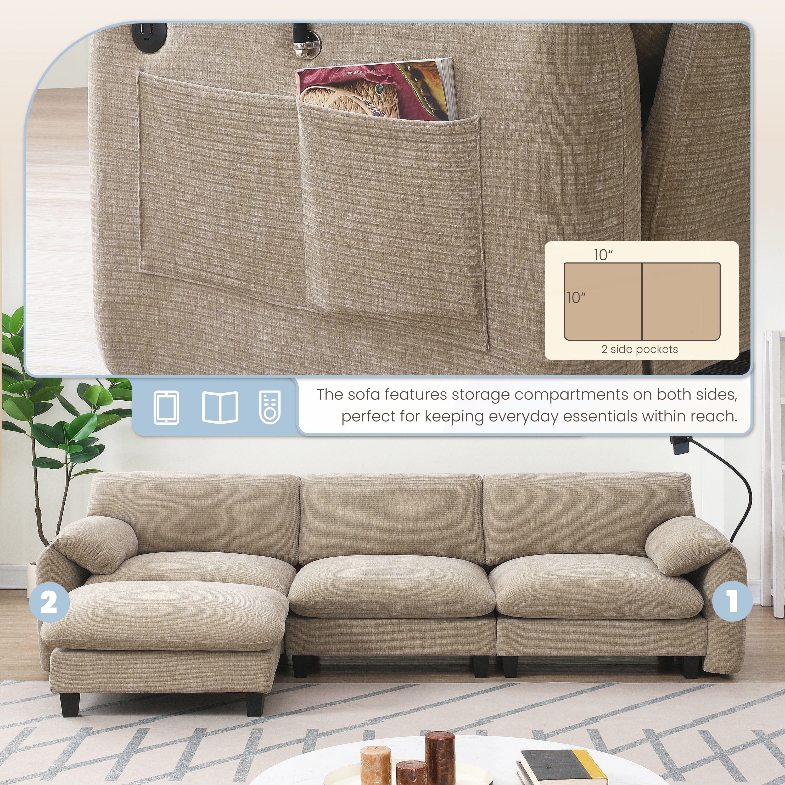 More Storage Space: Side storage pockets utilizes extra space on sofa sides without expansion. They give you quick access to the things you need while keeping living spaces tidy. Ideal for devices, reading materials, living essentials, etc.