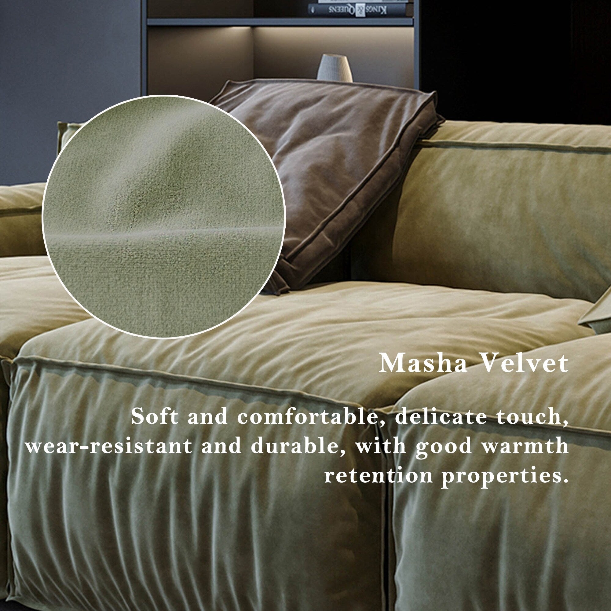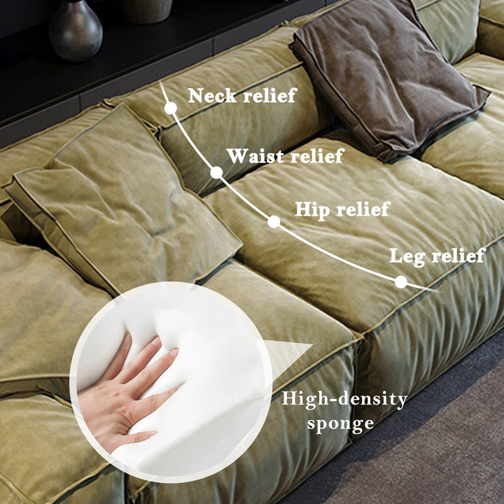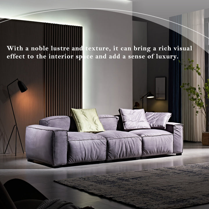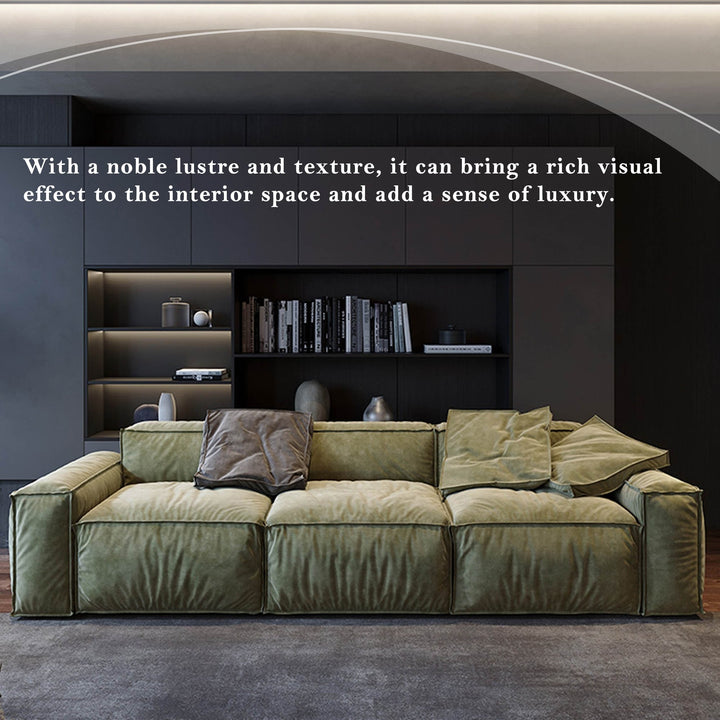 The sofa is made of soft suede material, showing a light green hue with a slight glossy feel, adding a warm and cosy atmosphere. Its overall design is simple and modern with smooth lines, showing a sense of low-key luxury. Its square shape and thick cushions give a sense of stability and comfort. The sofa consists of several independent cushions, each with clear stitching on the edges, adding a sense of dimension and hierarchy. The backrest and armrests are also square in design, in keeping with the overall style. Two coloured cushions are included with the sofa, adding to the overall comfort and visual richness of the sofa.