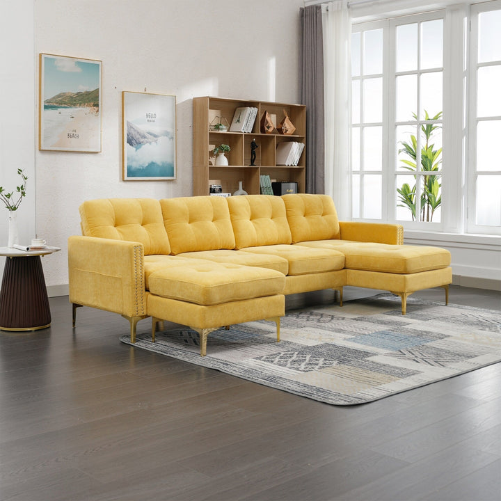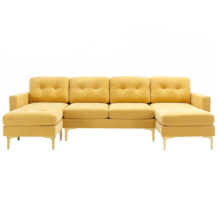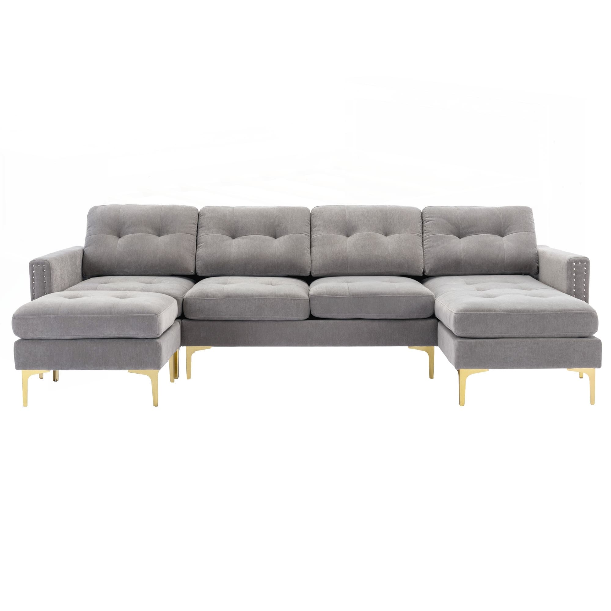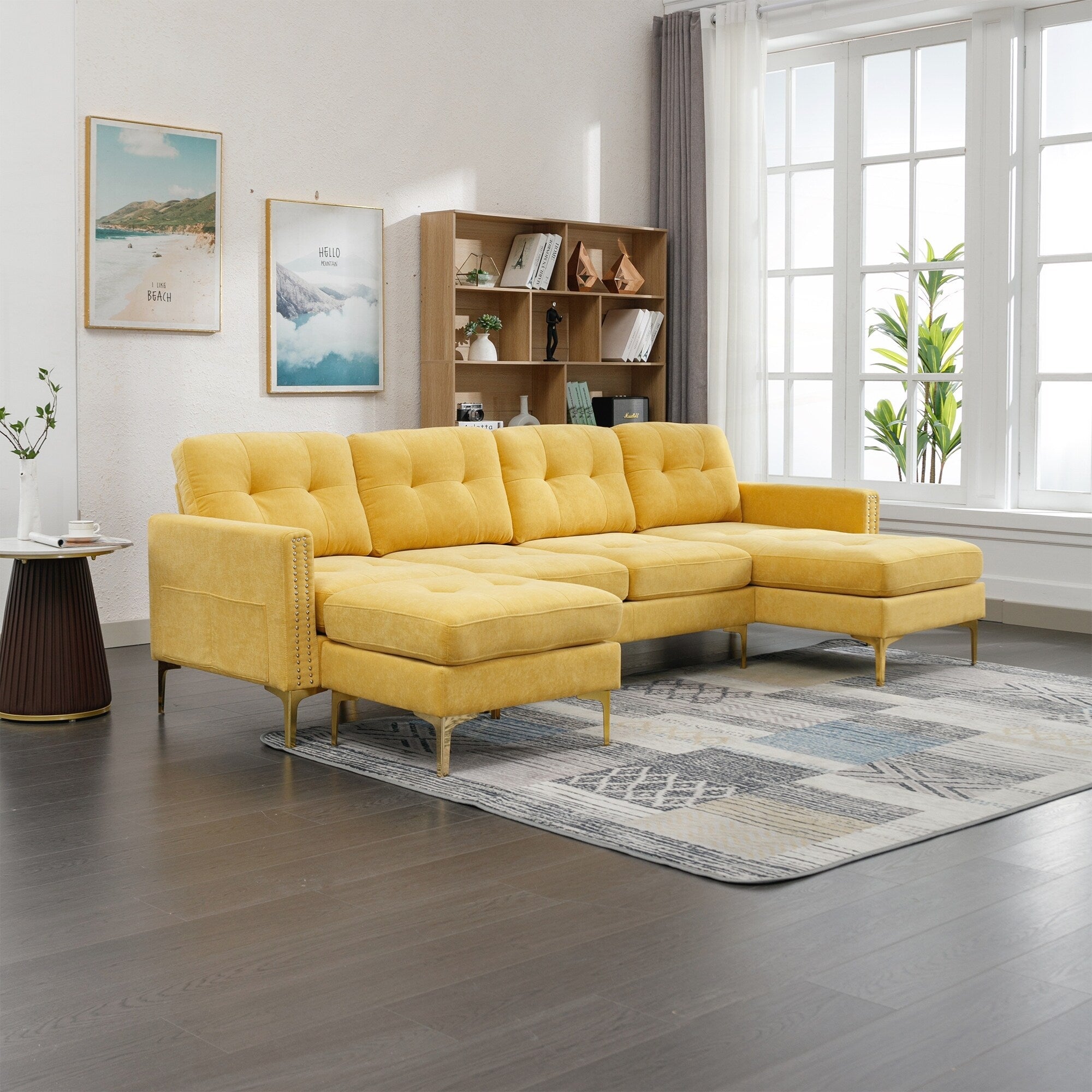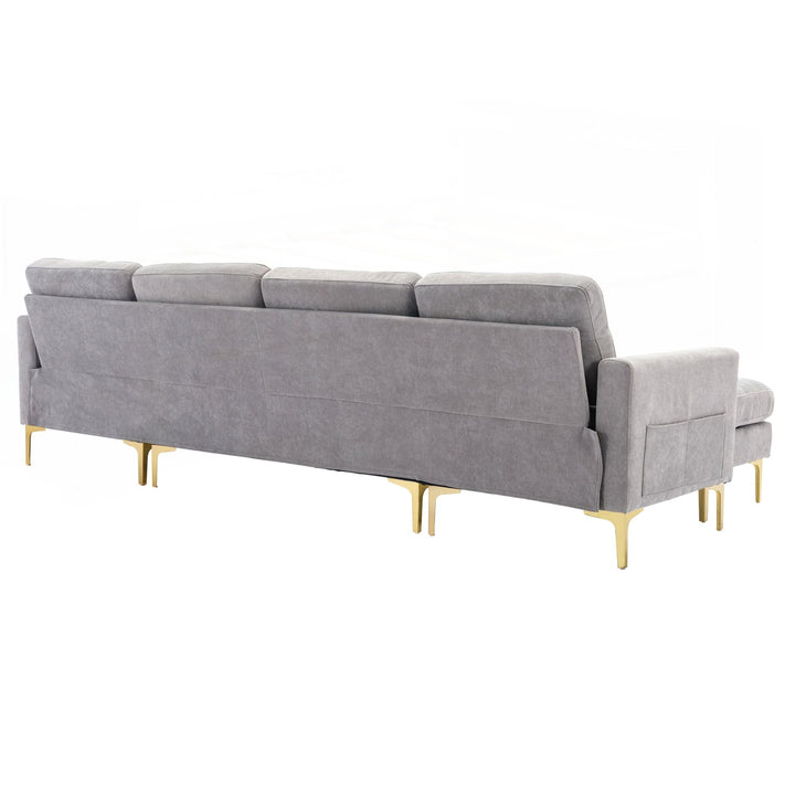 Durable and Sturdy - Our sectional sofa is built on a solid plywood frame with high-density foam and embedded springs, offering exceptional comfort and support for hours of relaxation and lounging. It is constructed to withstand daily use and retain their shape and comfort for years to come. Golden metal legs perfectly support the entire sofa and can be used for many years to come.