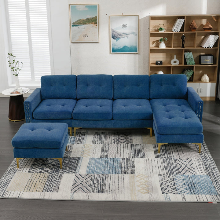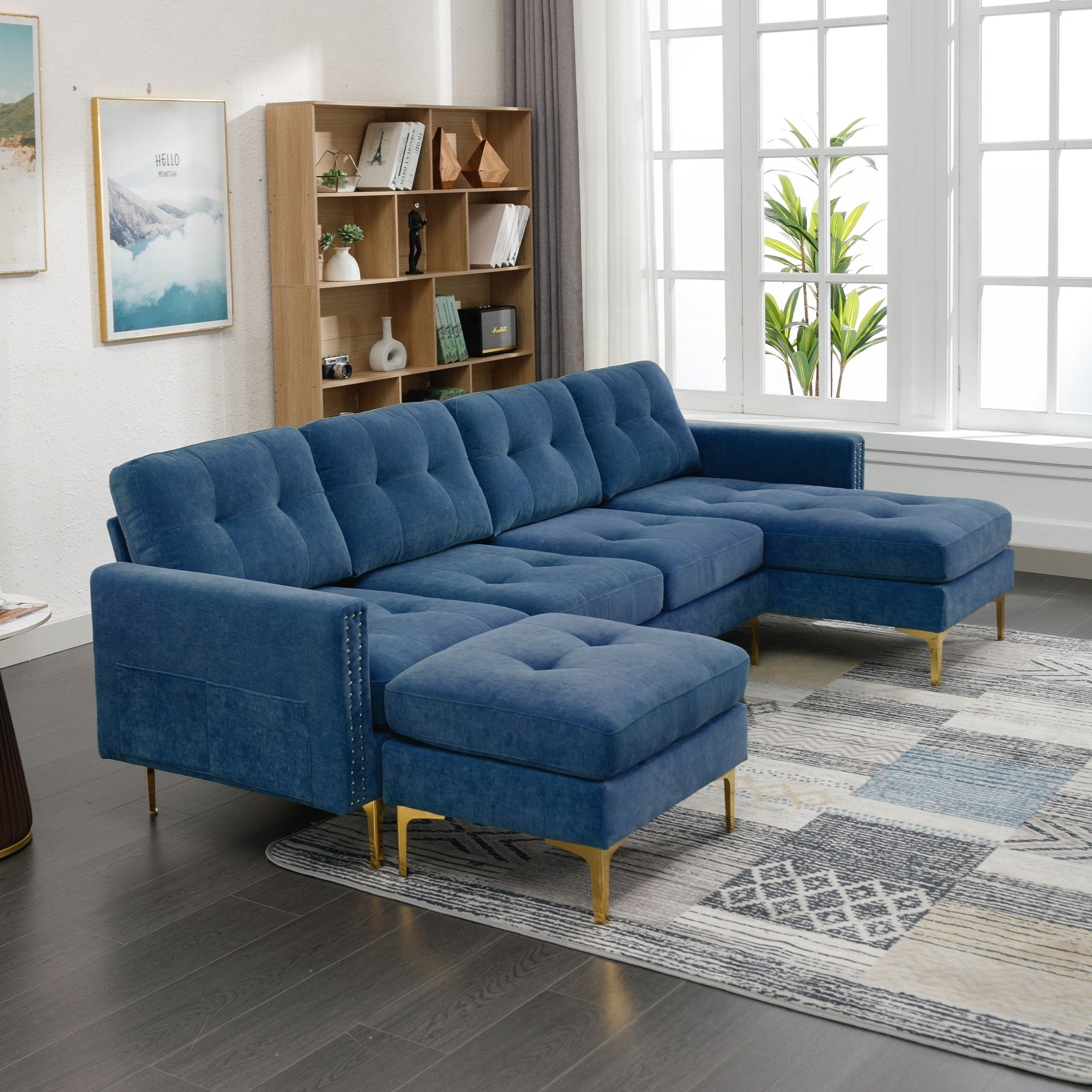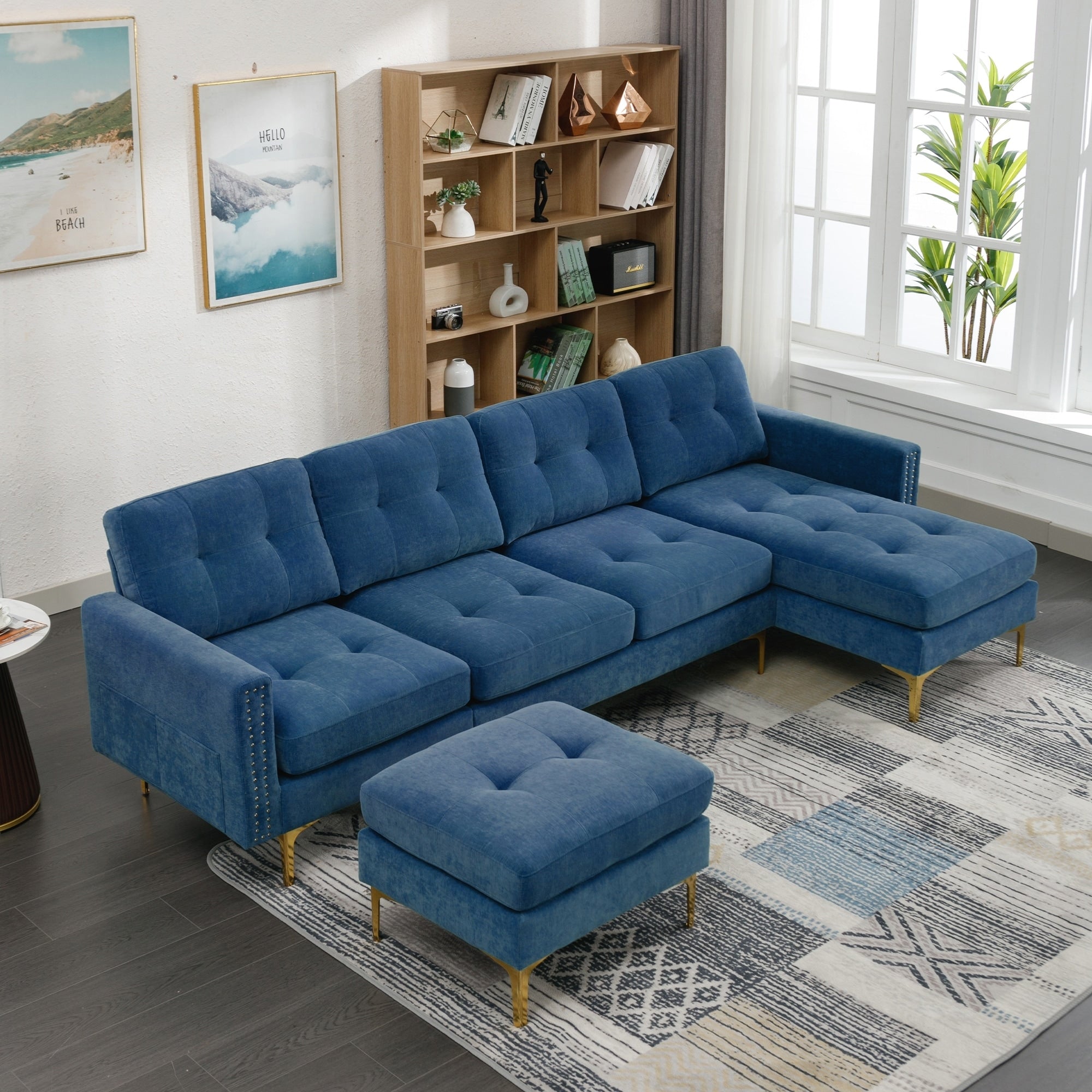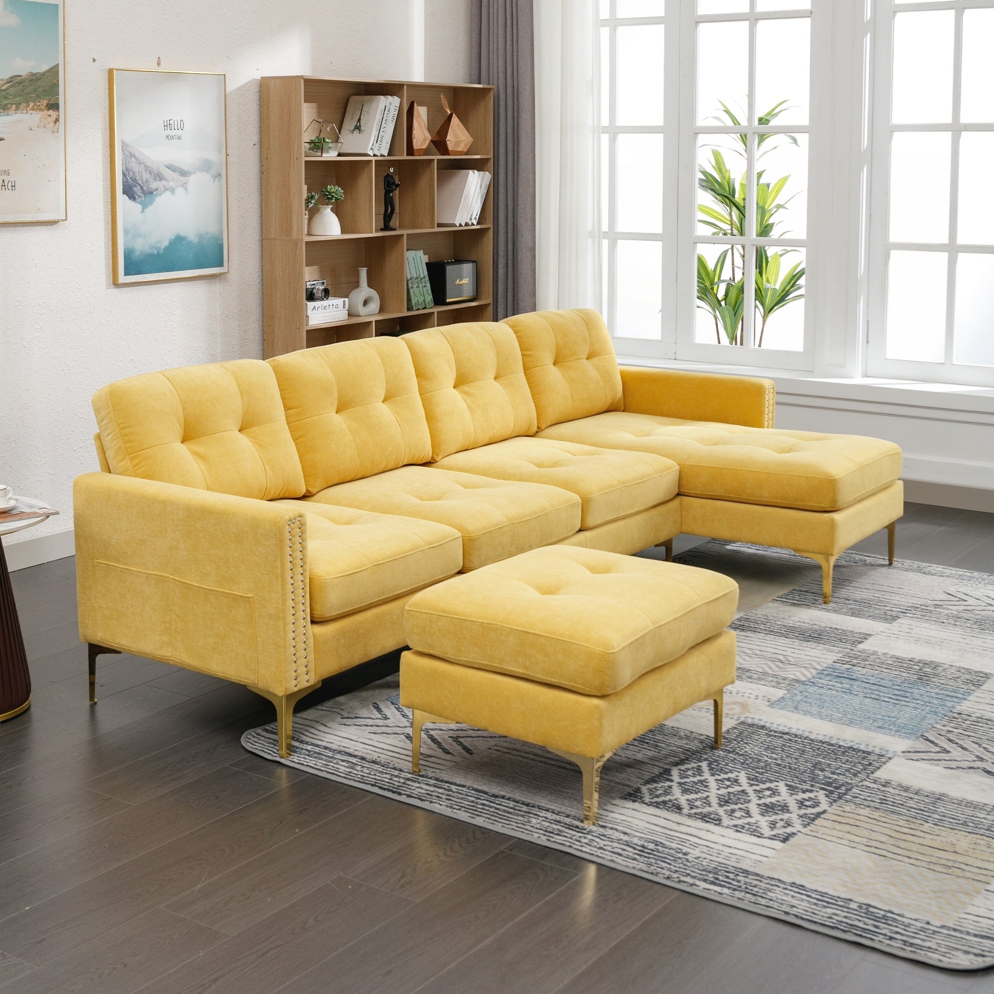 Durable and Sturdy - Our sectional sofa is built on a solid plywood frame with high-density foam and embedded springs, offering exceptional comfort and support for hours of relaxation and lounging. It is constructed to withstand daily use and retain their shape and comfort for years to come. Golden metal legs perfectly support the entire sofa and can be used for many years to come.