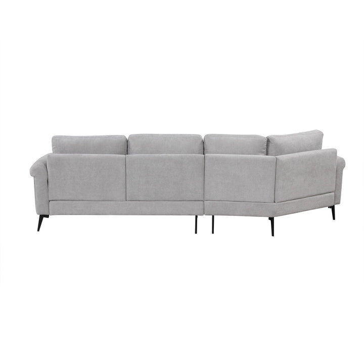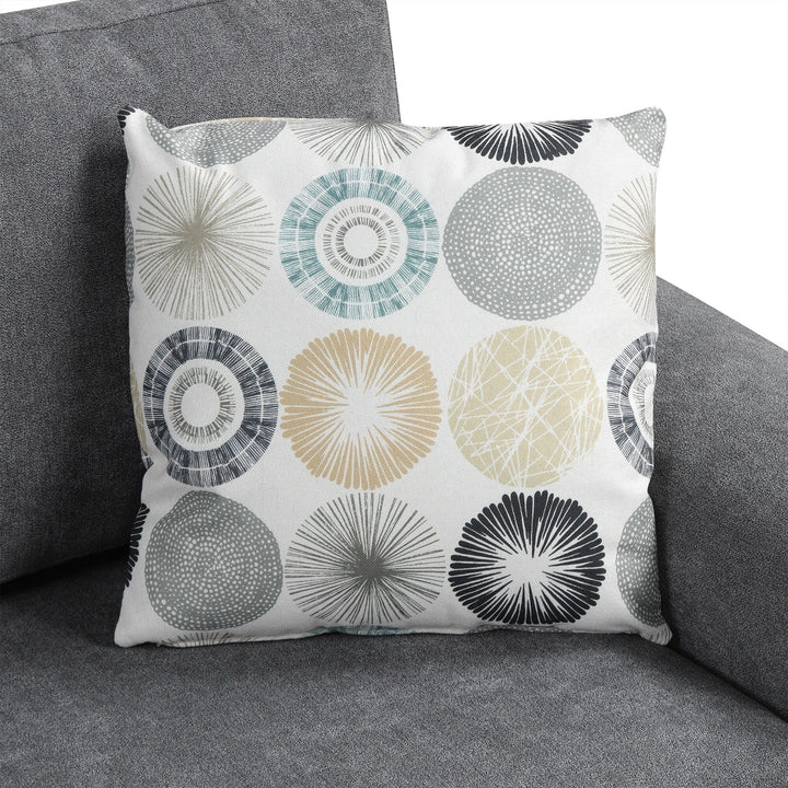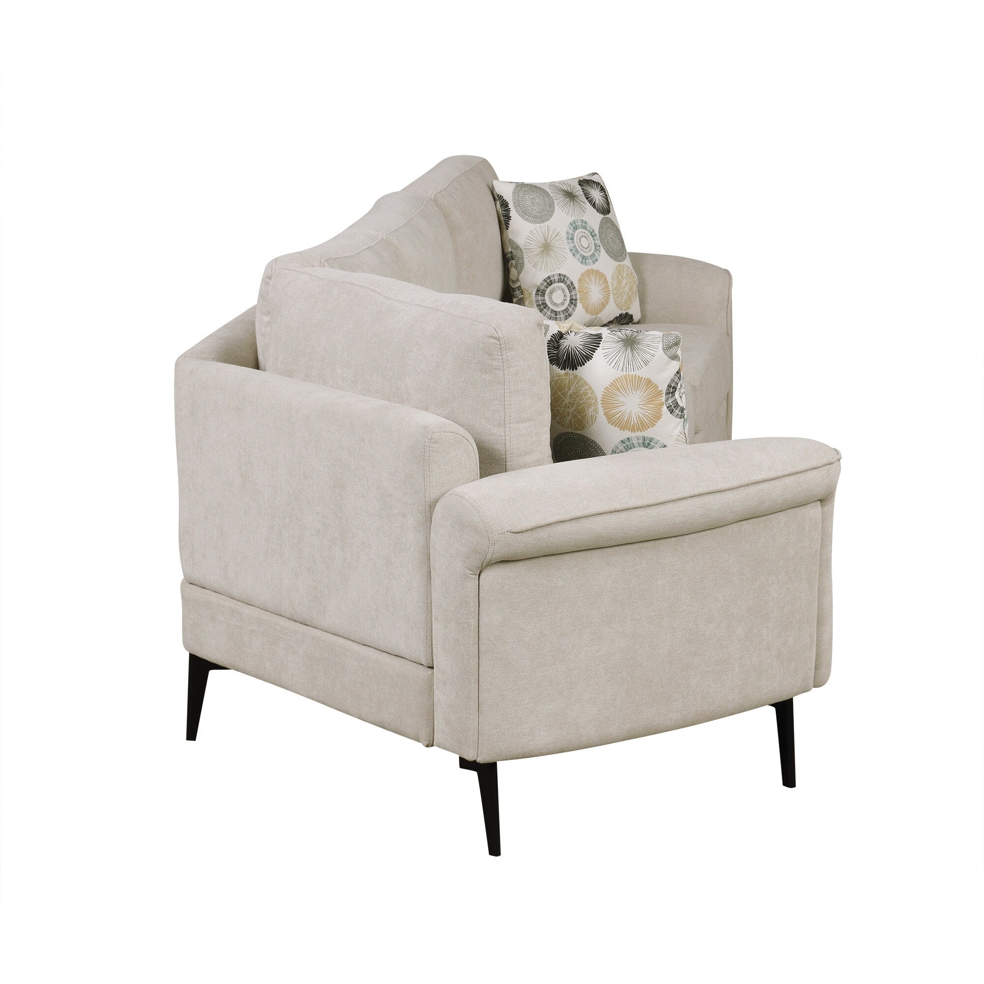 - The smooth arc silhouette, paired with sleek metal legs and removable printed pillows, brings modern sophistication and relaxed style to any room.