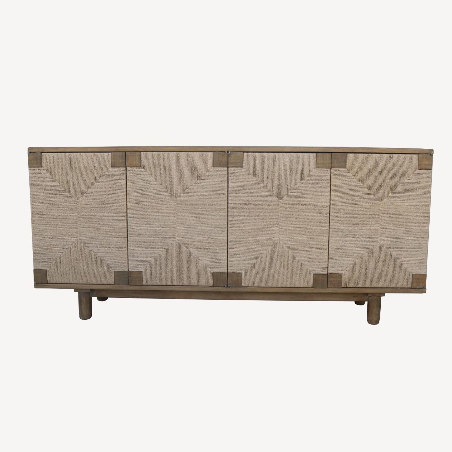 Hand-crafted from reclaimed pine and finished in antiqued natural. Rattan door panels. Imported