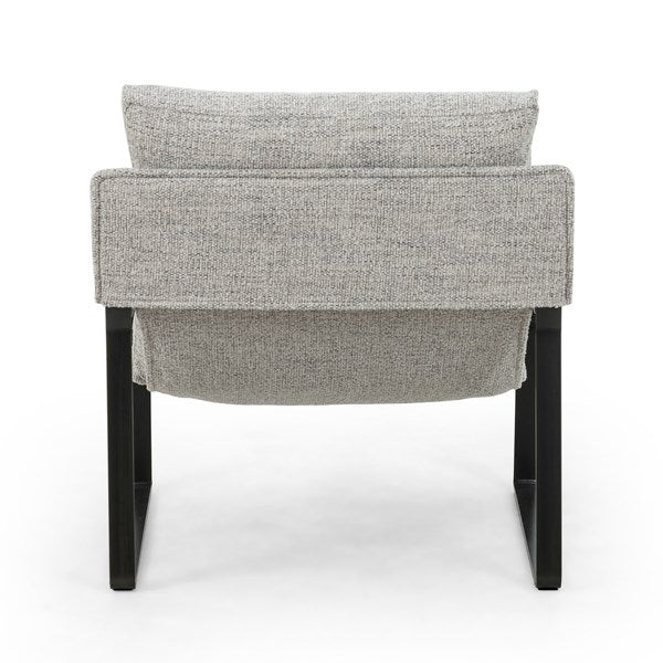 This stylish sling chair sits on an open industrial gunmetal frame. The low curved seat creates a surprisingly comfortable position. Upholstered in a heavily texturedoatmeal fabric. Imported