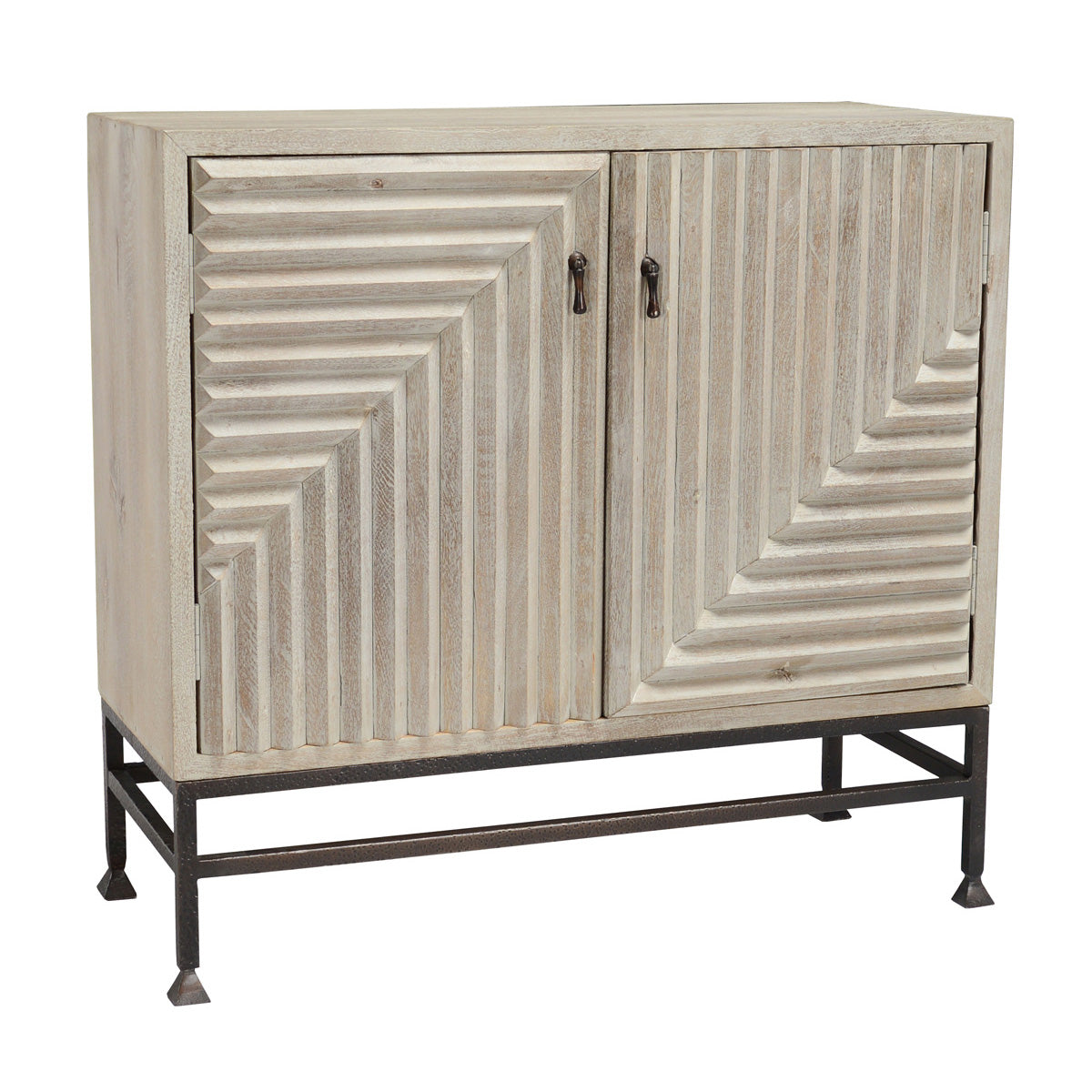 Crafted from reclaimed mango and finished in a smooth and consistent white wash. Precision cut doors provide a geometric contemporary appeal and a solid cast iron base completes the look. Includes fixed shelf. Imported
