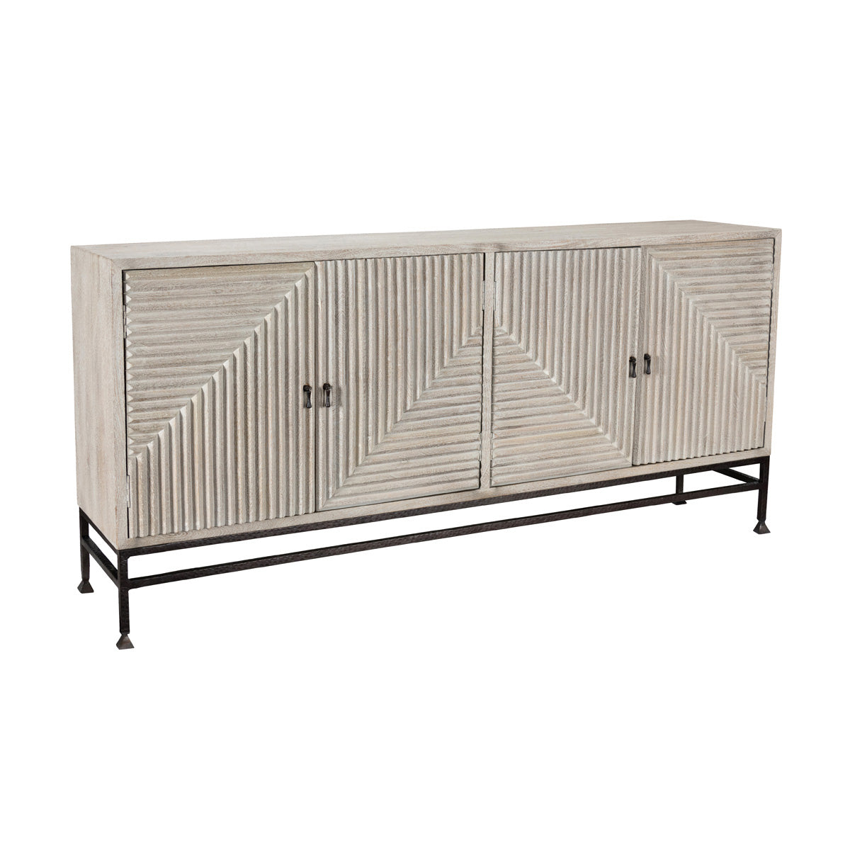 Crafted from reclaimed mango and finished in a smooth and consistent white wash. Precision cut doors provide a geometric contemporary appeal and a solid cast iron base completes the look. Includes two fixed shelves and cord escapes for media wiring. Imported
