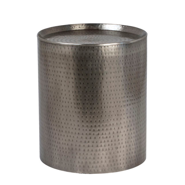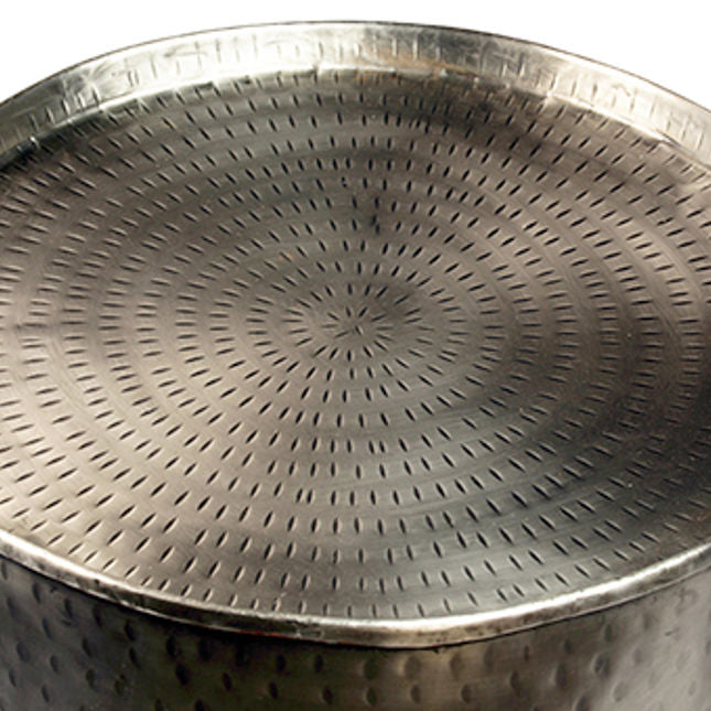 Wrought iron hammered drum end table in an antique nickel finish. Made in India