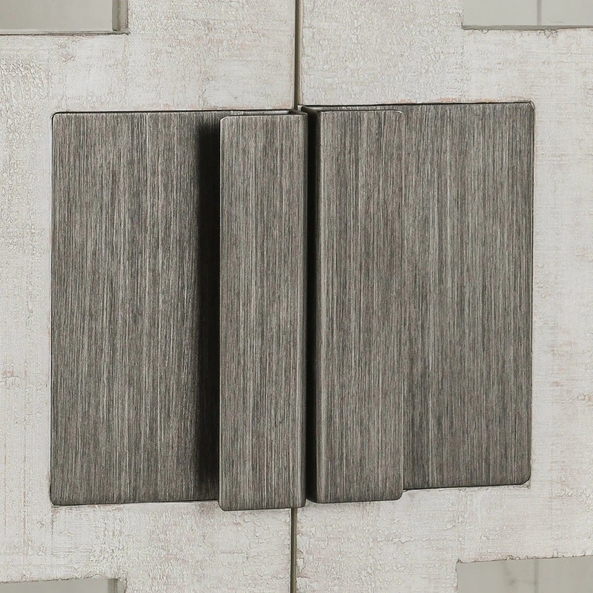 Crafted from sustainably harvested, reclaimed pine. The Larson 4-door cabinet combines elegant, contemporary lines with a distressed ivory finish. This cabinet offers abundant space to display your treasured collections. Imported