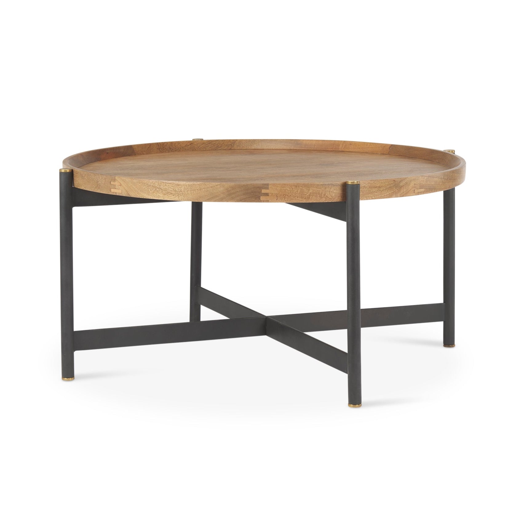 The Mark Coffee Table comes in two sizes and features a circular tray-style tabletop made from solid wood on a sturdy iron frame with gold color metal end caps. Imported