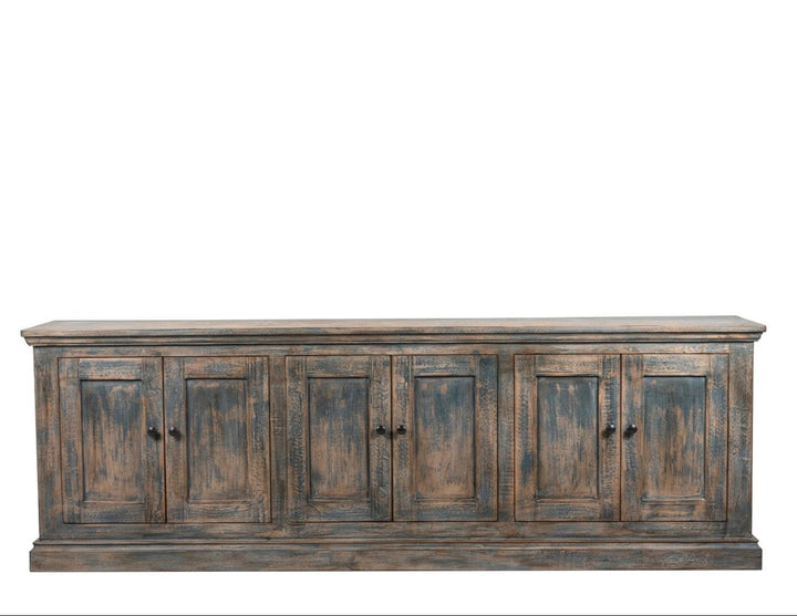 Hand-crafted from antique salvaged pine doors. Each cabinet is individually hand-finished in an antiqued blue finish to create a genuine time-worn appearance. Imported