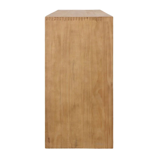 Crafted from solid reclaimed pine with a natural finish. Black cast iron handles and high quality soft-close hinges. Imported