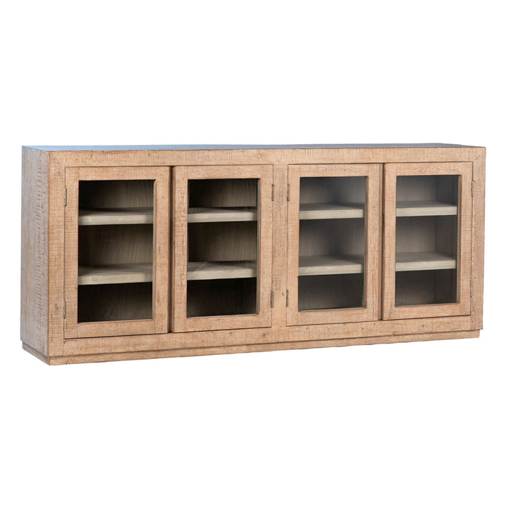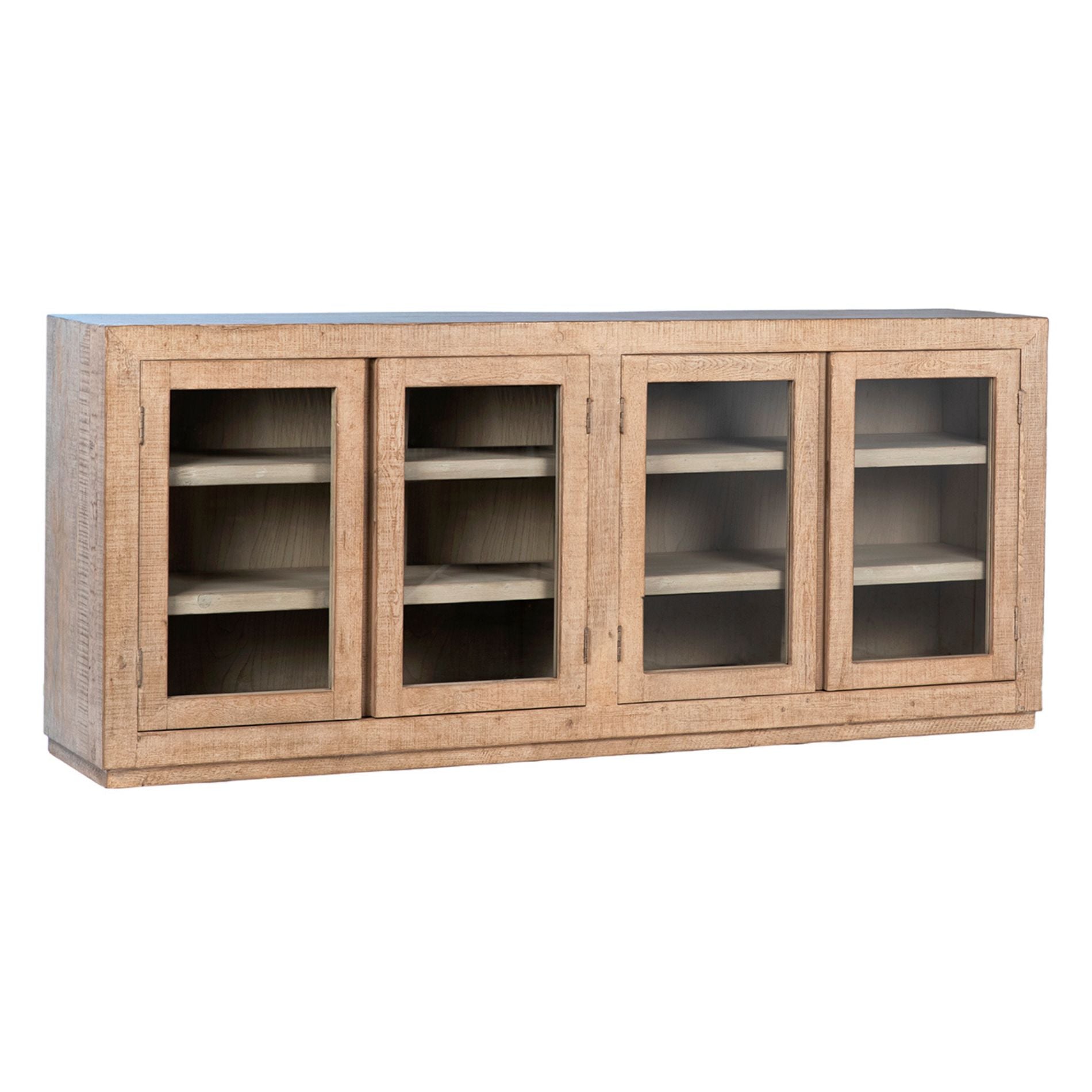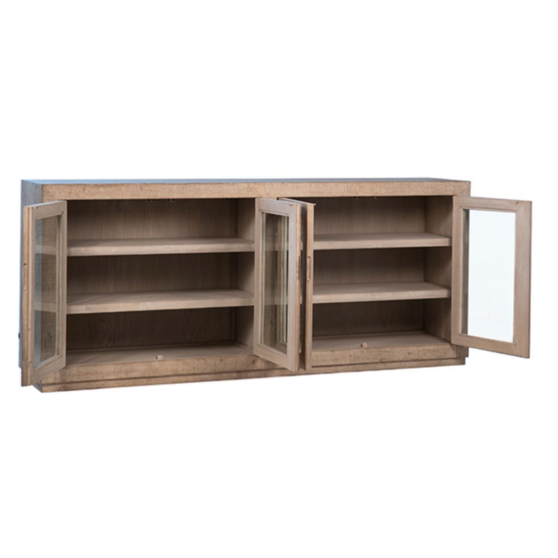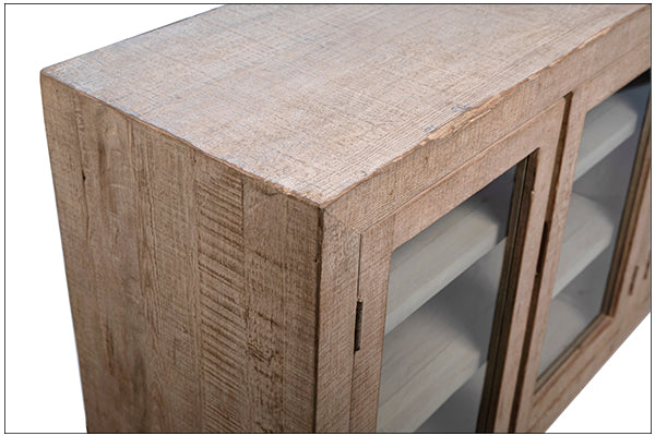 Indvidually crafted from recycled Pine and finished in a light white wash and a water-based sealer. The straight contemporary lines and fresh finish create a stunning Modern Coastal appeal. Includes four glass shelves. Imported