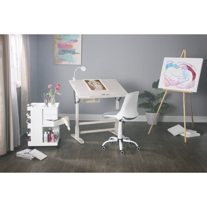 Bring your artistic vision to life with the Studio Designs 36-inch Vintage Wood Adjustable Drafting Craft Table. This versatile table is a must-have for artists, crafters, and designers. The solid hardwood frame ensures durability, while the adjustable top allows you to work at any angle between flat and 90 degrees. Choose from three finishes to match your decor.