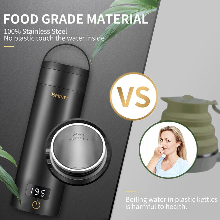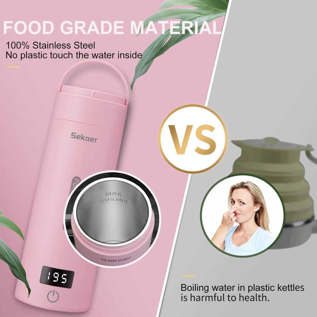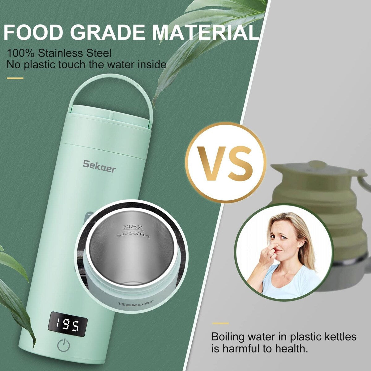 Portable & Lightweight - The portable travel water bottle is only 8.8 inches and net weight 0.98 pounds, the compact design take it with you when you travel, camping or in the office. Especially suitable for use in a hotel without a clean electric kettle.