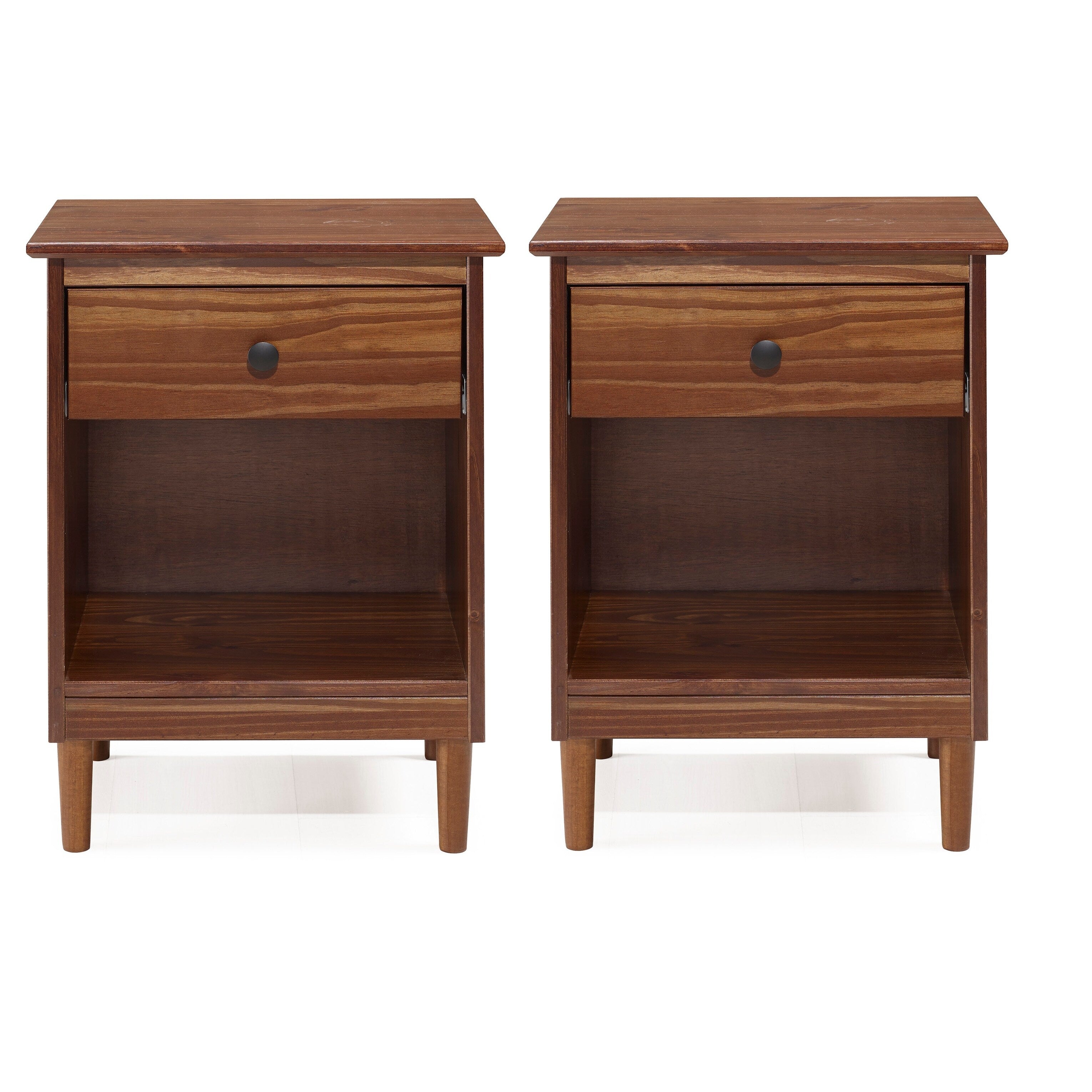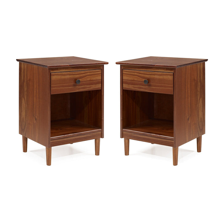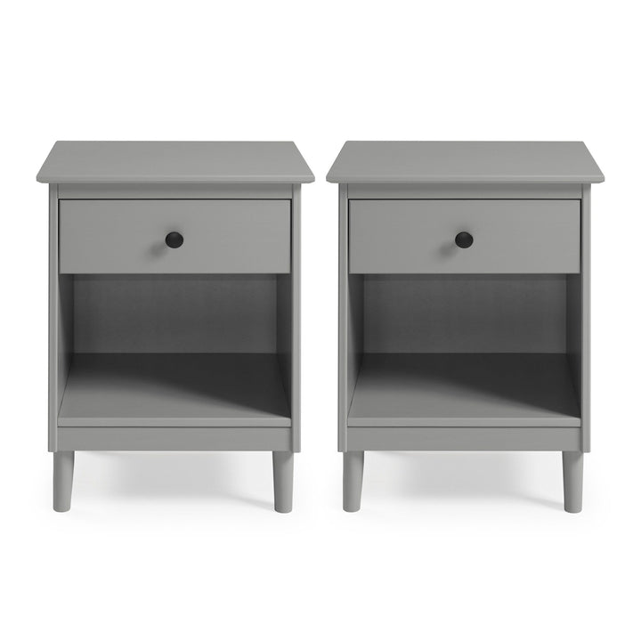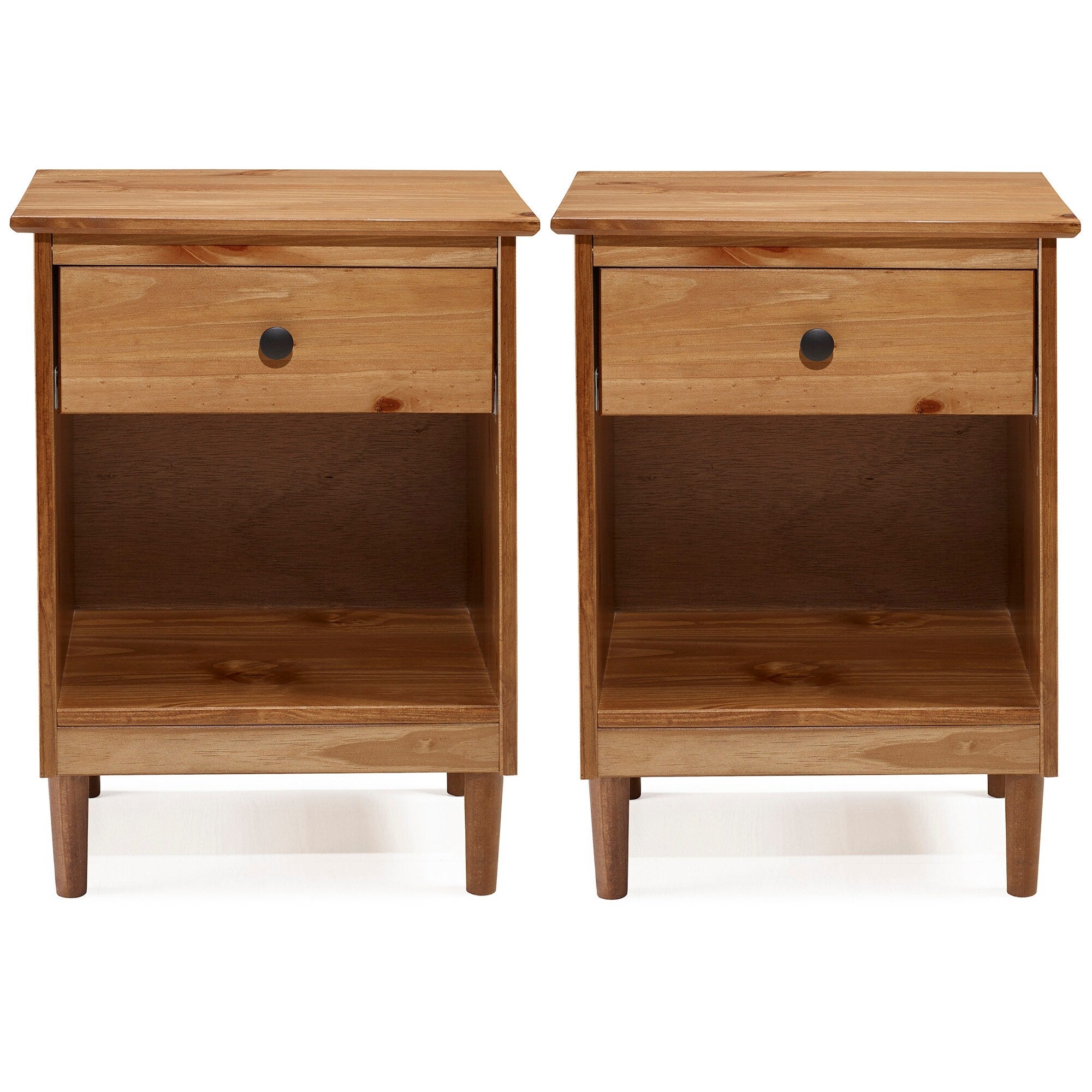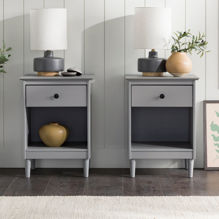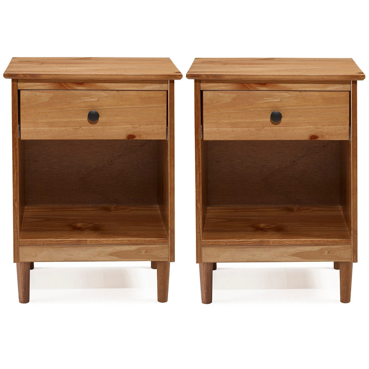 This set of one-drawer nightstands flaunts a classic and simple design. The boxy frame and mid-century-inspired, tapered legs, are made from sustainably sourced solid pine and MDF, for reliable dependability. Boasting a spacious drawer for keeping your room essentials hidden and a lower open shelf for your book or magazine collection, this piece boasts multiple storage solutions.