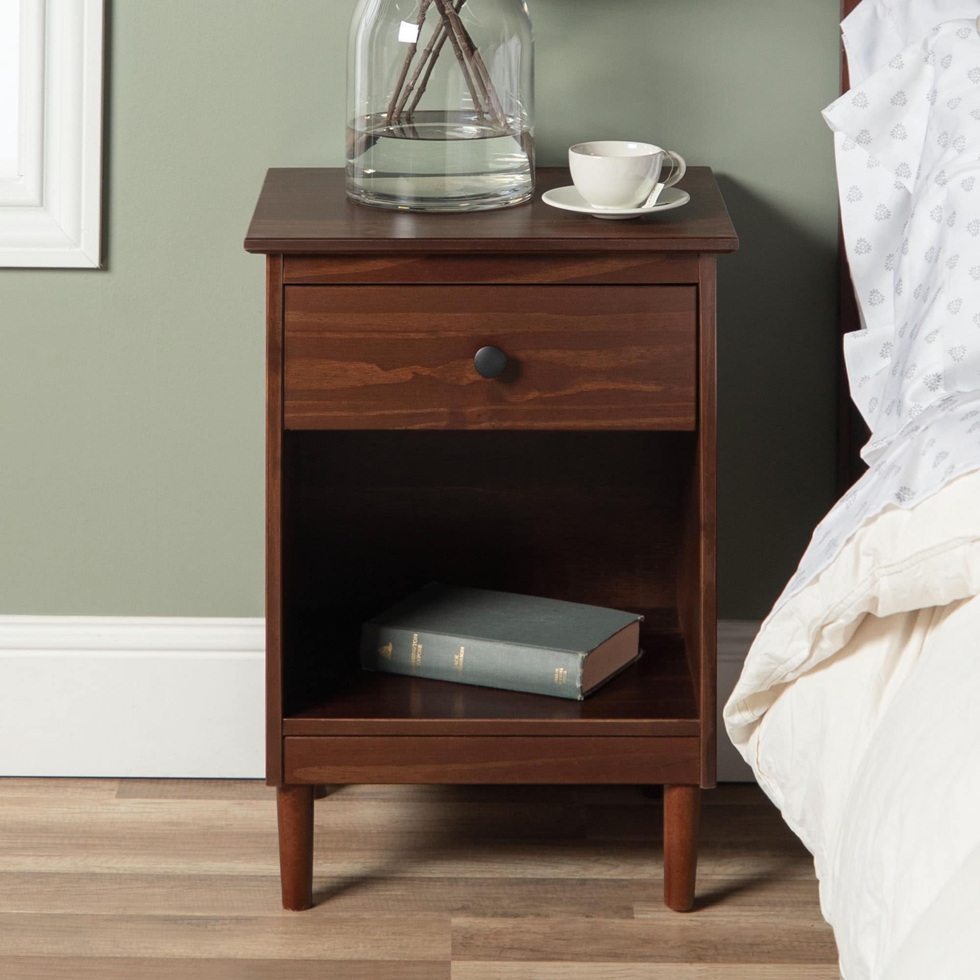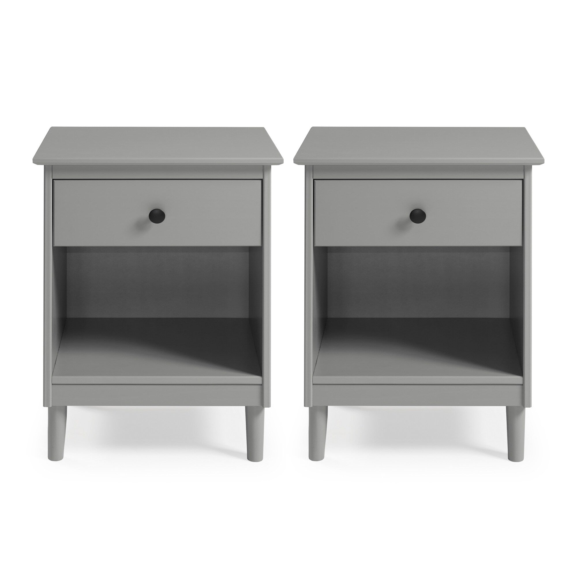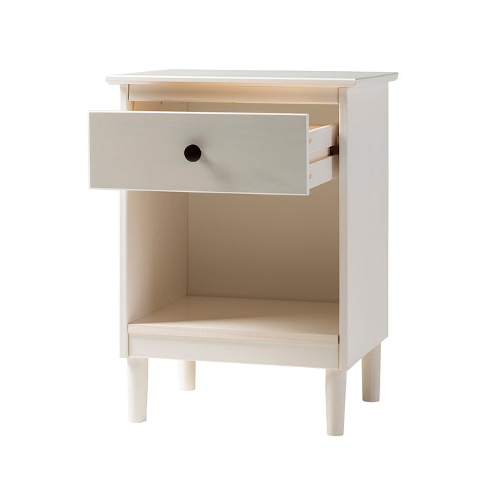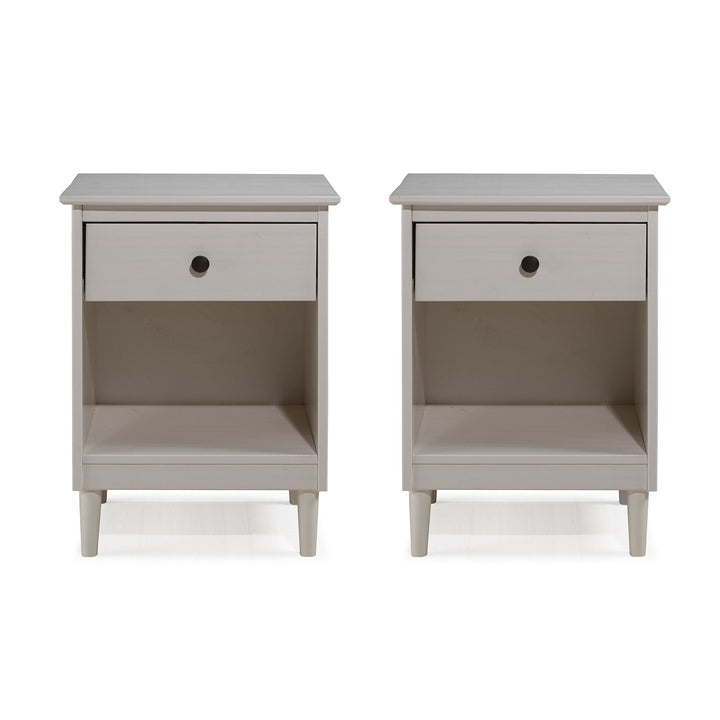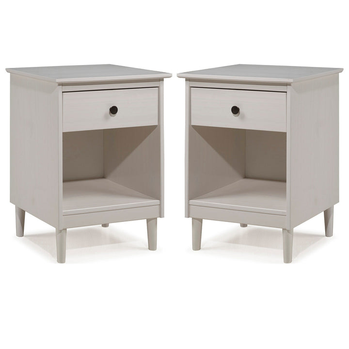 This set of one-drawer nightstands flaunts a classic and simple design. The boxy frame and mid-century-inspired, tapered legs, are made from sustainably sourced solid pine and MDF, for reliable dependability. Boasting a spacious drawer for keeping your room essentials hidden and a lower open shelf for your book or magazine collection, this piece boasts multiple storage solutions.