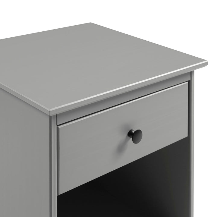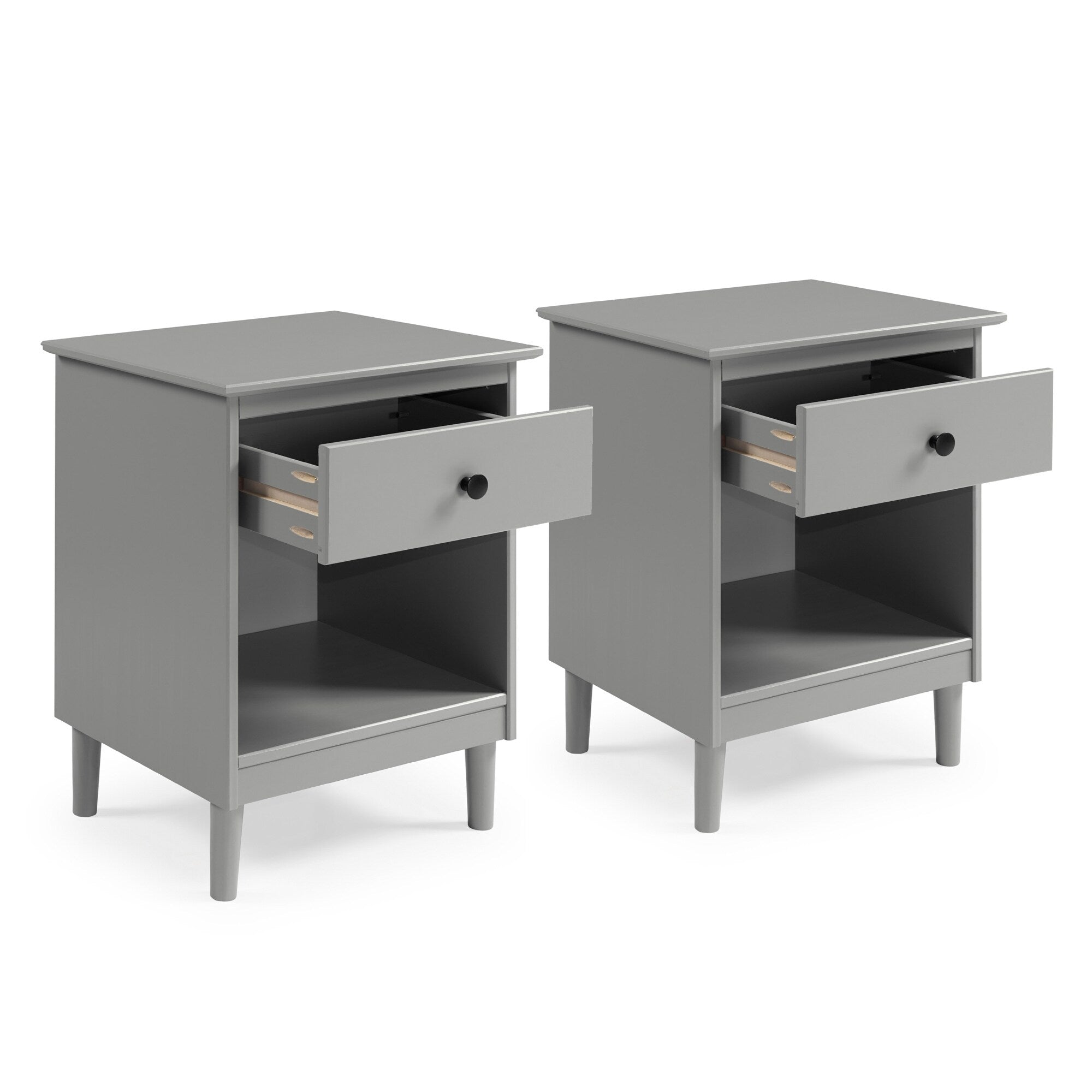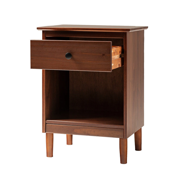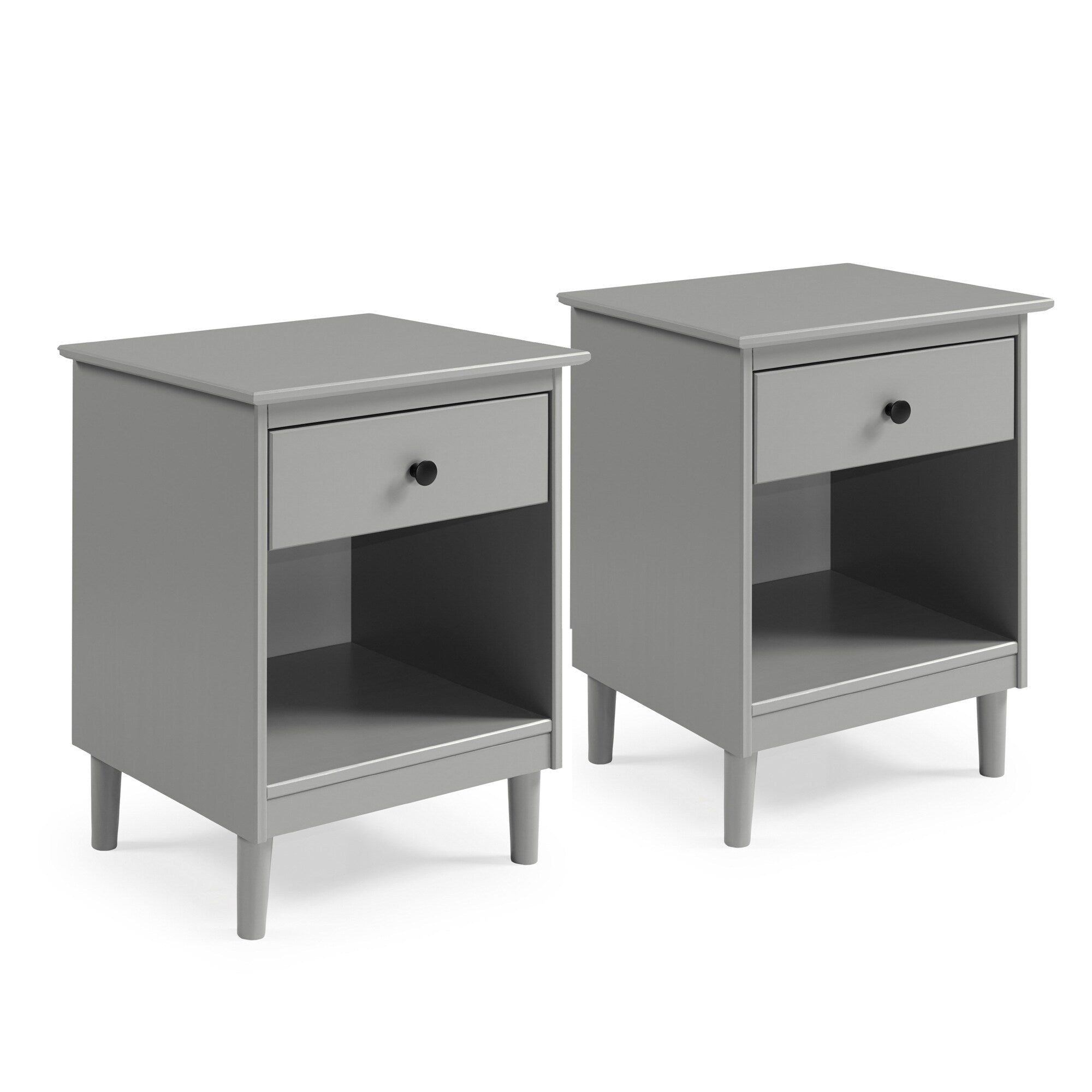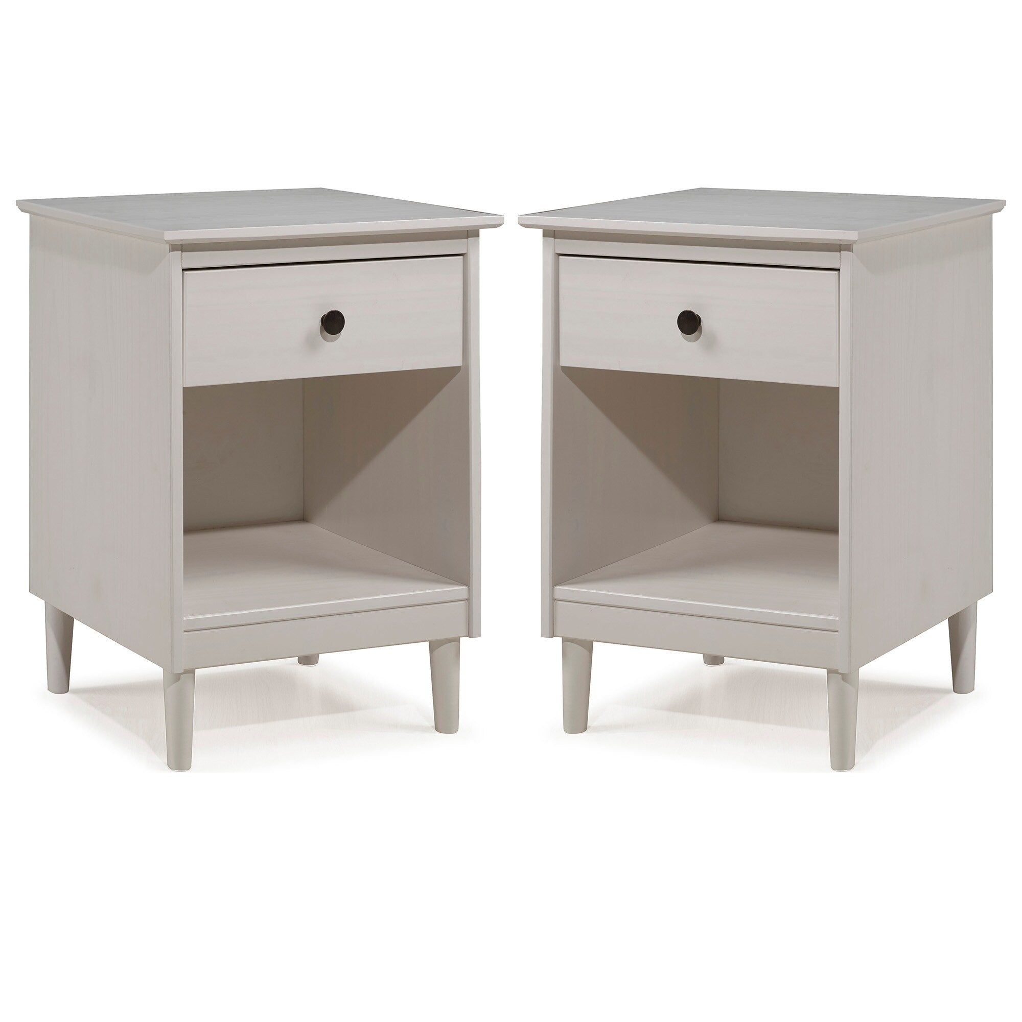 This set of one-drawer nightstands flaunts a classic and simple design. The boxy frame and mid-century-inspired, tapered legs, are made from sustainably sourced solid pine and MDF, for reliable dependability. Boasting a spacious drawer for keeping your room essentials hidden and a lower open shelf for your book or magazine collection, this piece boasts multiple storage solutions.