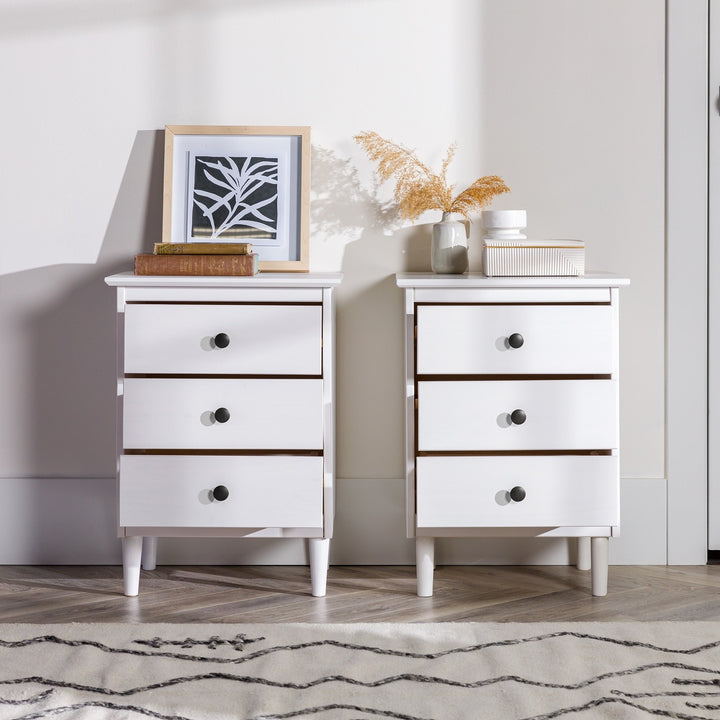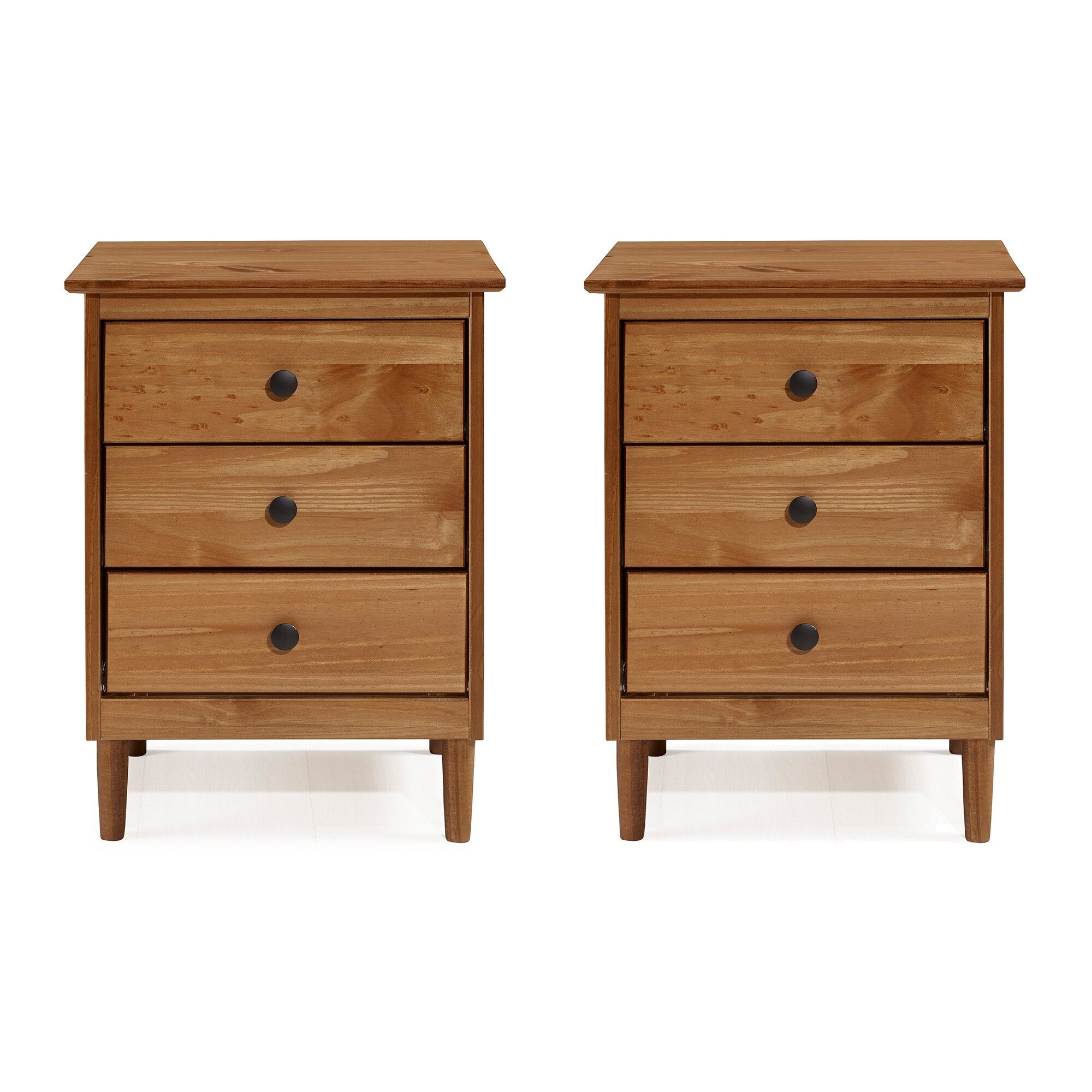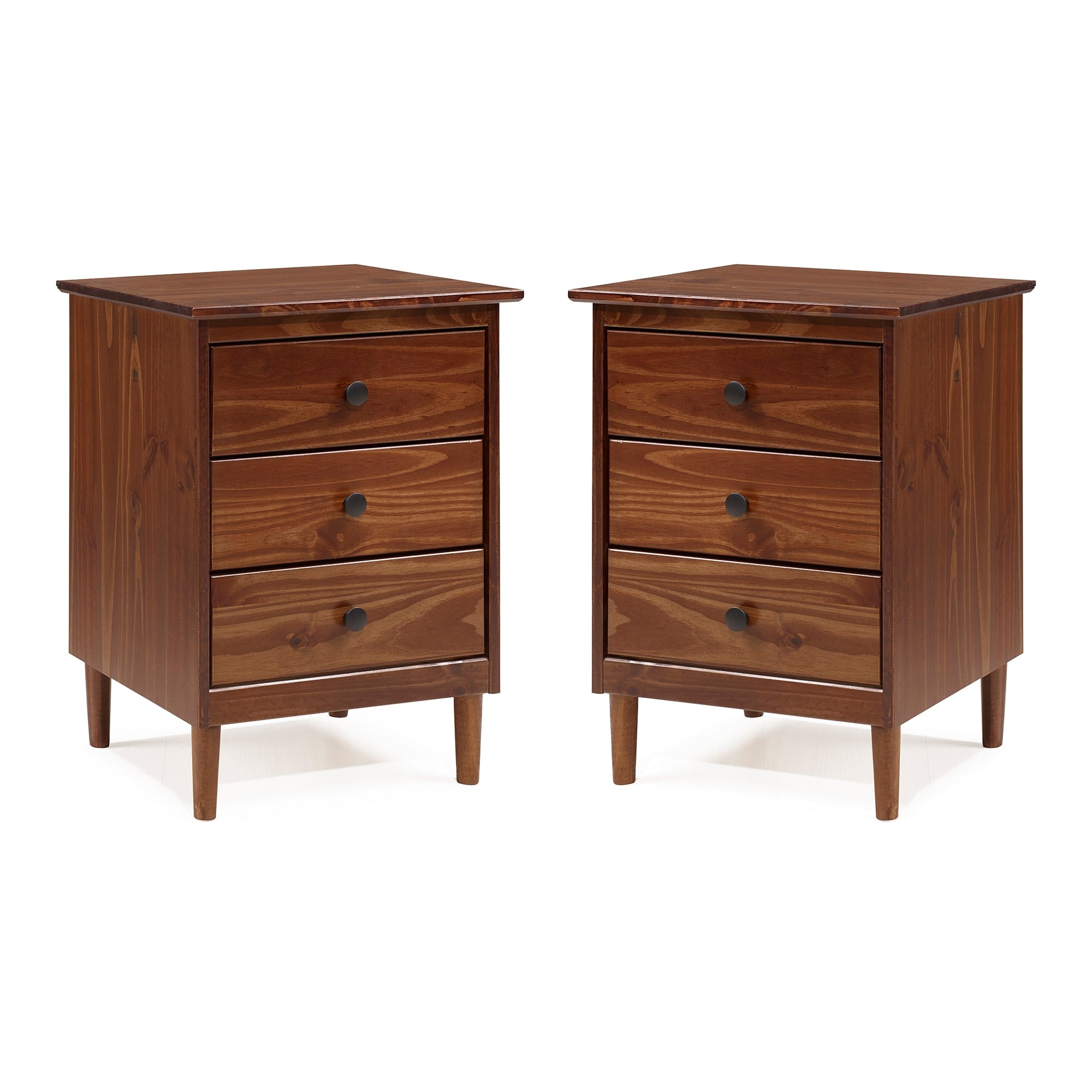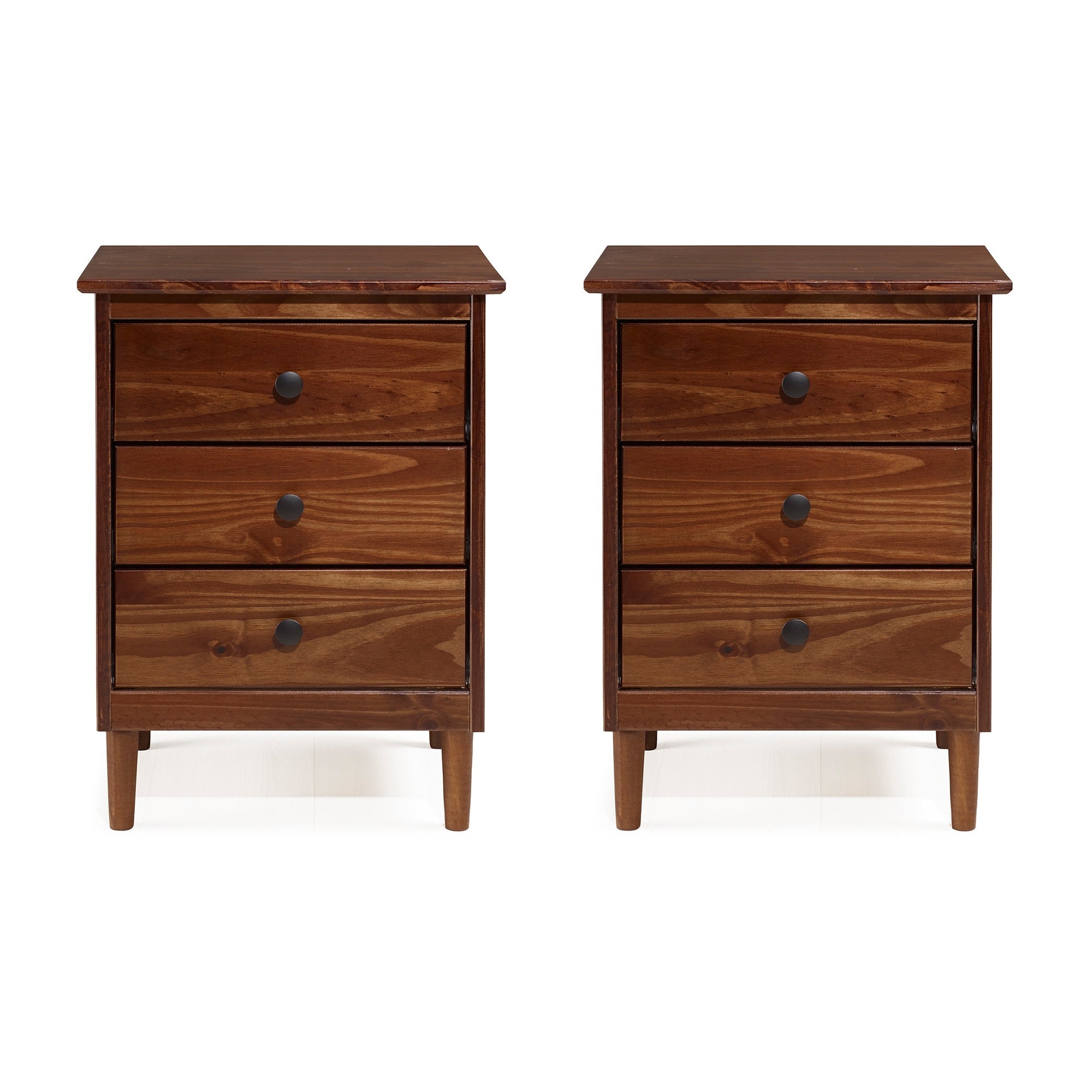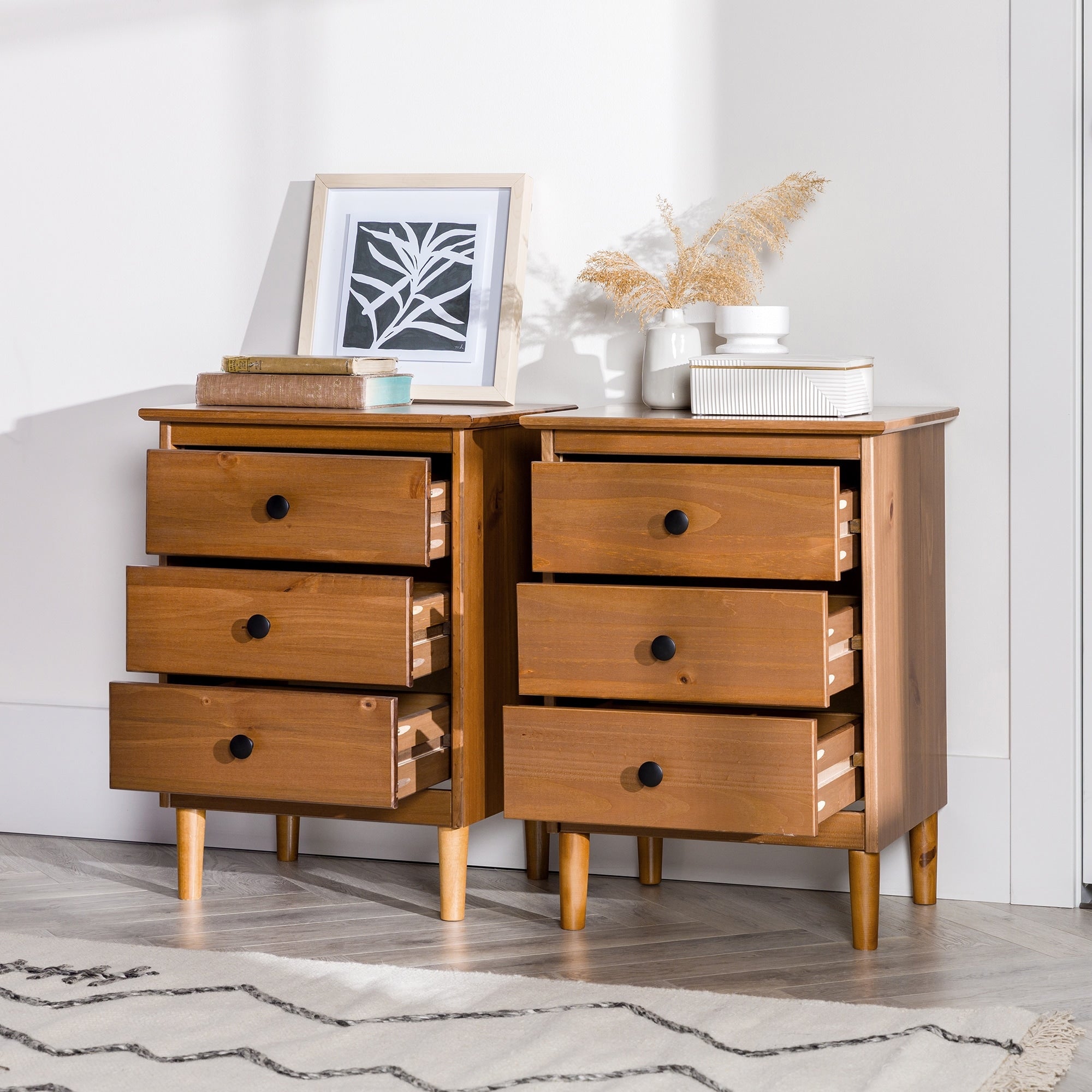 Upgrade your bedroom with this stylish set of two Walker Edison Bullrushes solid wood nightstands. These mid-century modern nightstands with tapered legs are made of responsibly harvested pine wood and MDF, offering durability and longevity. The painted/stained finish in white, caramel or walnut enhances their elegance, while the round matte black metal drawer pull adds a chic touch. With three spacious storage drawers, these nightstands provide ample space for your bedside essentials. Assembly is required and step-by-step instructions are included.