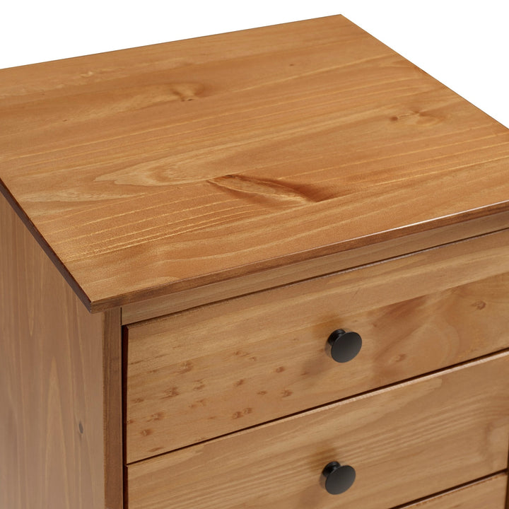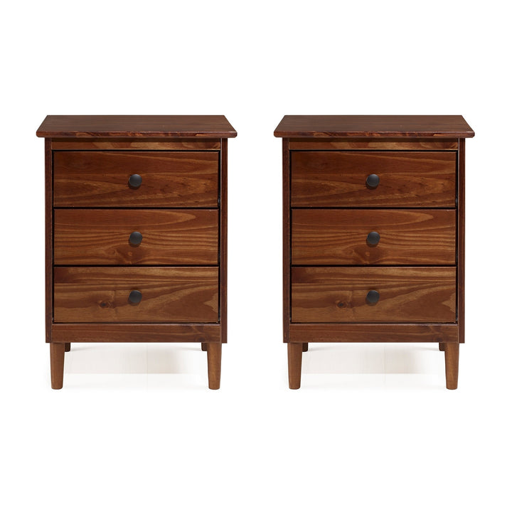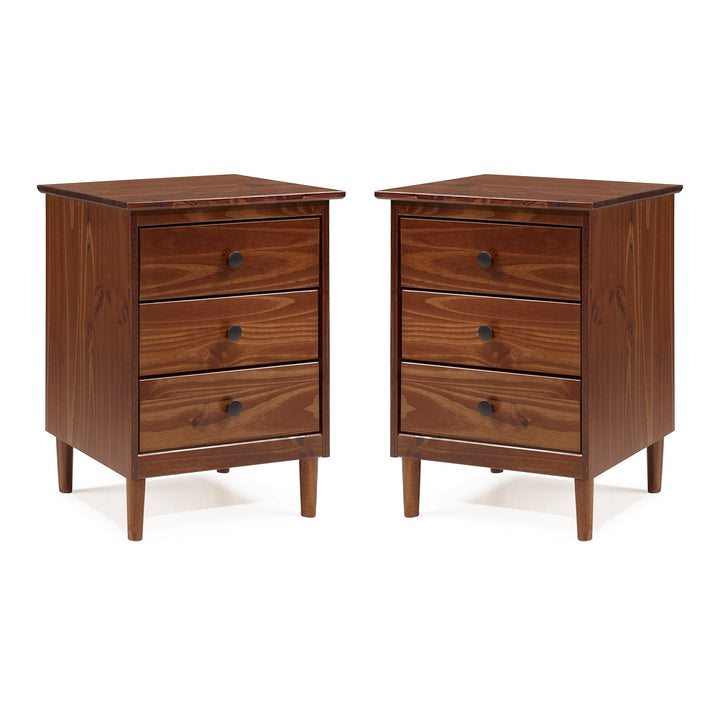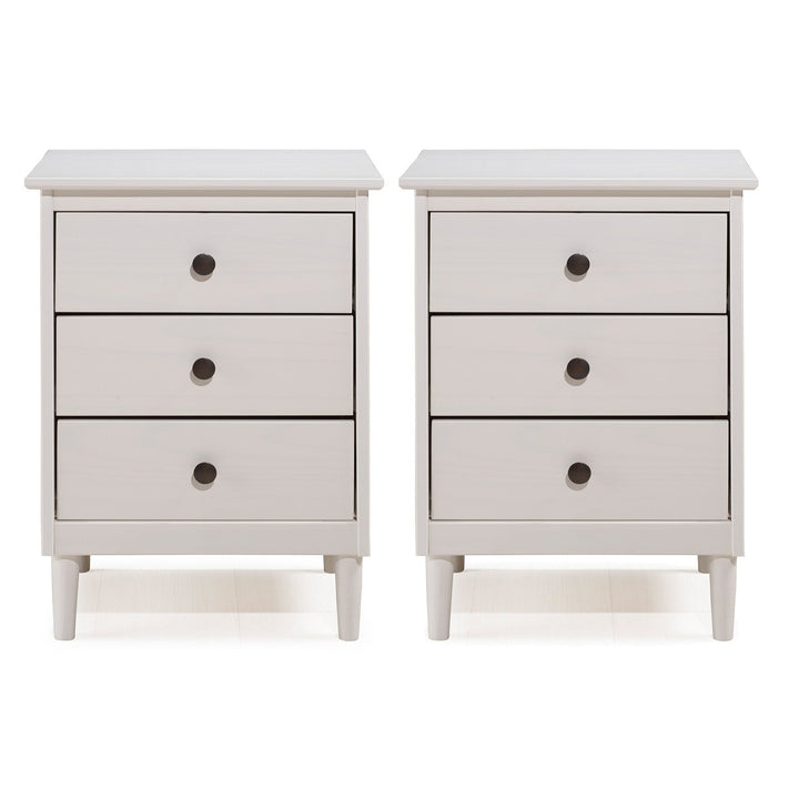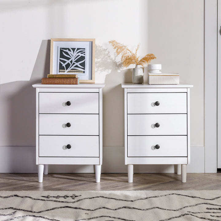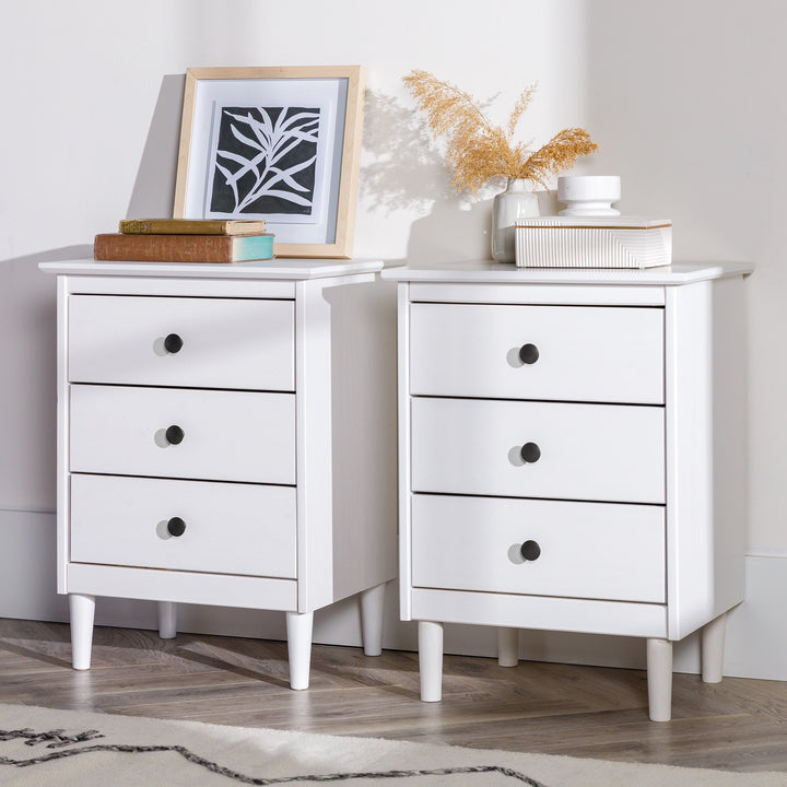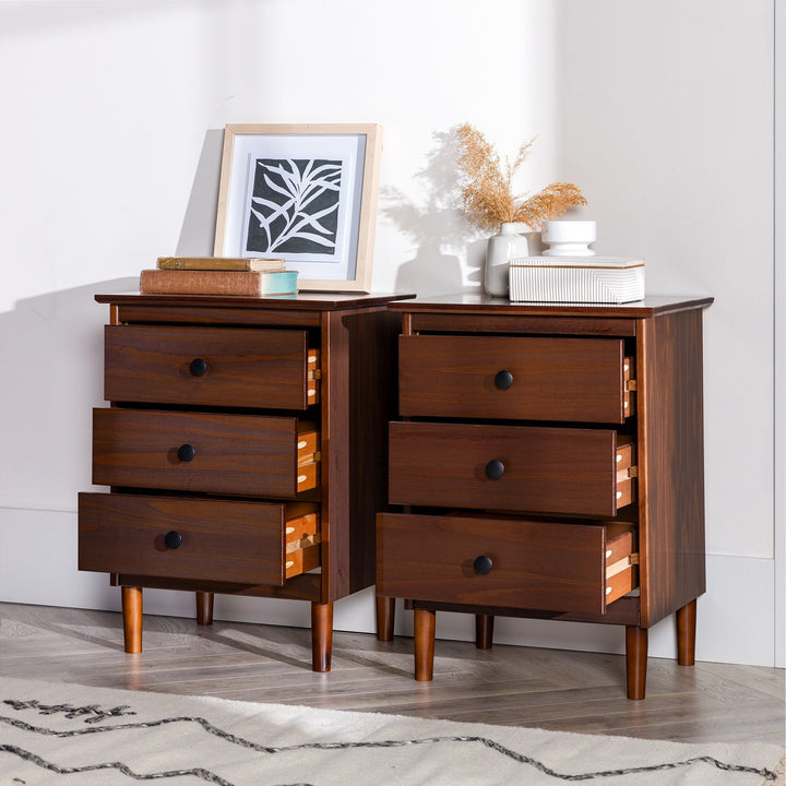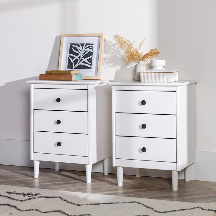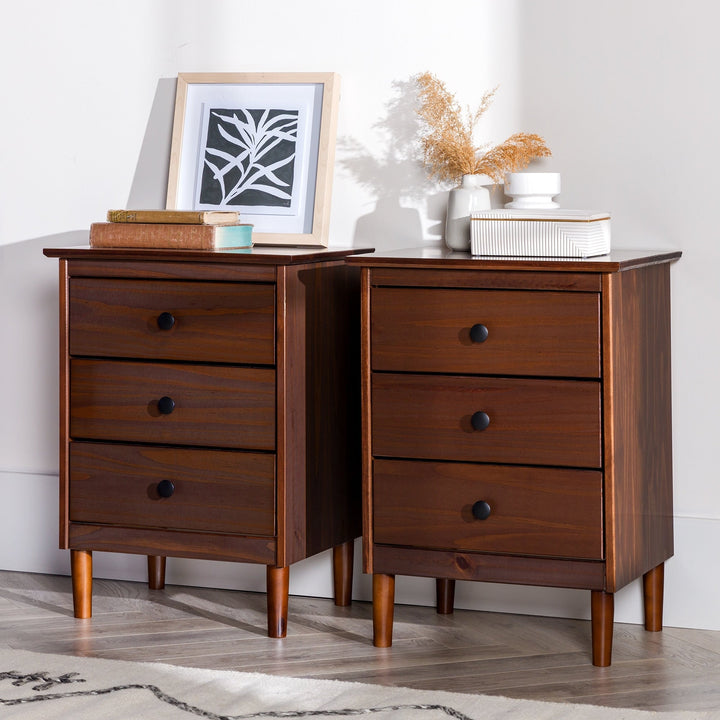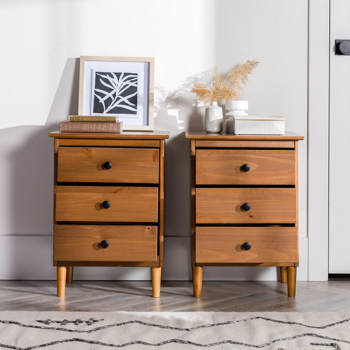 Upgrade your bedroom with this stylish set of two Walker Edison Bullrushes solid wood nightstands. These mid-century modern nightstands with tapered legs are made of responsibly harvested pine wood and MDF, offering durability and longevity. The painted/stained finish in white, caramel or walnut enhances their elegance, while the round matte black metal drawer pull adds a chic touch. With three spacious storage drawers, these nightstands provide ample space for your bedside essentials. Assembly is required and step-by-step instructions are included.