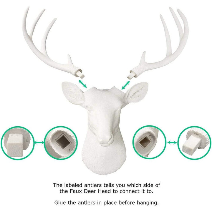 The mini white Deer Head Decor that changed the game. Carefully created, beautifully designed, and meticulously curated from the Deer Head to the Deer Antlers. Finally a Faux deer worthy of swapping your deer mounts out with! Made of Eco-Friendly Resin for all the charm and none of the harm Hand Finished in the USA for a beautiful piece that will WOW your wall!Simply attach antlers (they are labeled L and R for easy assembly) and hang using a monkey hook, nail or screw! It's that easy!