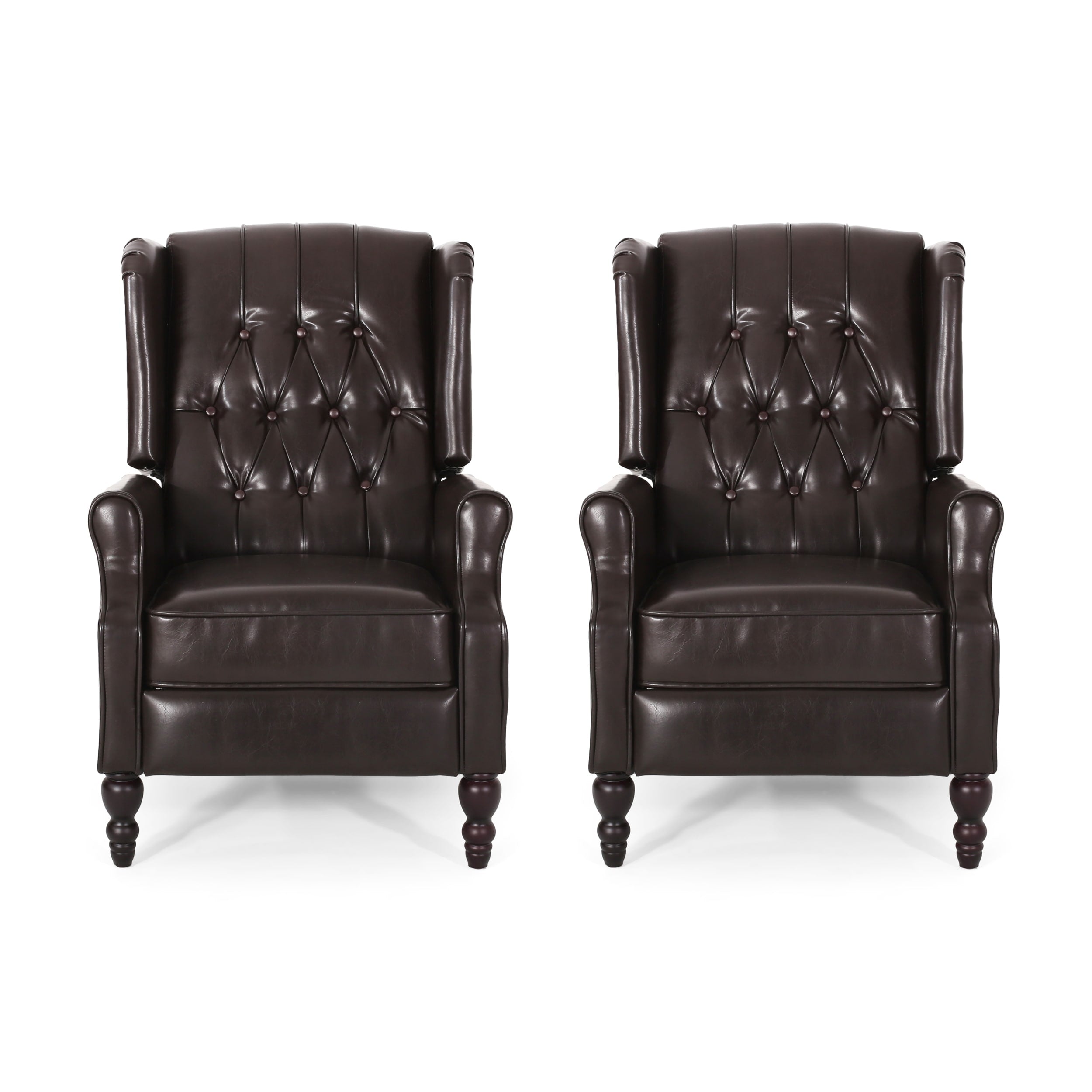 Elevate your living space with the Walter Recliner Set by Christopher Knight Home. This set of two recliners combines classic design elements, such as a wingback silhouette, button-tufted diamond stitching, and railheads trim, with modern functionality. The plush bonded leather upholstery and smooth pushback reclining mechanism provide exceptional comfort, while the sturdy birch wood legs ensure durability. Ideal for any living room or study, these recliners offer both style and relaxation.