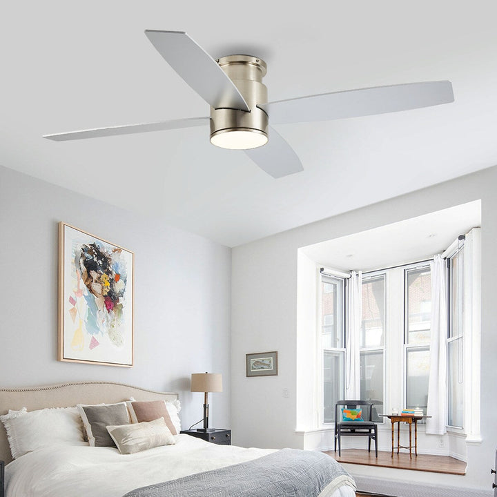 The Flush Mount Ceiling Fan delivers ample airflow into interior living areas with its 4-bladed design that reach a 52 in.(44 in.) blade sweep. Fixture hugs the ceiling, allowing for a near-seamless integration into whichever room its housed in, which can be in areas like living rooms, bedrooms and kitchens. The Flush mount Ceiling Fan comes with wall control for easy, convenient use.