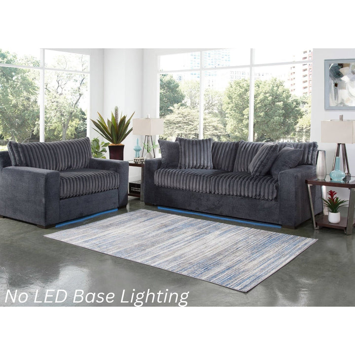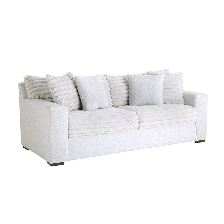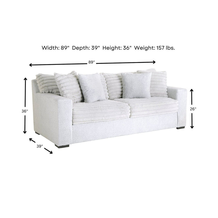 This stylish sofa features chunky track arms and non-reversible seat cushions for a streamlined look. Upholstered in an incredibly soft plush knit fabric, the body showcases a smooth finish, while the back cushions are covered in a textured, chunky corded knit. Offering the comfort of sitting on your favorite cozy throw, the sofa also includes four accent pillowsâtwo in each fabric. Seating up to three comfortably, it fits seamlessly into any size floor plan. Proudly made in the USA.