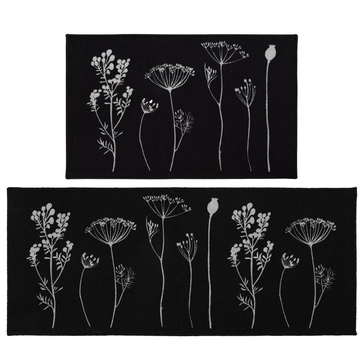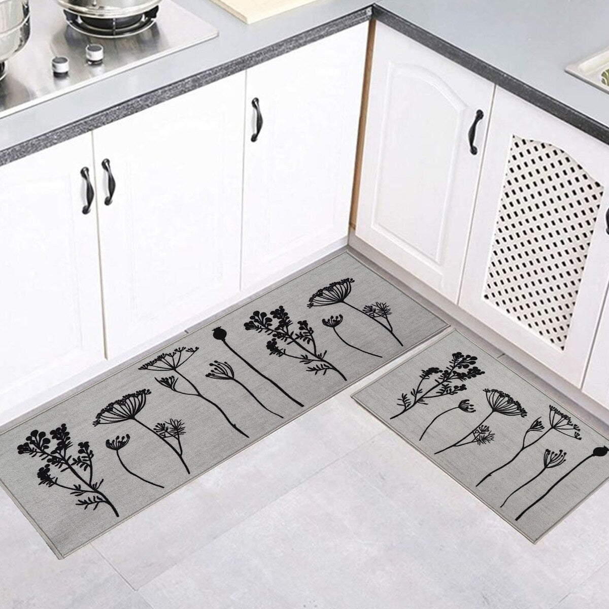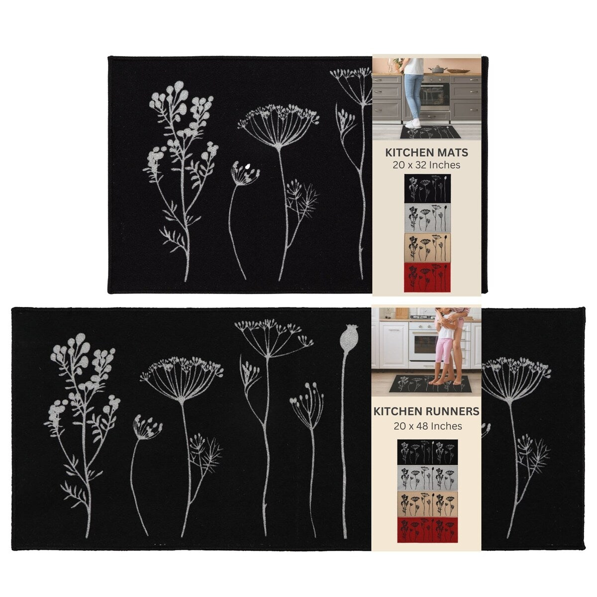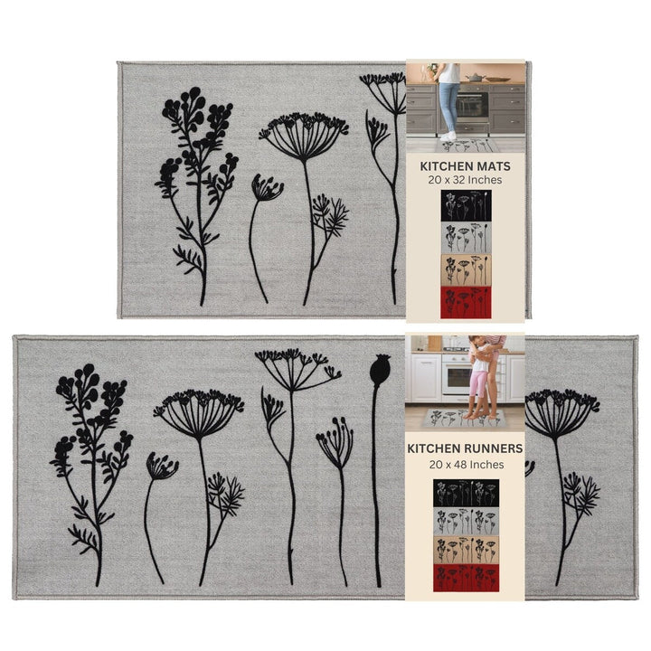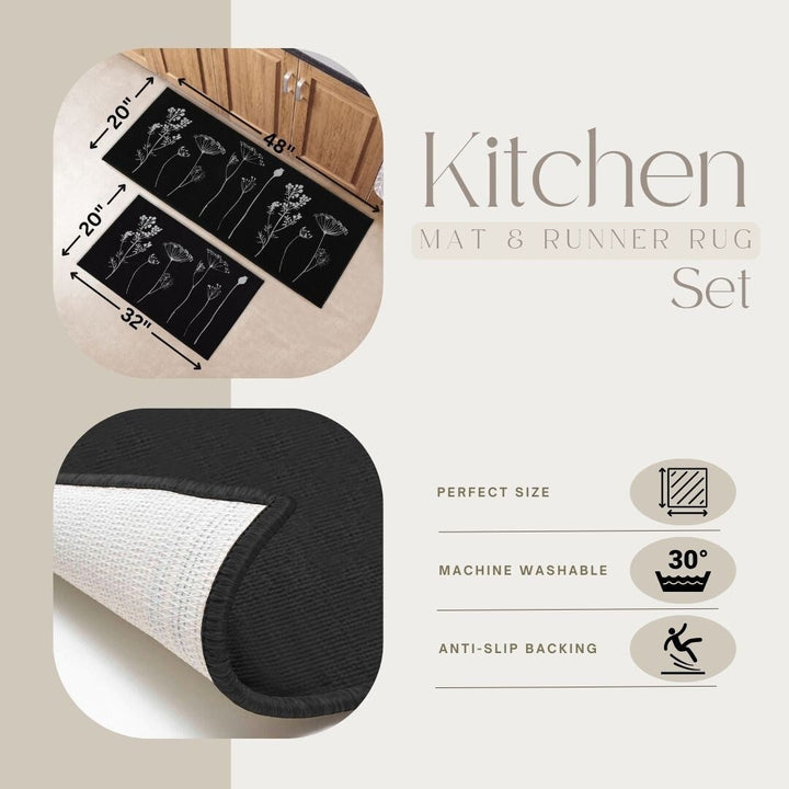 - SET OF 2 MATS: Easily cover an extra-large area in your kitchen with this set of 2 coordinated kitchen mats. The 2-pack rugs for kitchen features one kitchen mat (32 x 20 inches) and one runner rug (48 x 20 inches)