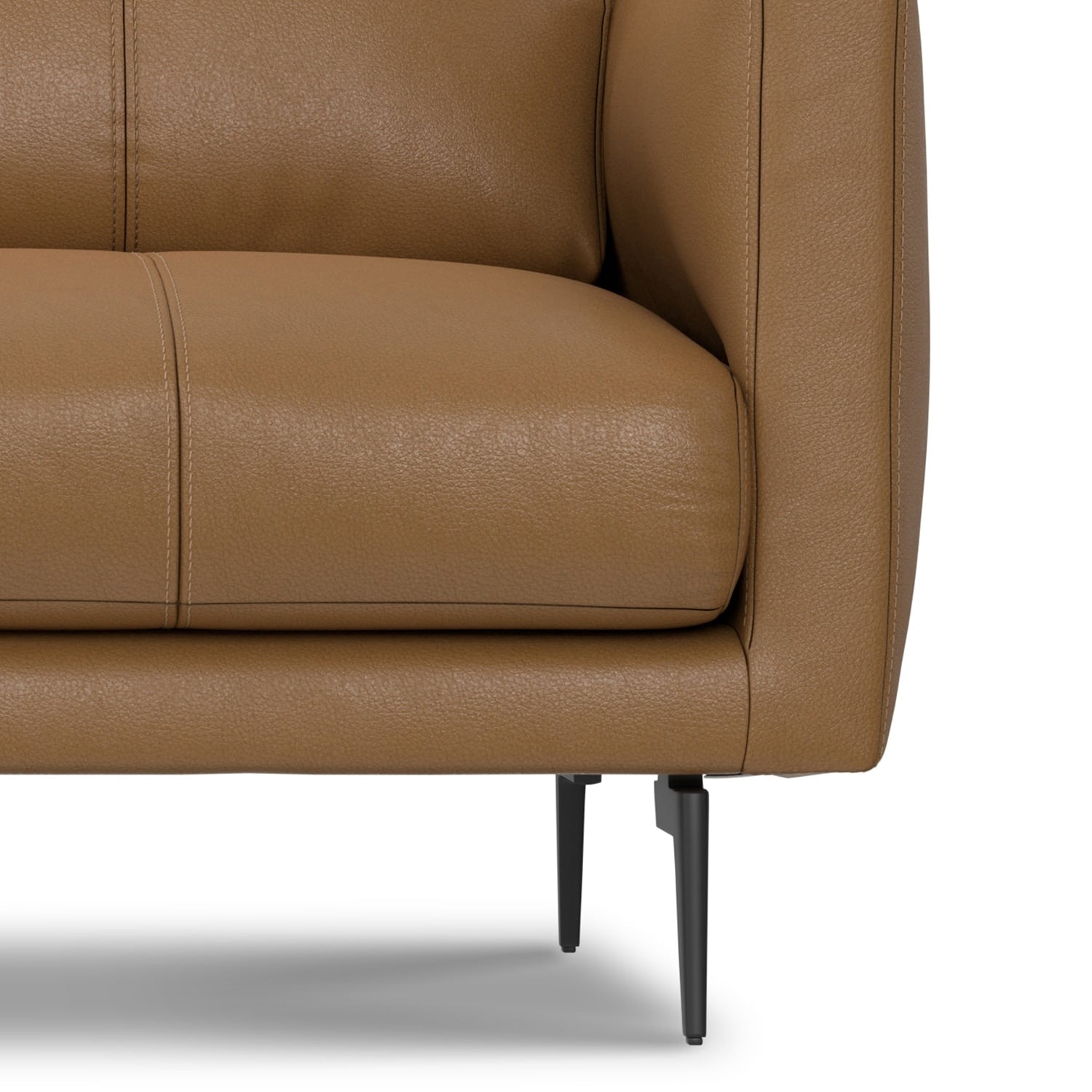 - Upholstered in premium genuine Kind Leather, a semi-aniline leather that's soft, durable, developing a beautiful patina over time