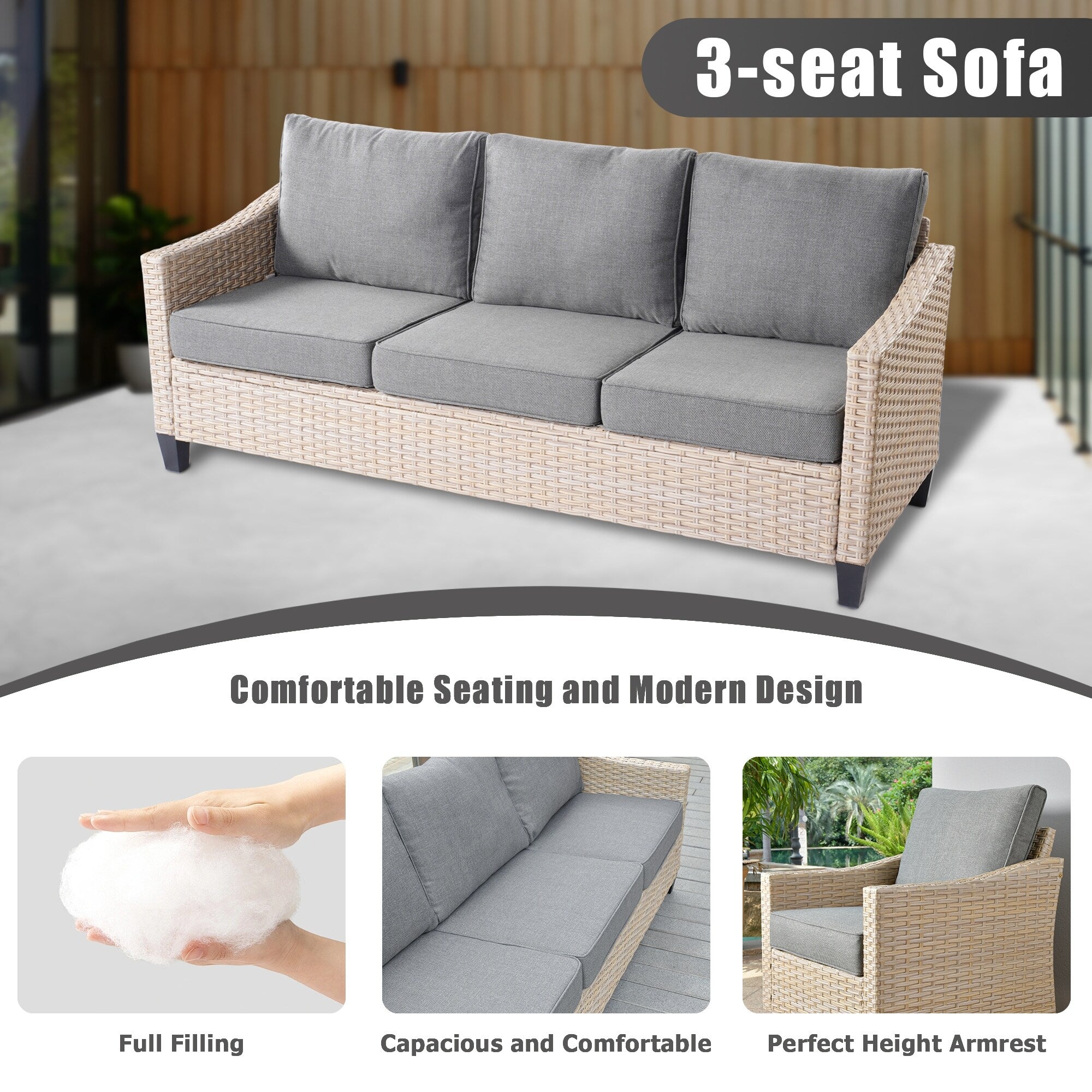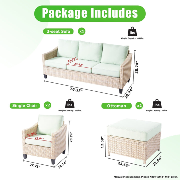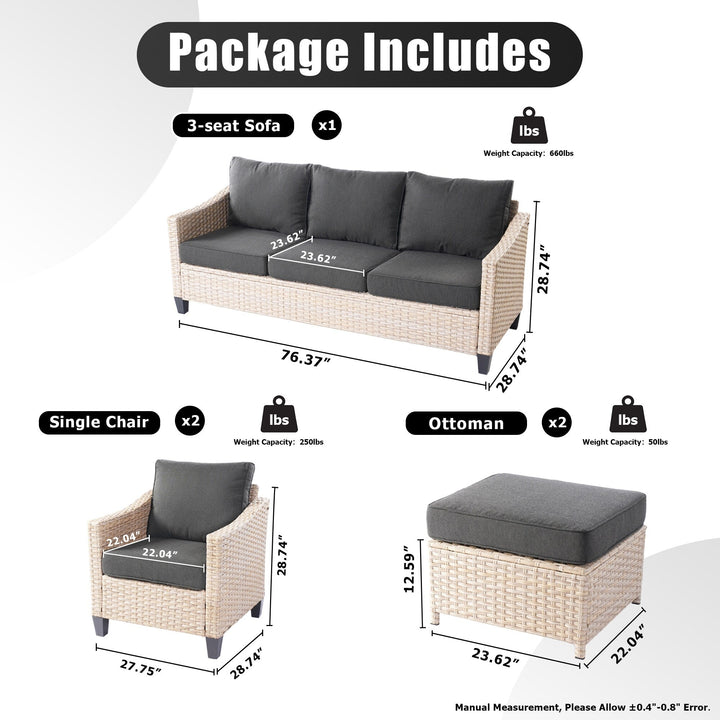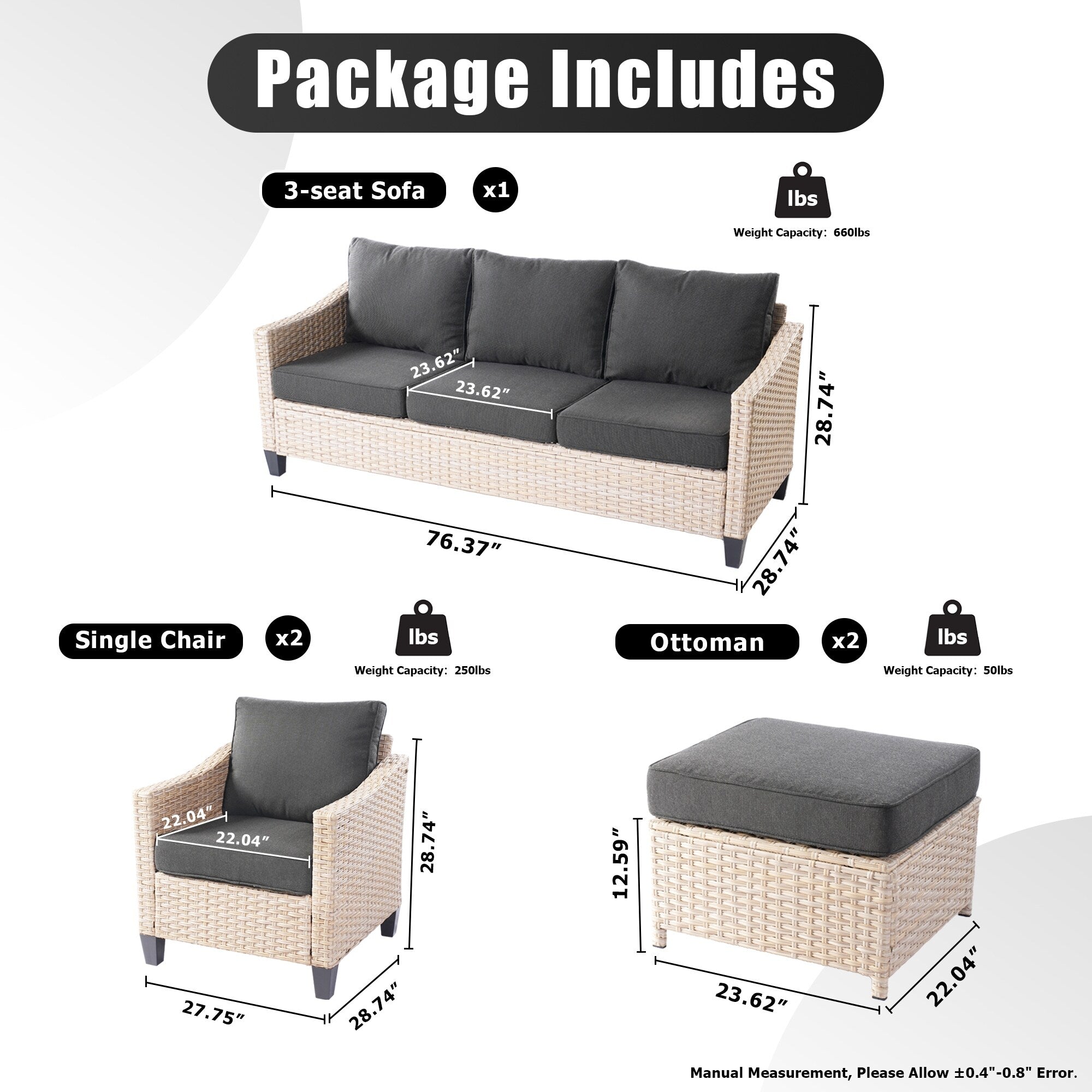 Enjoy ultimate comfort with the high-density sponge seat cushions and fluffy back cushions of this patio furniture set. The cushion covers can be easily removed with the zipper design, allowing for convenient cleaning. And the splash-proof material ensures hassle-free maintenance. Ergonomic backrest and armrest design provide full support for your back and arms, allowing you to sit comfortably and relieve your tiredness of the day and fully enjoy leisure time. Includes a 3-seater sofa, 2 single chairs, 2 ottomans and all cushions.?