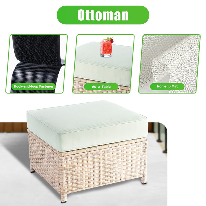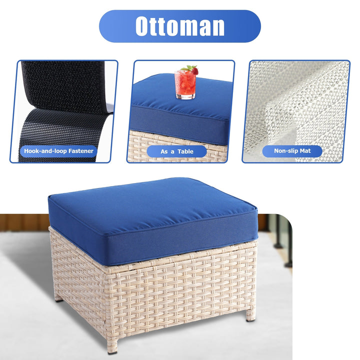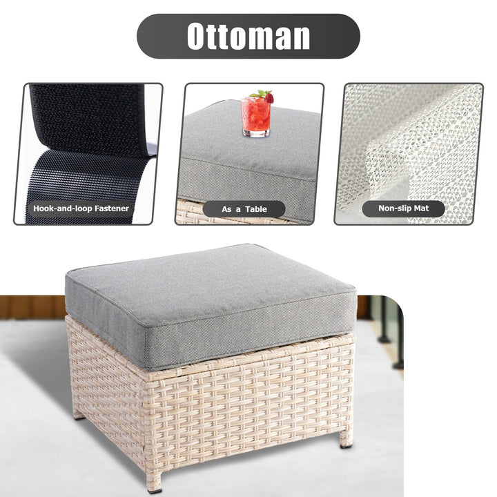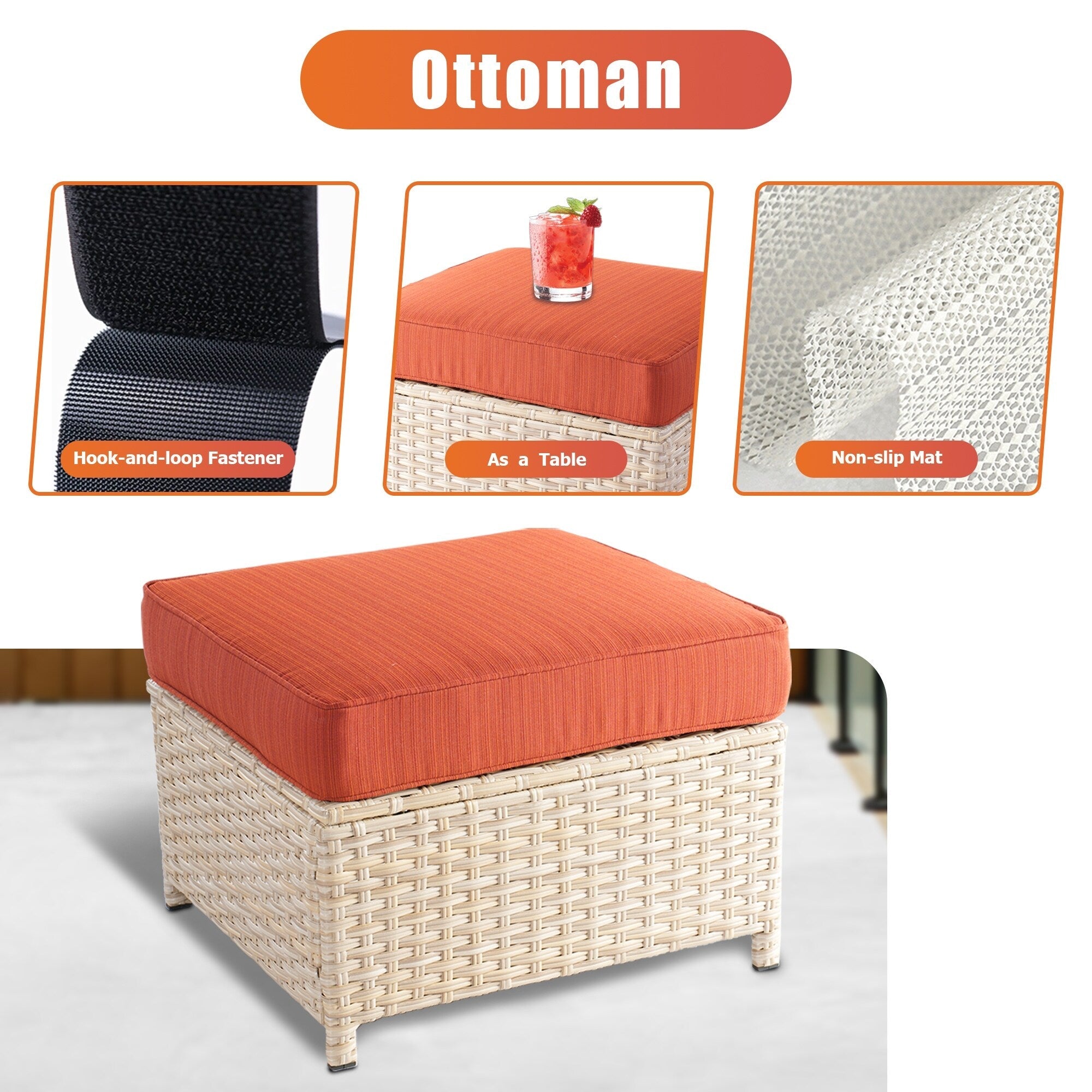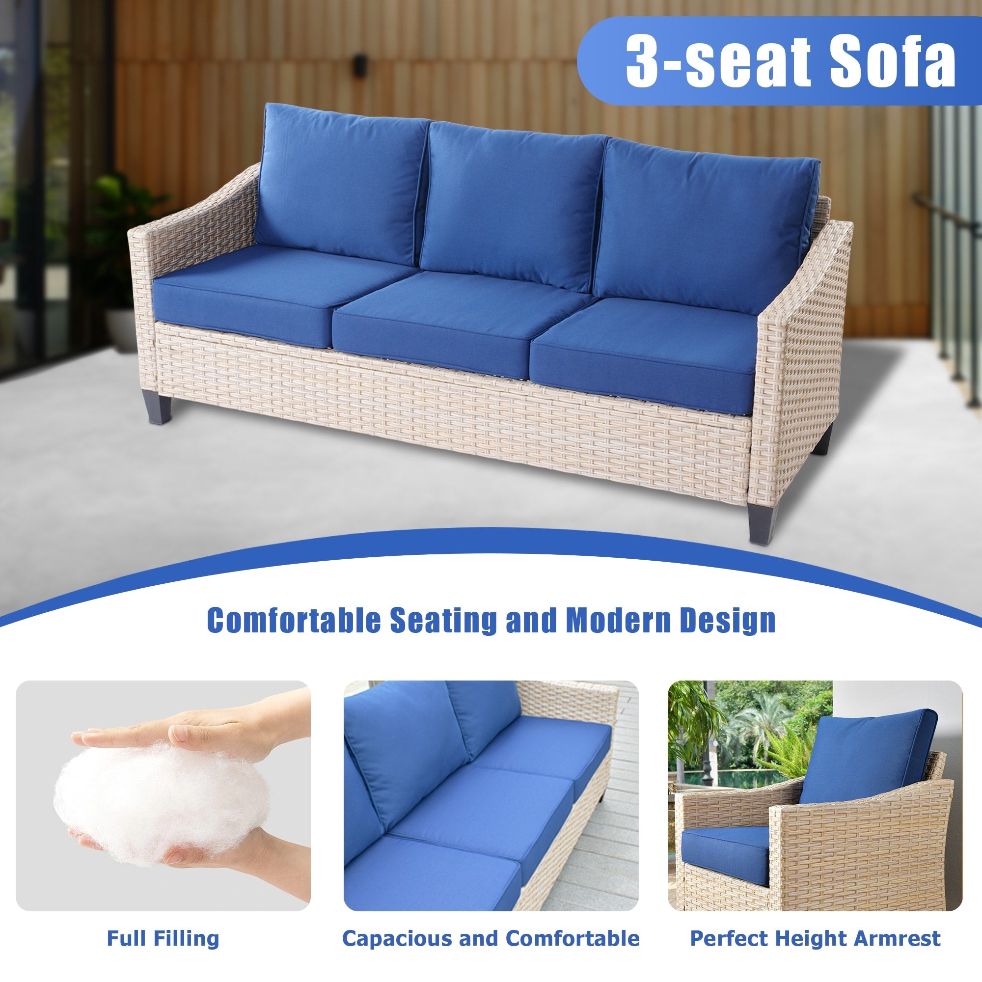 Enjoy ultimate comfort with the high-density sponge seat cushions and fluffy back cushions of this patio furniture set. The cushion covers can be easily removed with the zipper design, allowing for convenient cleaning. And the splash-proof material ensures hassle-free maintenance. Ergonomic backrest and armrest design provide full support for your back and arms, allowing you to sit comfortably and relieve your tiredness of the day and fully enjoy leisure time. Includes a 3-seater sofa, 2 single chairs, 2 ottomans and all cushions.?