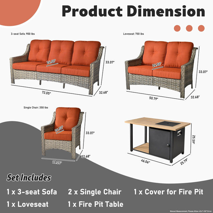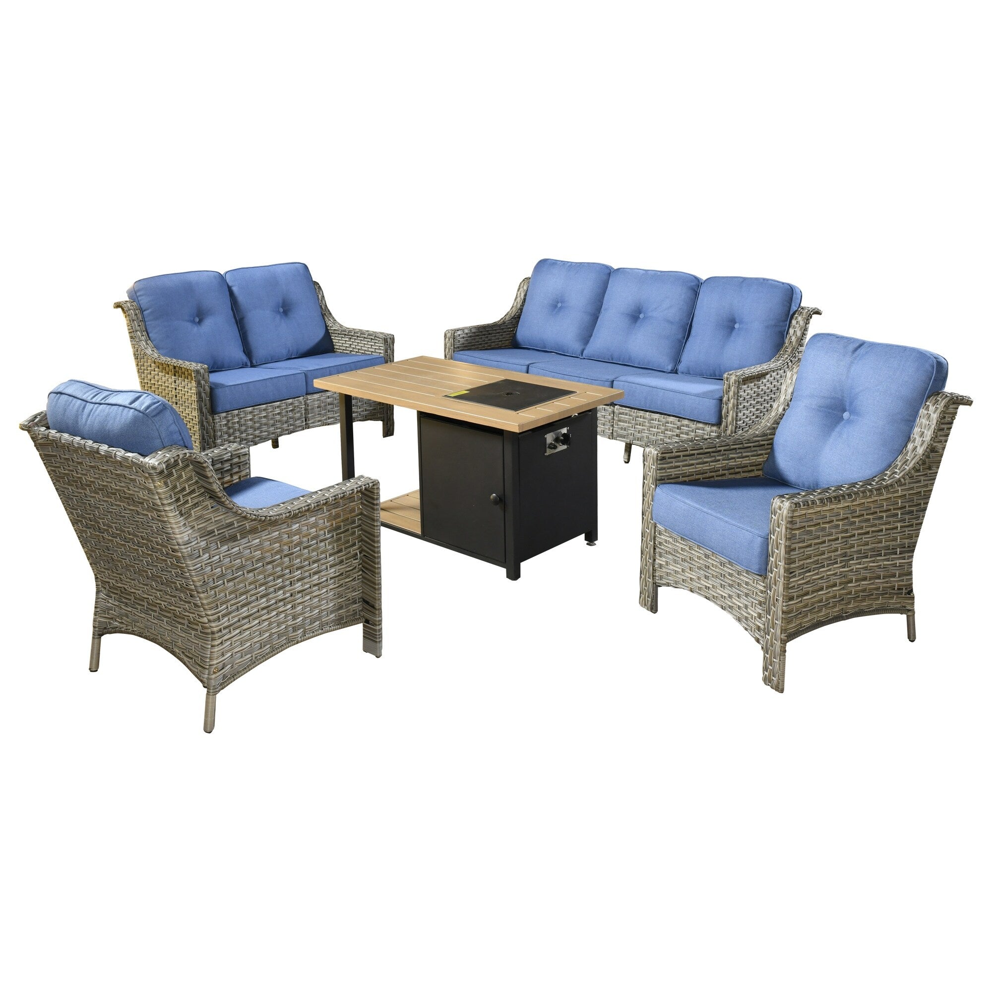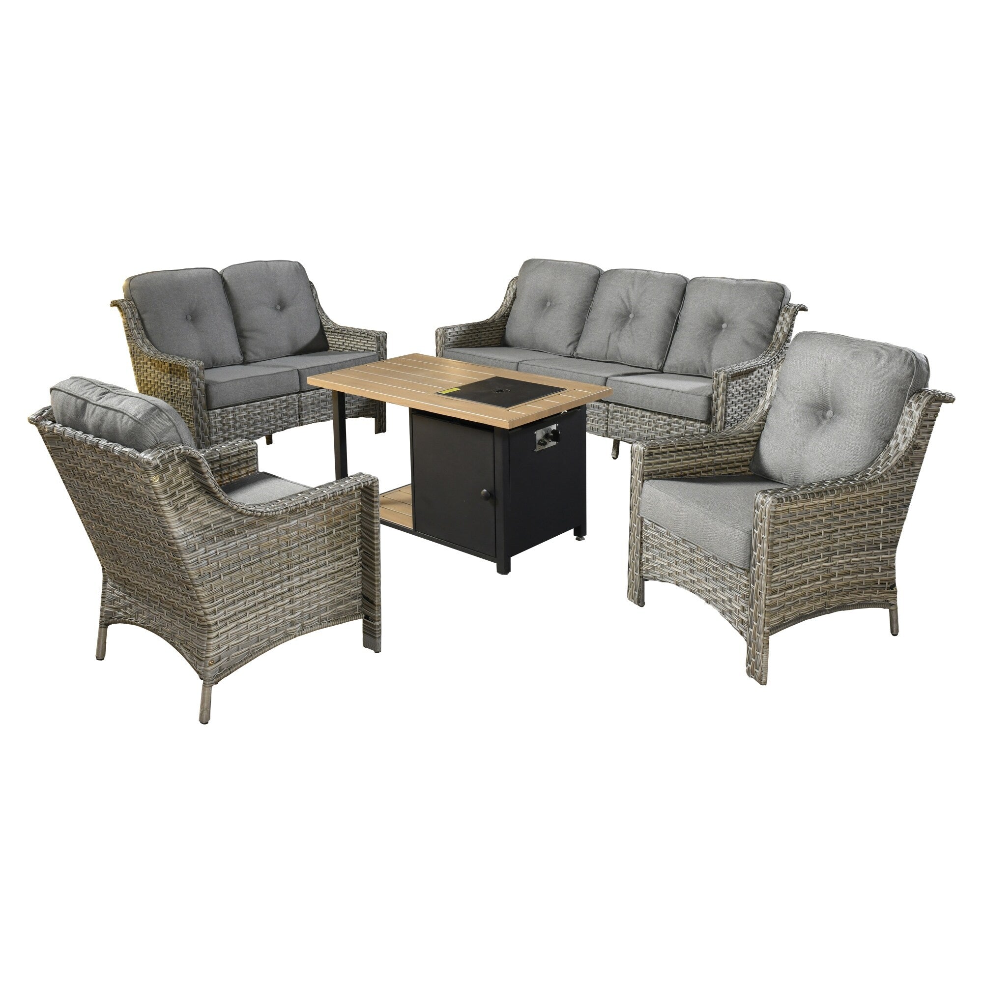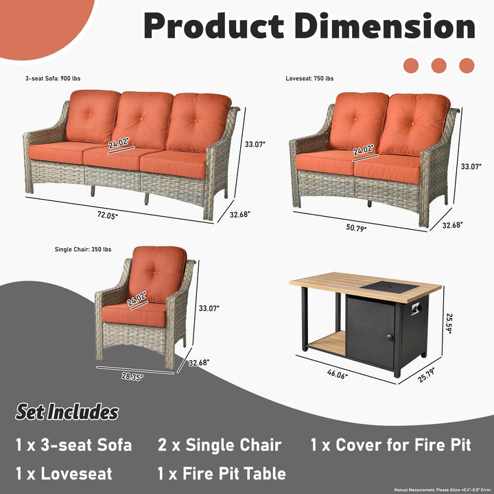 - Comes with 1 3-seat sofa, 1 loveseat, 2 single sofas and a double-layer fire pit table
