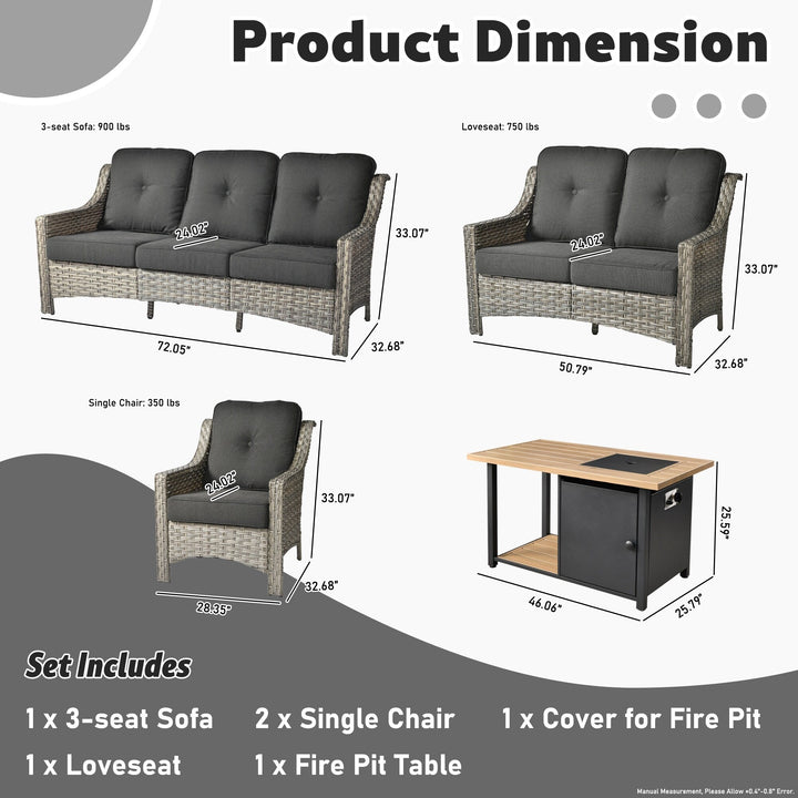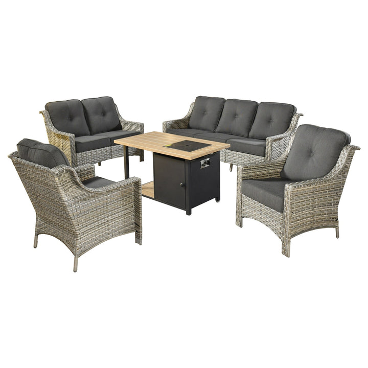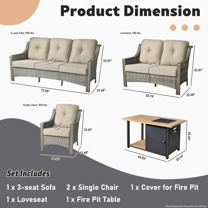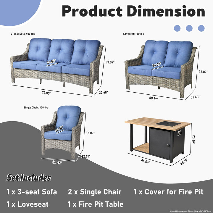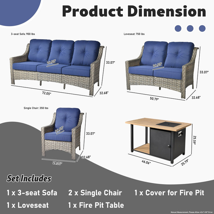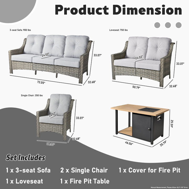 - Comes with 1 3-seat sofa, 1 loveseat, 2 single sofas and a double-layer fire pit table