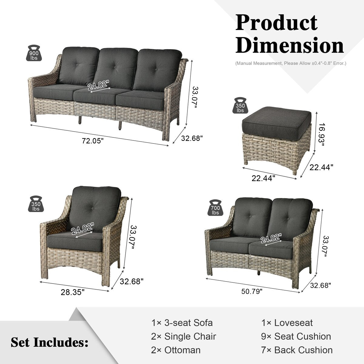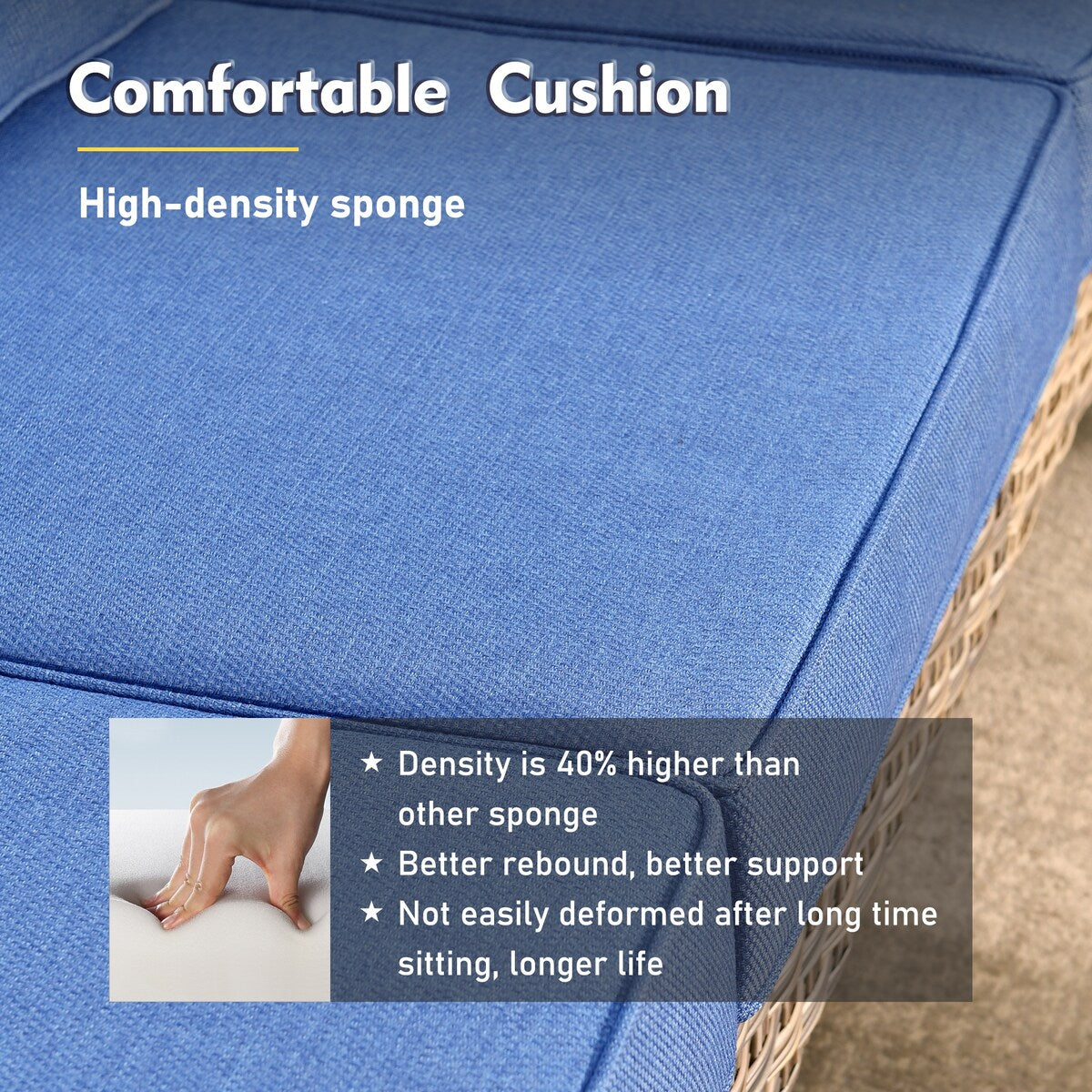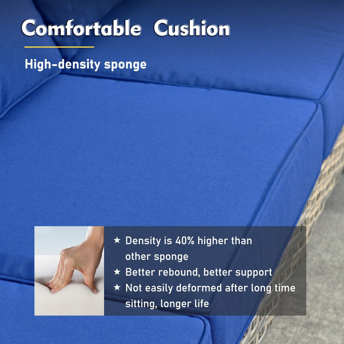 Experience the durability and reliability of this 6-piece patio furniture set. Crafted with premium PE rattan and a sturdy powder-coated steel frame, ensuring years of outdoor enjoyment. Enjoy ultimate comfort with the high-density sponge seat cushions and tufted design fluffy back cushion. High quality yarn-dyed fabric wears well and is thicker, good texture and easy to clean. Ergonomic design chairs with high back and deep seat can support good posture and make you feel more comfortable. Patio furniture conversation sofa set is ideal for outdoor patio, porch, backyard, balcony, poolside, garden, deck and other suitable space in your home.