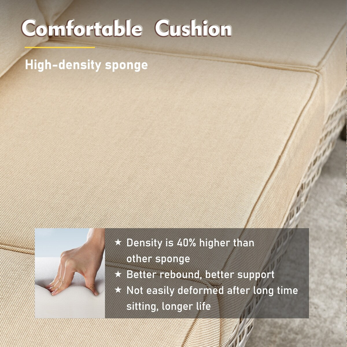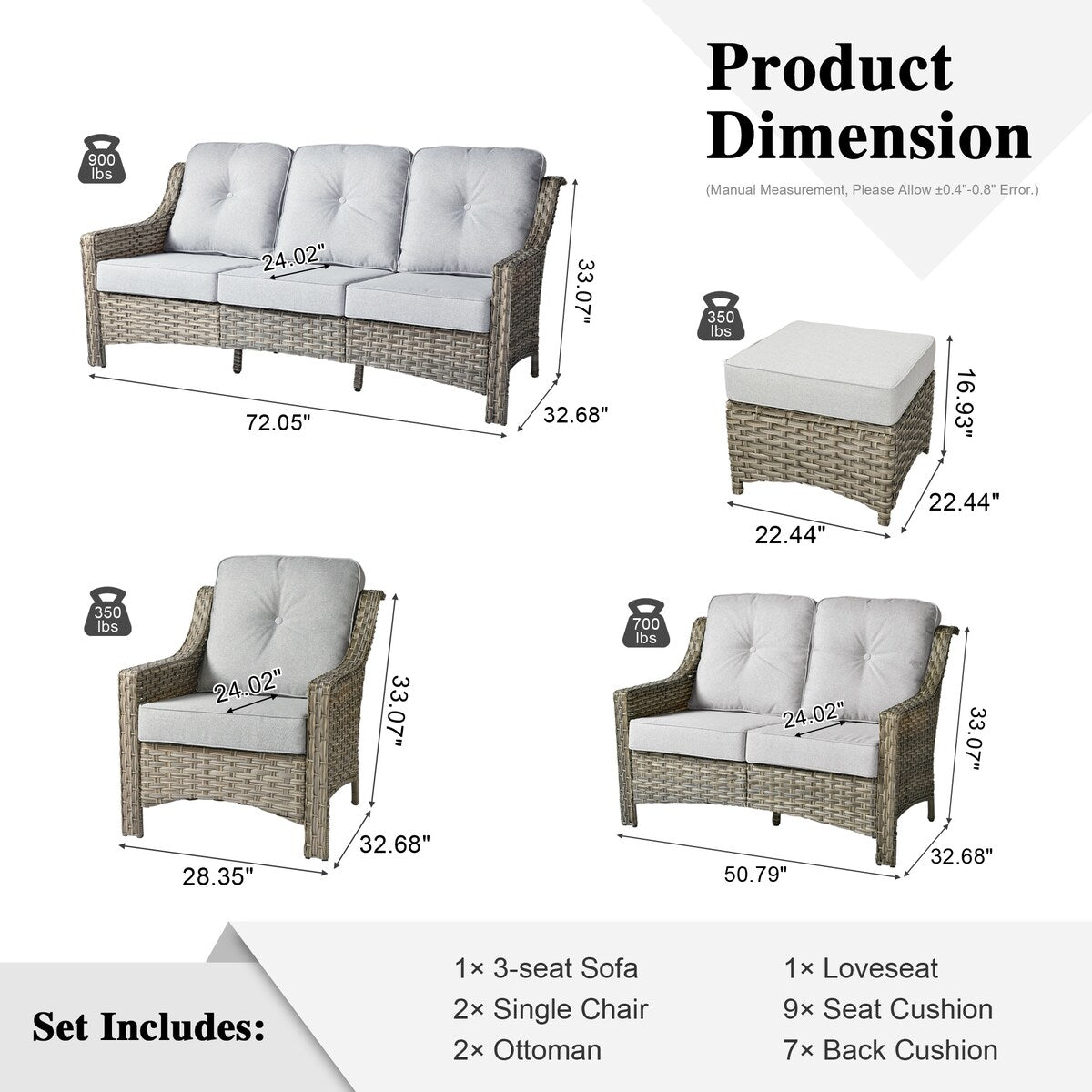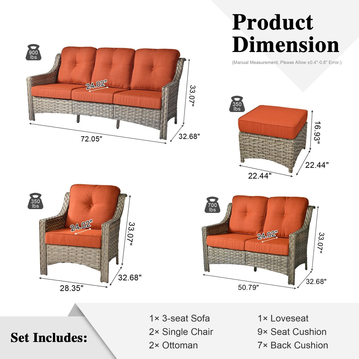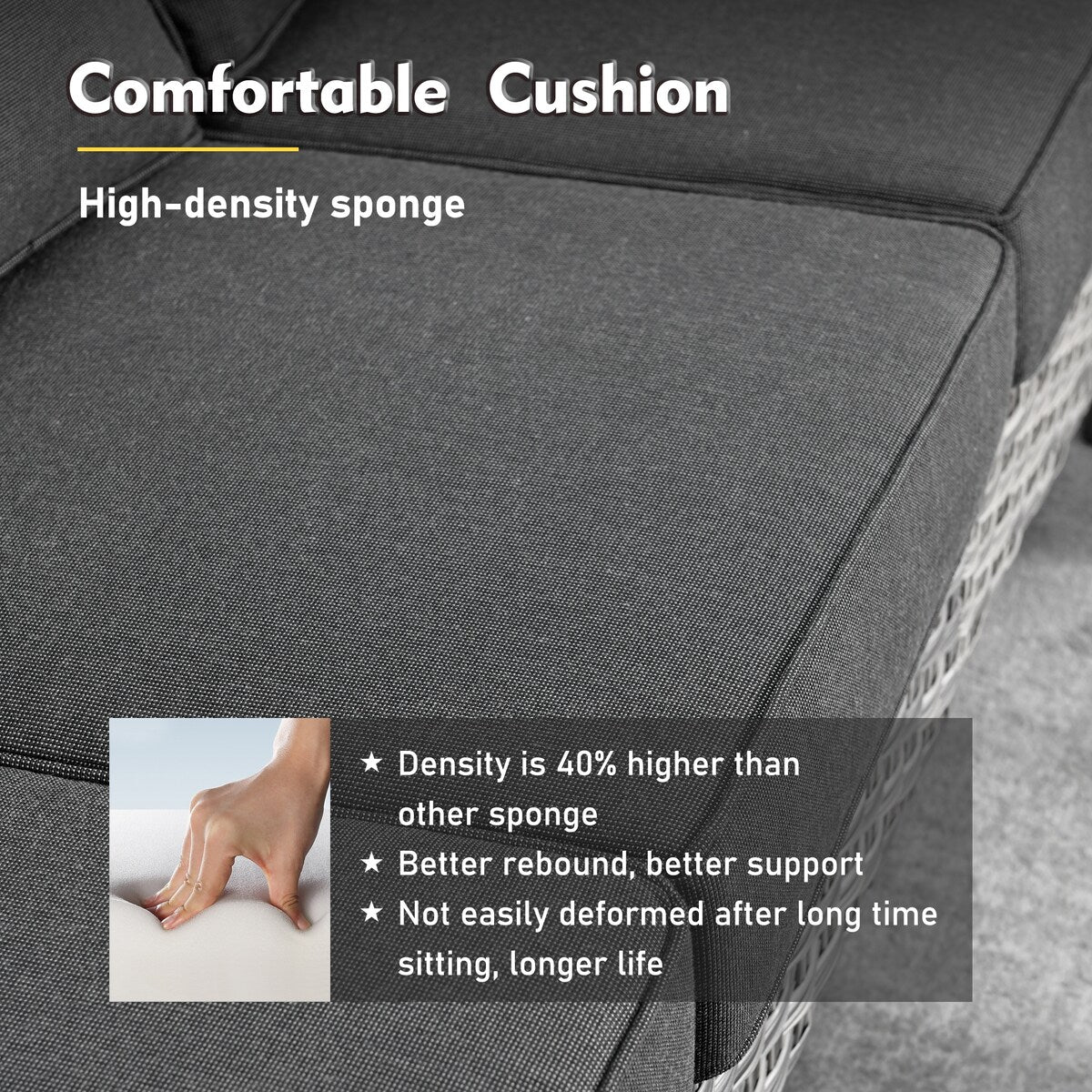 Experience the durability and reliability of this 6-piece patio furniture set. Crafted with premium PE rattan and a sturdy powder-coated steel frame, ensuring years of outdoor enjoyment. Enjoy ultimate comfort with the high-density sponge seat cushions and tufted design fluffy back cushion. High quality yarn-dyed fabric wears well and is thicker, good texture and easy to clean. Ergonomic design chairs with high back and deep seat can support good posture and make you feel more comfortable. Patio furniture conversation sofa set is ideal for outdoor patio, porch, backyard, balcony, poolside, garden, deck and other suitable space in your home.