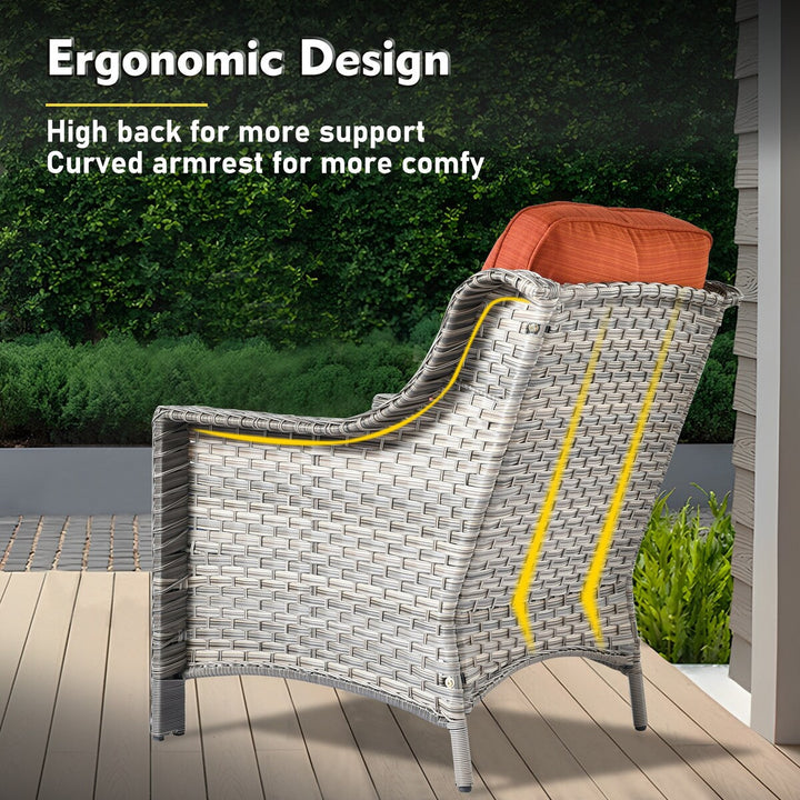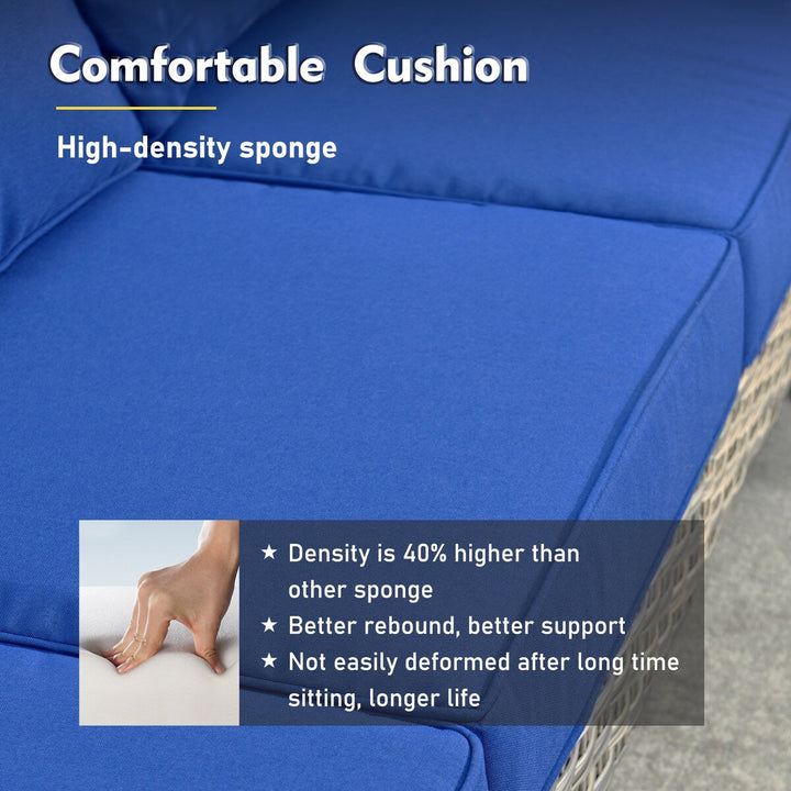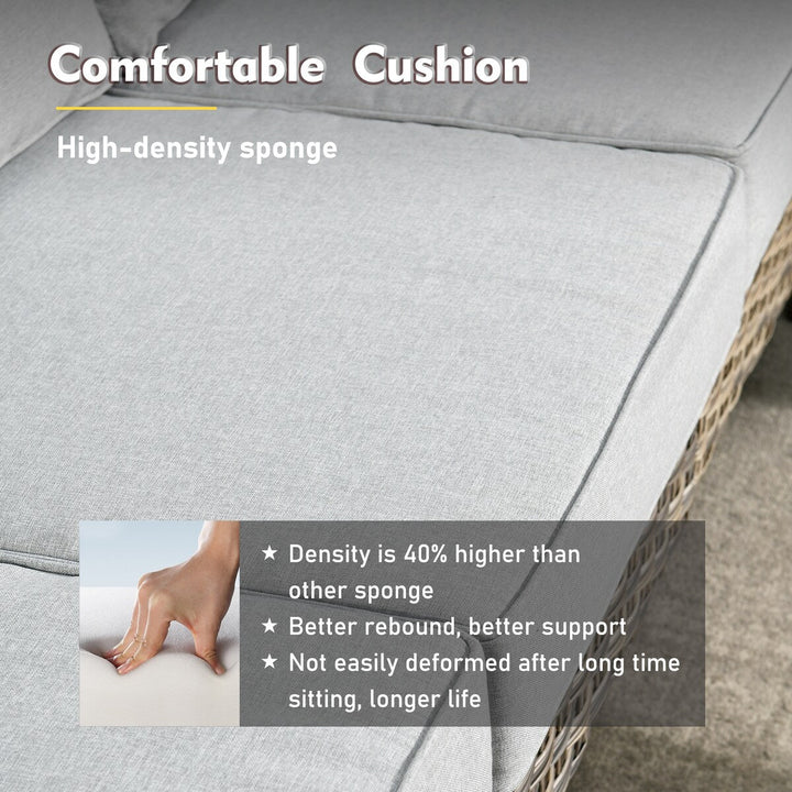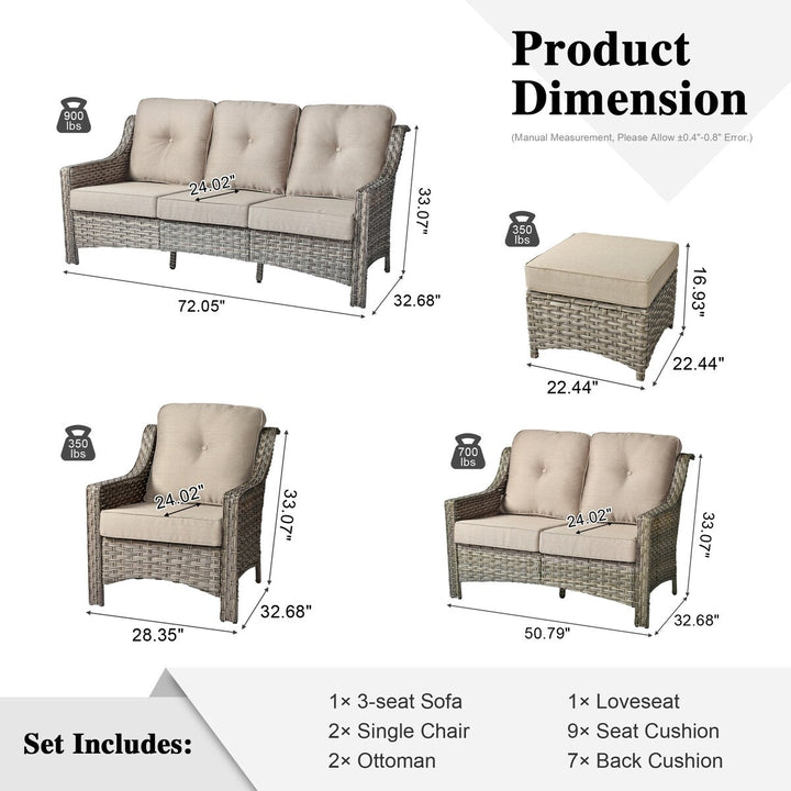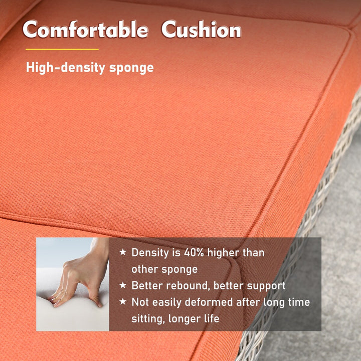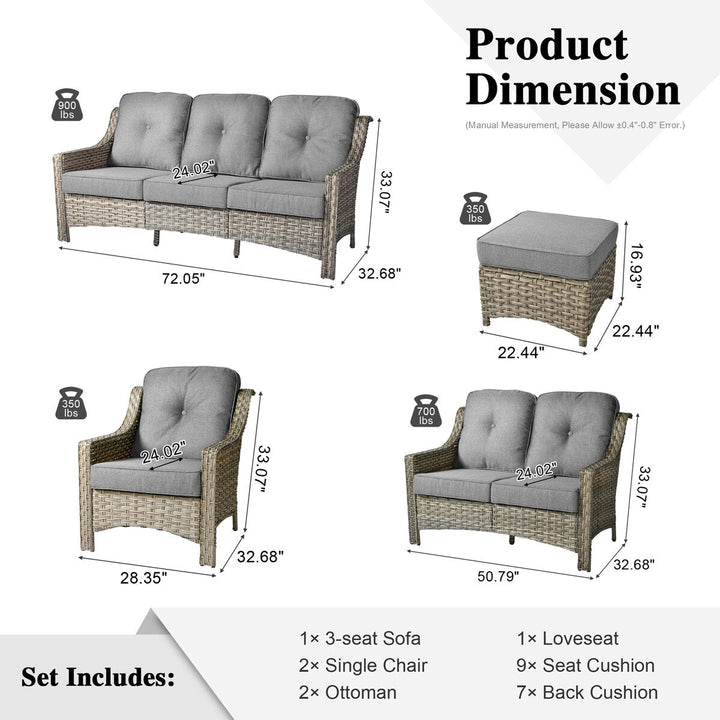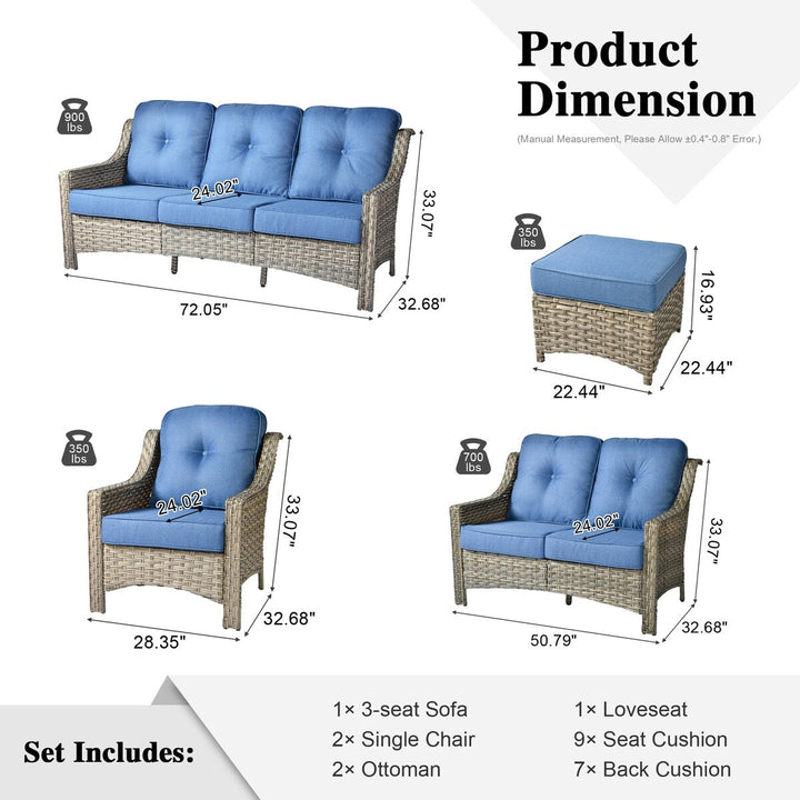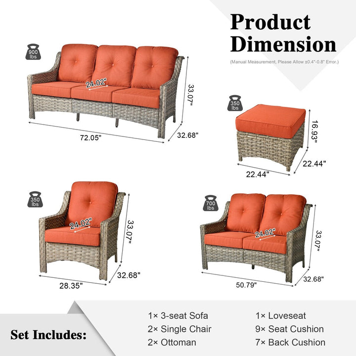 Experience the durability and reliability of this 6-piece patio furniture set. Crafted with premium PE rattan and a sturdy powder-coated steel frame, ensuring years of outdoor enjoyment. Enjoy ultimate comfort with the high-density sponge seat cushions and tufted design fluffy back cushion. High quality yarn-dyed fabric wears well and is thicker, good texture and easy to clean. Ergonomic design chairs with high back and deep seat can support good posture and make you feel more comfortable. Patio furniture conversation sofa set is ideal for outdoor patio, porch, backyard, balcony, poolside, garden, deck and other suitable space in your home.