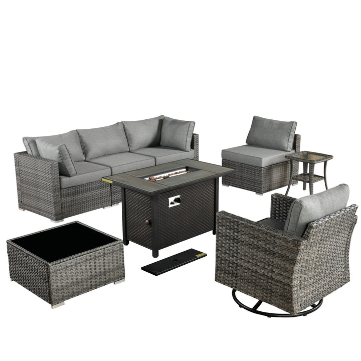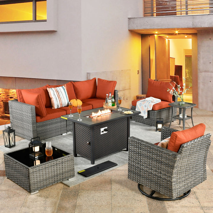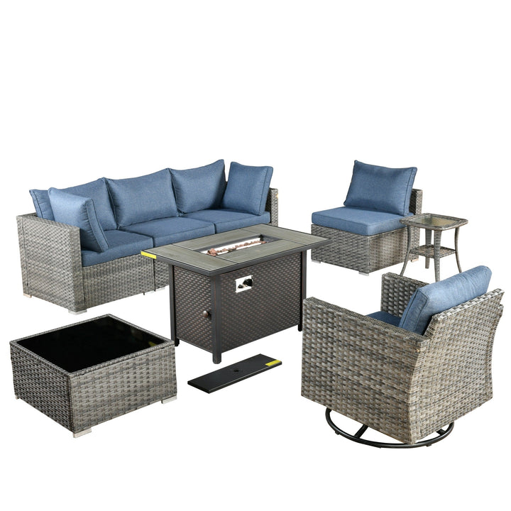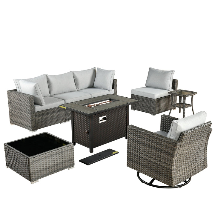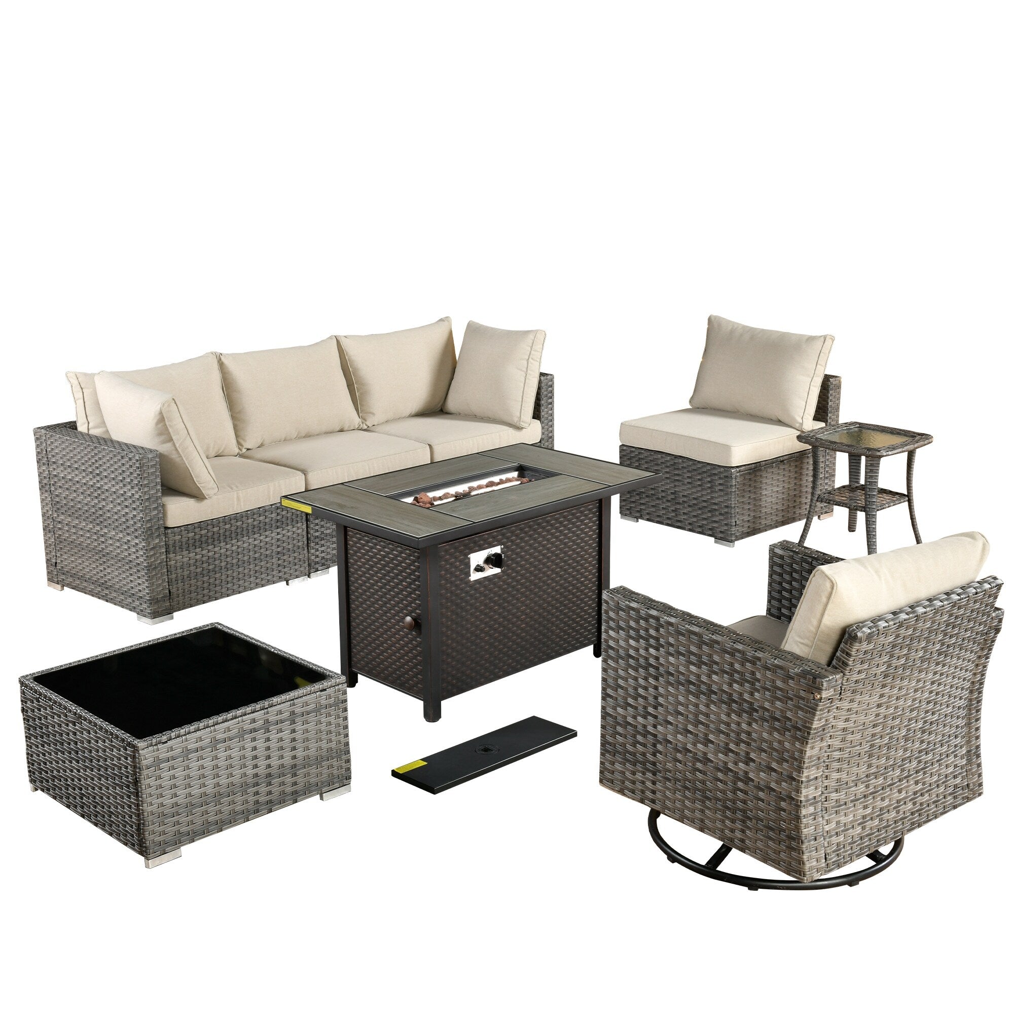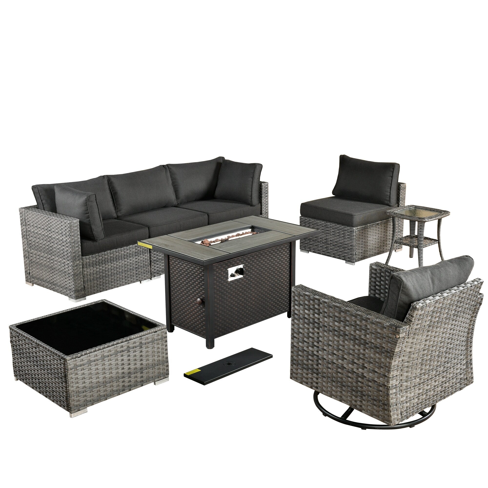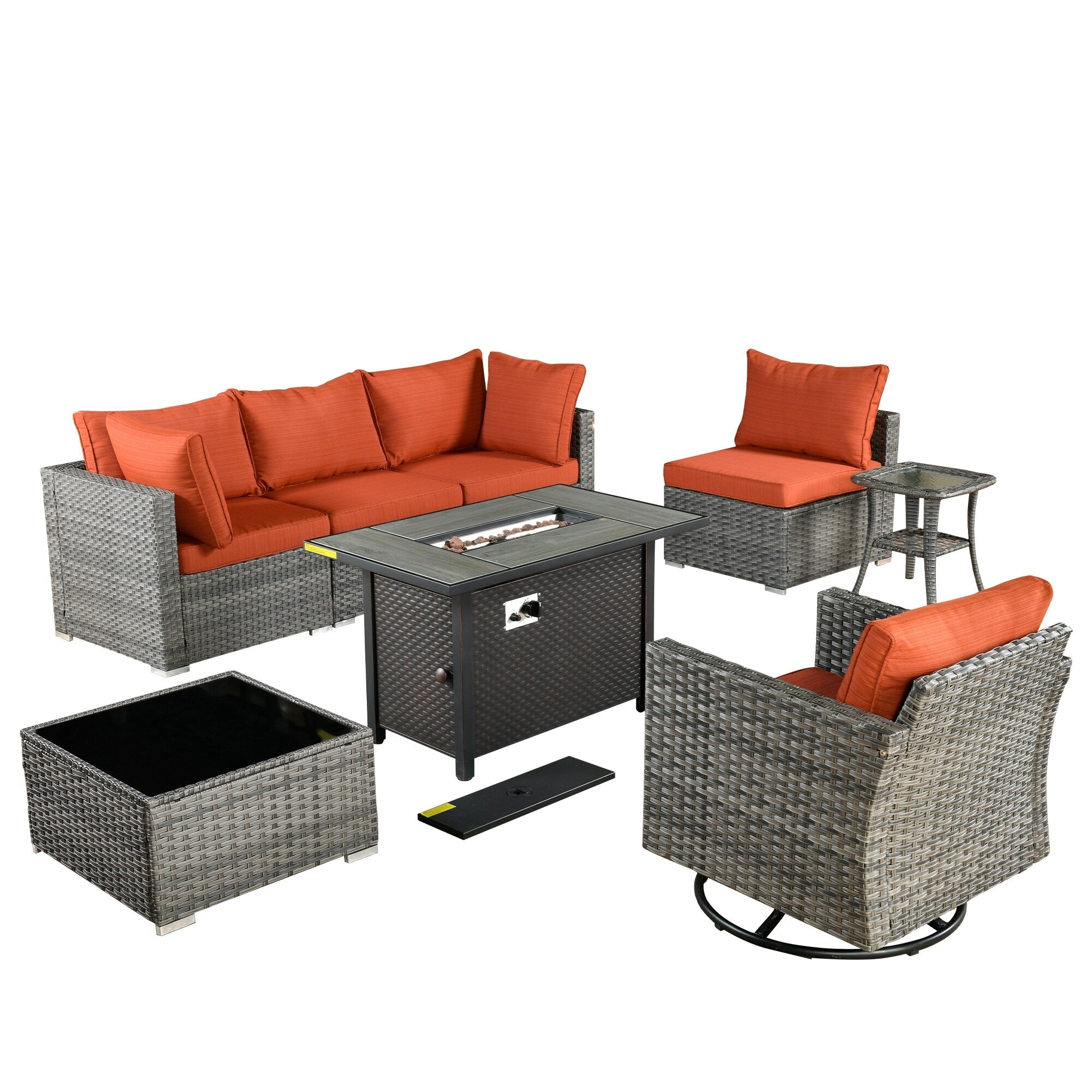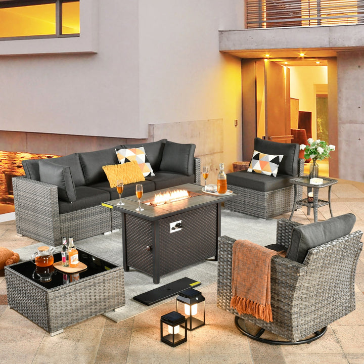 XIZZI 8-piece Patio Outdoor Wicker Furniture Swivel Chair Set with Firepit Table