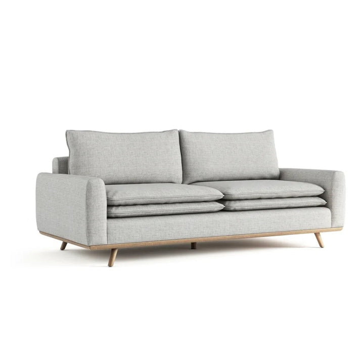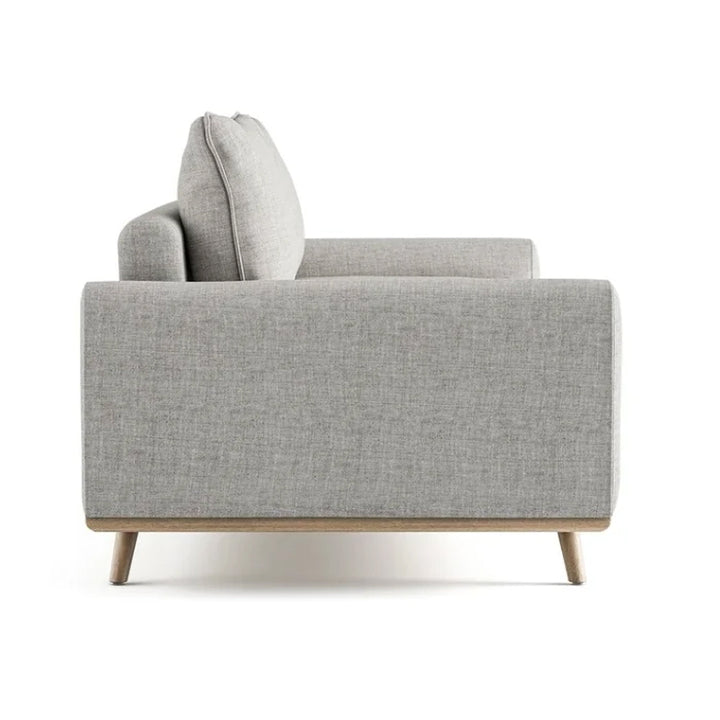 Elevate your space with this mid-century modern sofa, featuring a cotton-linen upholstery in a light gray color. The feather blend back pillow and high-density foam seat cushion provide comfort, while the oak brown solid wood frame and legs ensure durability. Designed for longevity, it boasts a webbing and zigzag spring suspension for support. Check out our Yaana collection for more options.