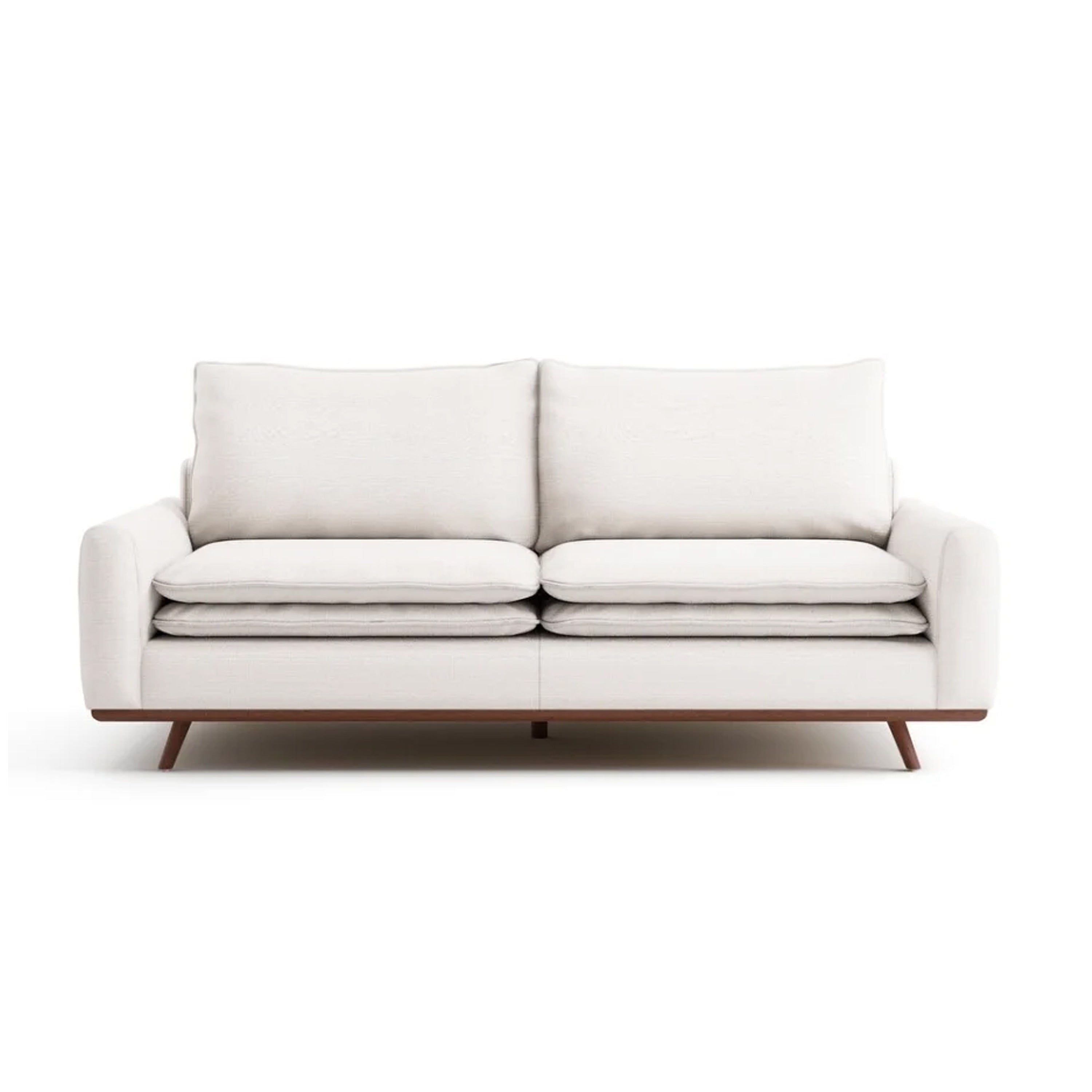 Elevate your space with this mid-century modern sofa, featuring a cotton-linen upholstery in a linen white color. The feather blend back pillow and high-density foam seat cushion provide comfort, while the dark brown solid wood frame and legs ensure durability. Designed for longevity, it boasts a webbing and zigzag spring suspension for support. Check out our Yaana collection for more options.