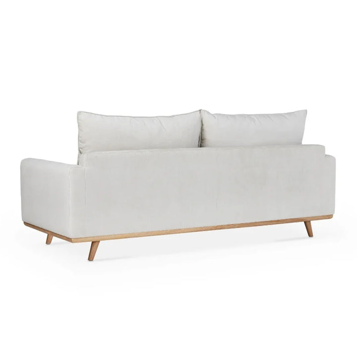 Elevate your space with this mid-century modern sofa, featuring a cotton-linen upholstery in a linen white color. The feather blend back pillow and high-density foam seat cushion provide comfort, while the oak brown solid wood frame and legs ensure durability. Designed for longevity, it boasts a webbing and zigzag spring suspension for support. Check out our Yaana collection for more options.