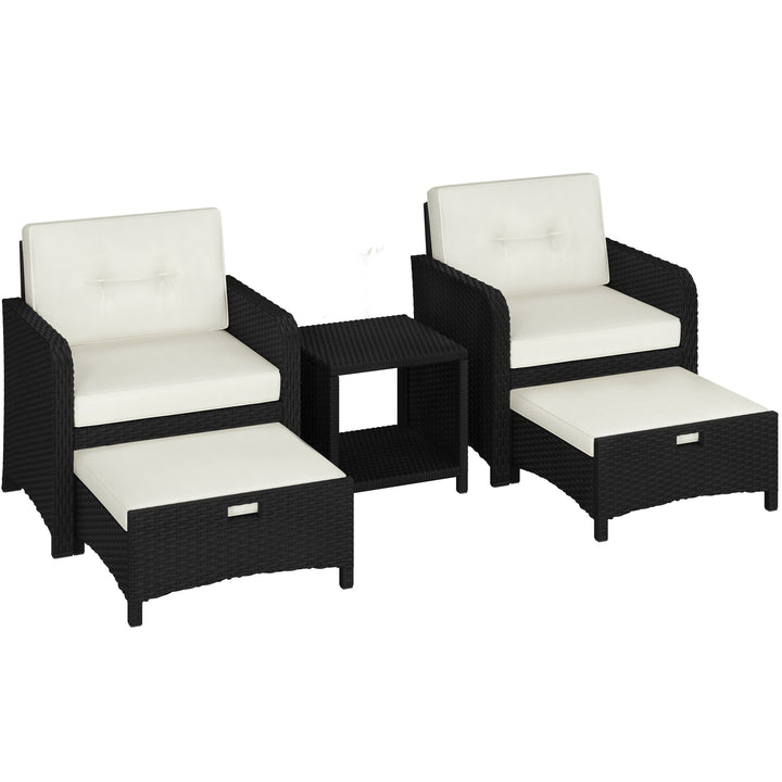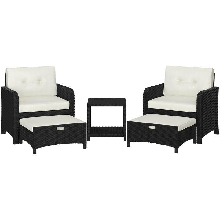 This five-piece ?rattan furniture set is designed for ultimate outdoor relaxation. It ?includes a side table, two chairs, two ottomans, and thick, comfortable ?cushions and pillows for optimal support. The stylish rattan table ?features a convenient shelf, suitable for keeping snacks and drinks ?close by. With curved armrests and plush cushions, the chairs offer ?exceptional comfort, making them ideal for lounging in your garden or ?backyard. The ottomans can be tucked under the chairs when not in use, ?saving space. Made from lightweight, weather-resistant PE plastic, this ?set is easy to move and rearrange to suit any outdoor layout. With ?durable construction and easy-to-clean cushions and pillows, this set is ?built to last through all seasons while adding a touch of elegance to ?your outdoor space.