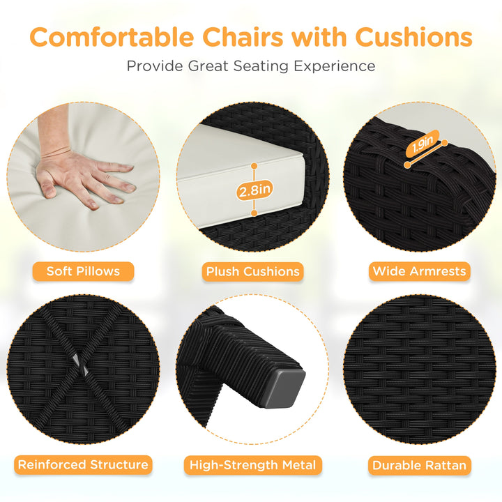 - Comfortable Chairs: The rattan ?armchairs feature curved armrests, soft pillows, and cushions. Paired ?with the ottomans, this furniture set provides ultimate comfort for ?lounging in your garden or backyard