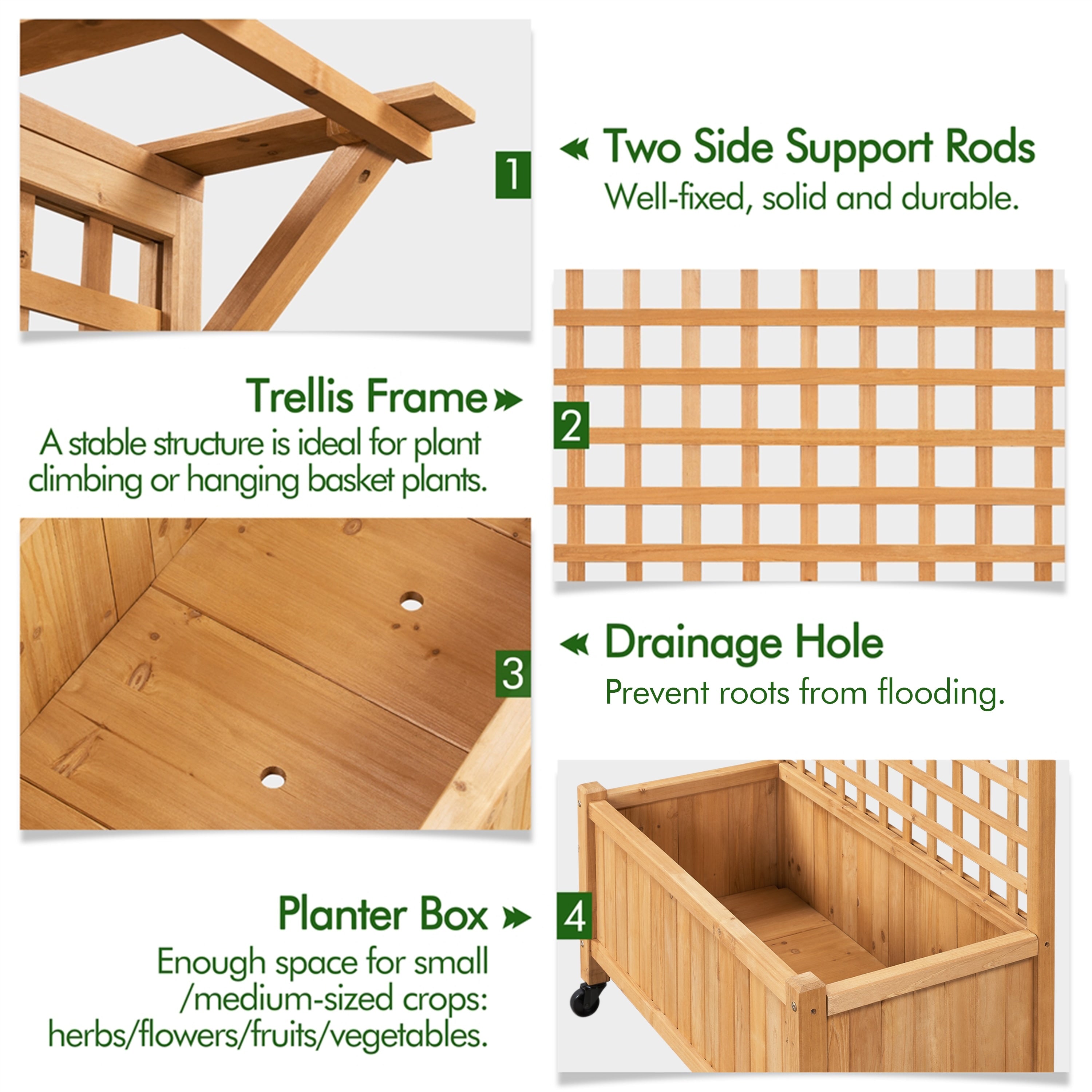 This raised garden bed is used for climbing vines and will turn any corner into a bright and lively space.100% fir wood for a smoother, neater look that adds artistic charm to your home. Perfect for all kinds of plants anywhere - gardens, greenhouses, yards, turn your space green. For proper watering, the drainage system is designed at the bottom. Also, feel free to put knickknacks like keyrings and photos on the trellis. A planter box with trellis is more than just a way to support vertical-growing plants; it can make your décor look stylish and impressive.